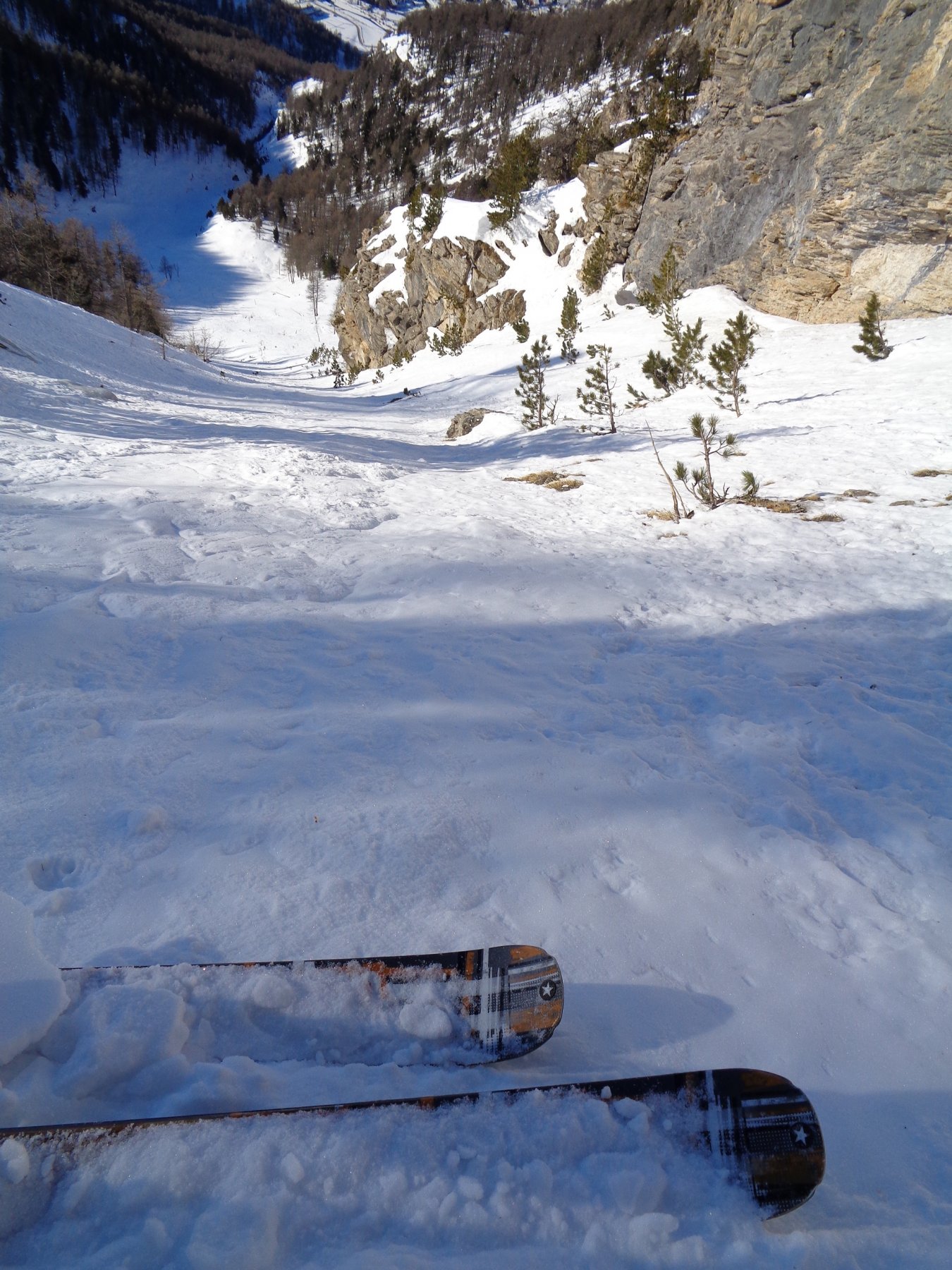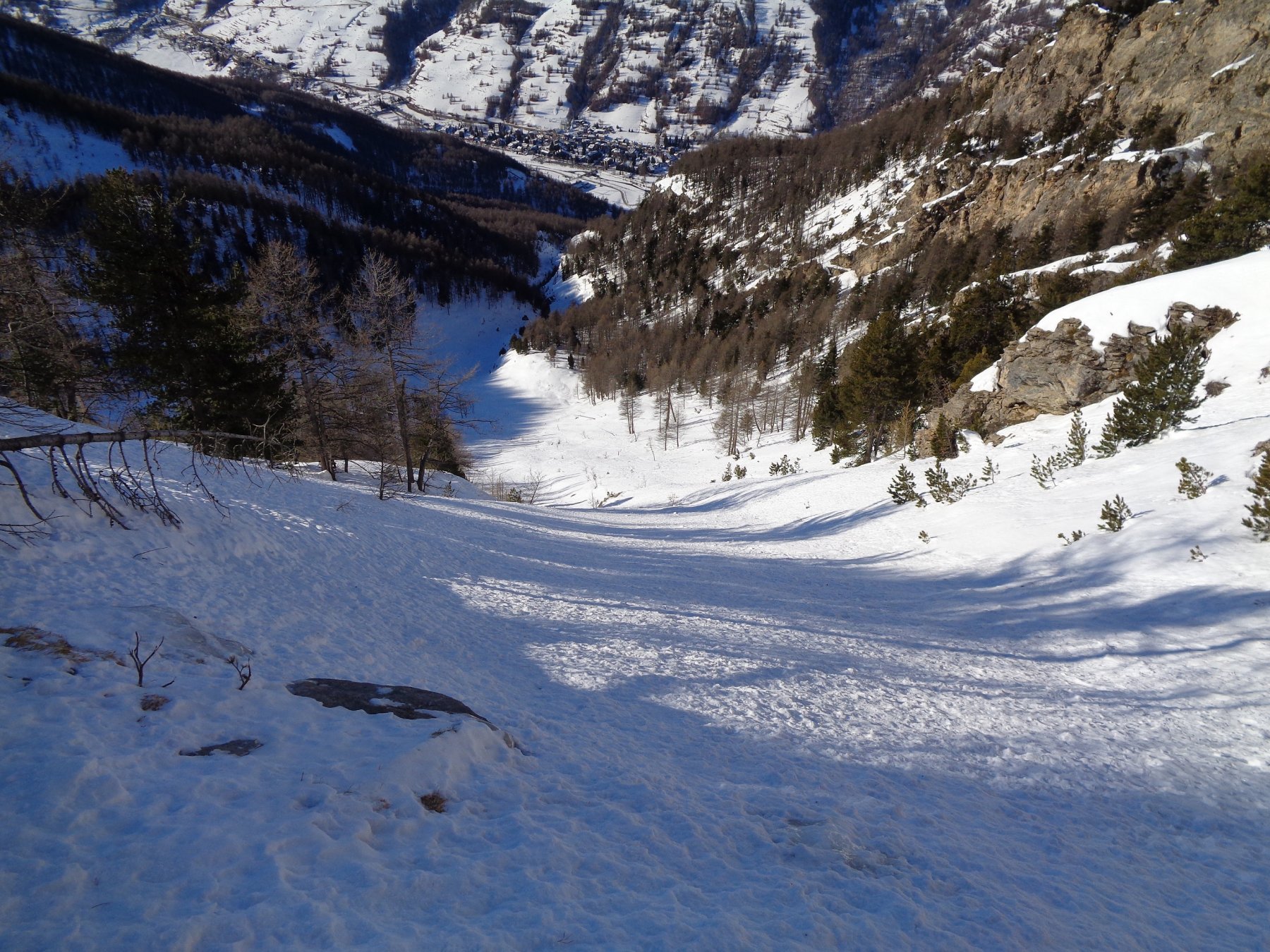 Dal colletto tra cima e anticima entrare sulla sx nel canale (attenzione alle frequenti placche a vento). Scendere il primo tratto piuttosto sostenuto spostandosi via via verso dx fino a trovarsi a picco al di sopra del pianoro alla base del canale. Scendere i 350m di canale evitando gli eventuali risalti di ghiaccio (in genere 2-3) spostandosi brevemente ai lati del canale. Una volta percorsa la bella conoide si torna alla gorgia percorsa all’andata e di lì si scende verso gr. Jacques e la fraz. di Soucheres Hautes.