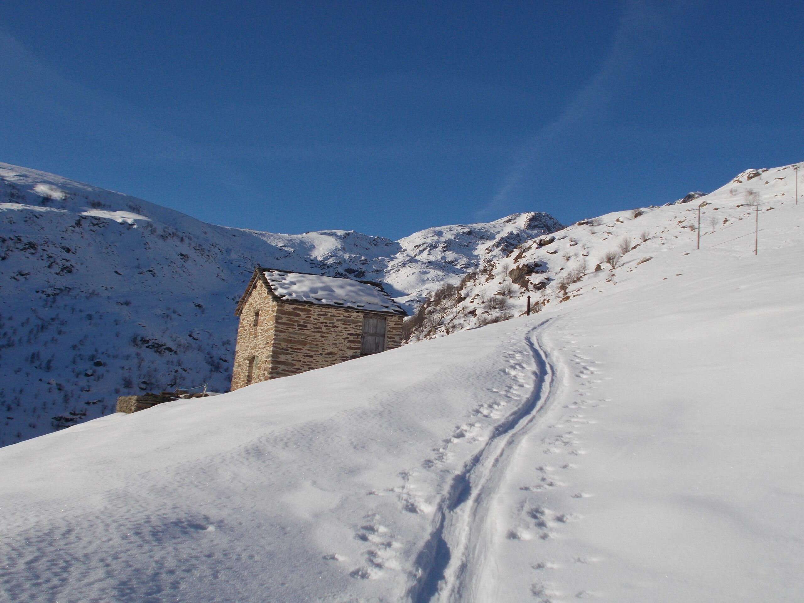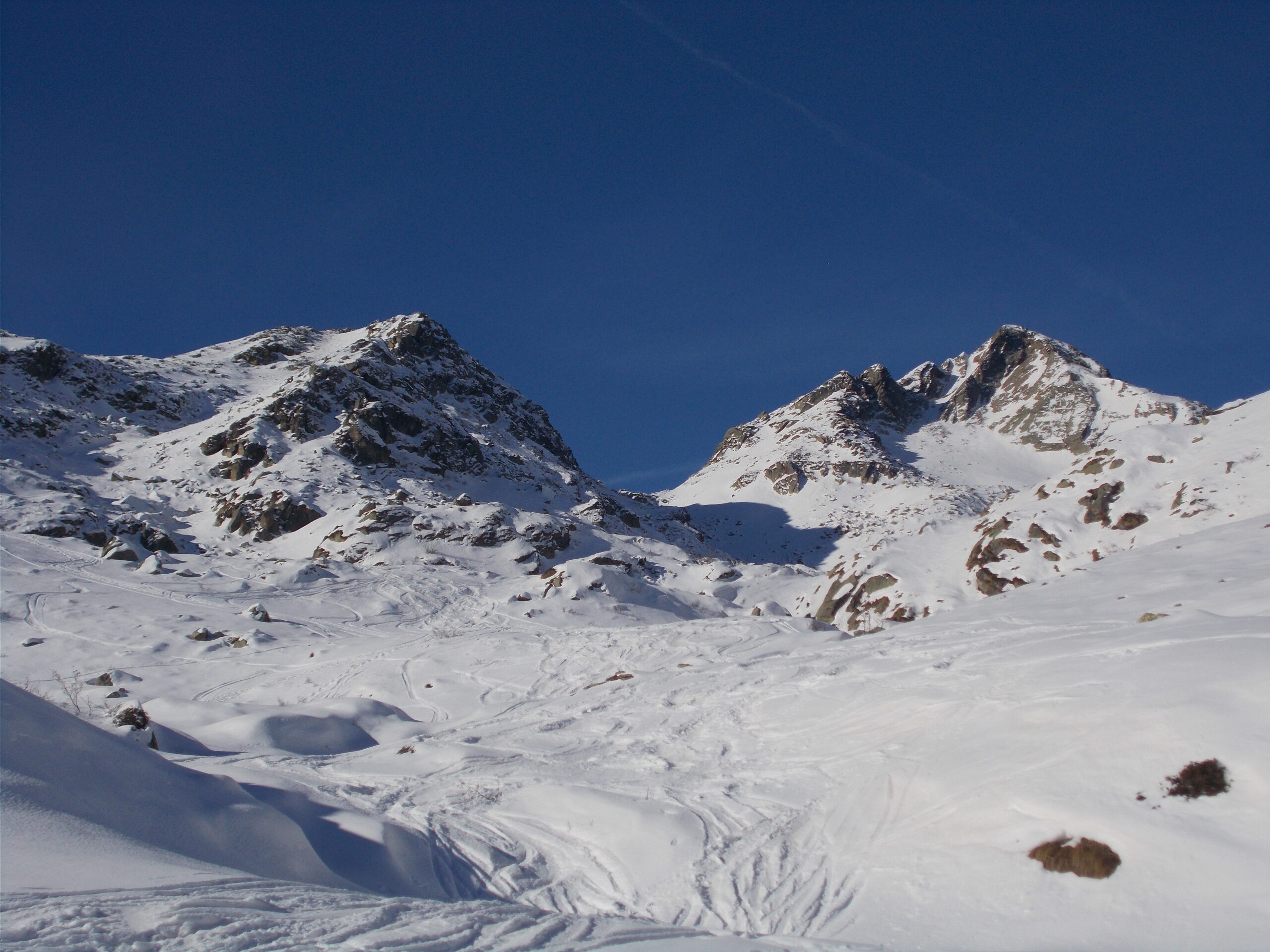 Partenza possibile dal park lato ex impianti Palit, ormai abbandonati del tutto a creare uno scenario molto triste da vedere con i propri occhi. Peggio le cose si mettono col procedere in salita verso la meta, dove la neve muta ogni momento in peggio, fino a diventare un campo arato semigelato, crosta non portante, sastrugi parziali spazi con farina alternati ad altri con crosta infame, quella che ti tira dentro se non in possesso di una buona tecnica ma sopratutto di un buon controllo del mezzo. Terreno comunque per gran parte accidentato, che con un po’ di spessore in piu’ di neve avrebbe assunto un aspetto oltre che piu consono per la stagione anche piu’ piacevole a livello di sciata. Appagante quest’ultima, solo per brevi tratti nella parte mediana del tracciato., dove c’e’ anche parecchio da spingere. Insomma una gita a mio avvivo per certo inadatta ai discesisti puri.