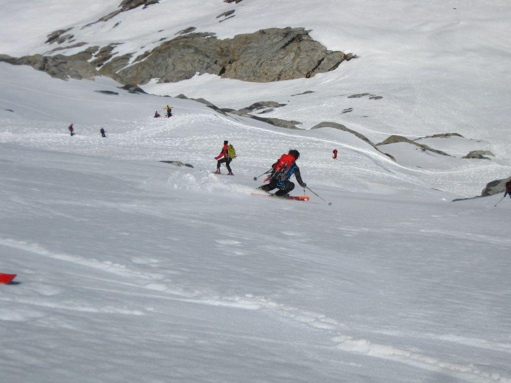 Gli sci si mettono all’imbocco del vallone glaciale a 30 min dal Rif. Vittorio Emanuele. In discesa invece sfruttando il canale adiacente al rifugio si arriva praticamente a 5 min dallo stesso. Partiti alle 4:15, abbiamo cominciato a scendere intorno alle 10. Portati gli sci in vetta, molto bella la prima parte della pala, poi sciata superlativa con firn DOP che ha meritato una ripellata nella parte centrale. Causa caldo non so se si riuscirà a sciare ancora il canale nei prossimi giorni, ma se il rigelo è buono il Gran Paradiso non tradirà le aspettative. Grande affollamento di alpinisti, ma con gli sci solo altri 4 oltre a noi, eppure la montagna era nelle sue condizioni migliori