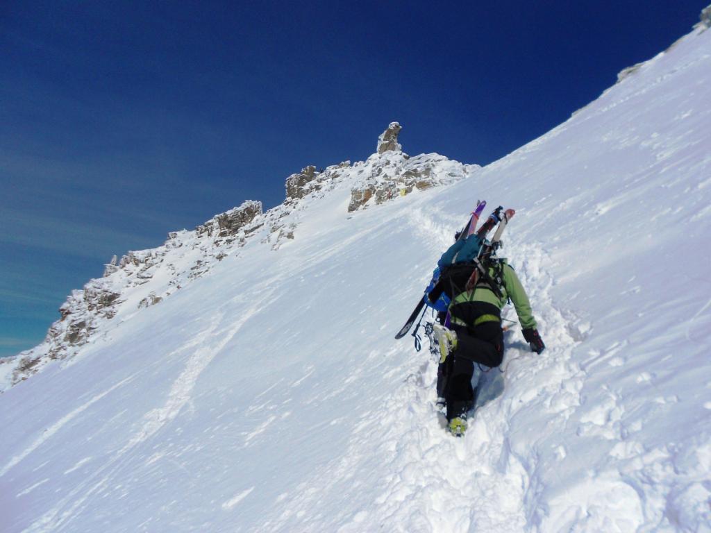 In discesa neve nel complesso buona ma molto variabile (asciutta, crosta da vento, leggera crosta…) fino al vallone che conduce al rifugio dove è invece già abbastanza trasformata.