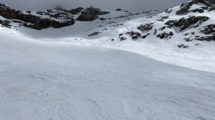 Dal Vittorio al deposito sci al colletto.Freddo sicuramente siberiano ma assenza di vento perché il vallone è riparato, neve molto dura ovviamente ma non crosta ne’ sastrugi ma insperatamente dalla schiena d’asino in giù molta neve fresca riportata dal vento ed anche caduta probabilmente ieri ha reso alcuni tratti veramente bellissimi con tratti 4 stelle ;prestare molta attenzione alla discesa sotto il Vittorio perché in queste condizioni è una lastra ghiacciata, che va finire su salti di roccia. La neve non molla anche al pomeriggio tardi. Qualcuno ha sceso il canale diretto nel torrente ora al limite ma molti come me hanno preferito mettere sci a spalle alla fine del tratto ripido sopra il bosco nell’ultimo traverso e fare il sentiero.
