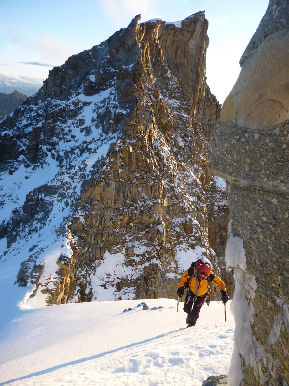 Partiti alle 3.30 dal rifugio in cima alle 11.30. Salita al colle di Montandayne agevole fino alla terminale poi leggera crosta di rigelo con ghiaccio sotto che metteva gia alla prova le gambe e la concentrazione,noi avevamo una picca classica e una da piolet. Dal colle parte questa bella cavalcata toccando le varie punte gia citate.Noi benche armati di friend non abbiamo usato materiale ma lo consiglio comunque. Le doppie che c’erano da fare le abbiamo fatte. Purtroppo a due terzi della cresta siamo stati avvolti nella nebbia facendo aumentare il livello di attenzione anche perche non manca il vuoto su tutti e due i versanti e la ricerca dell’itinerario non è sempre cosi scontata.Un saluto alla coppia di francesi che ci precedeva e agli olandesi che ci hanno fotografato mentre uscivano dalla Nord, posto che conoscevo e che mi ha fatto ricordare che mancava poco. Nebbia fitta alla Madonnina e in discesa con spruzzata di nevischio per non farci nmancare niente. Anche se banale direi attenzione anche nella discesa…”beccata” la traccia per lo Chabod in un momento che si è alzata la nebbia e zona crepacci che richiede corda tesa.Traversata alpinistica, bella e consigliata ma come è stato scritto giustamente “da non sottovalutare”.In compagnia di Elisa, amica e non più provetta alpinista che mi ha proposto quest’itinerario.