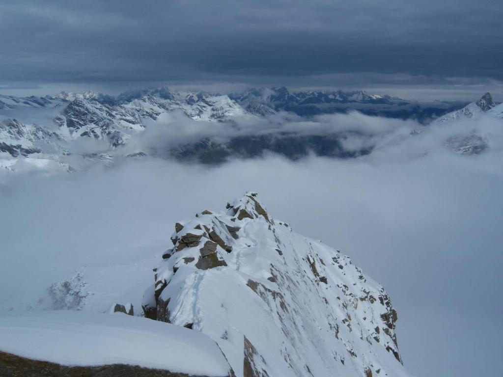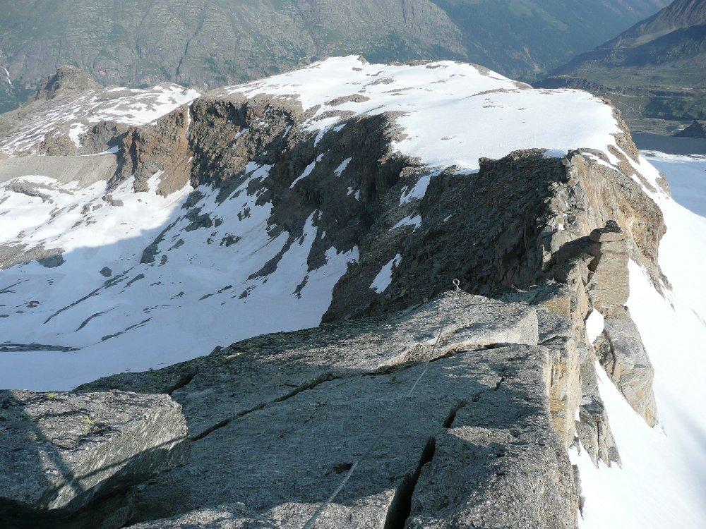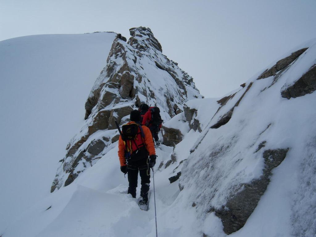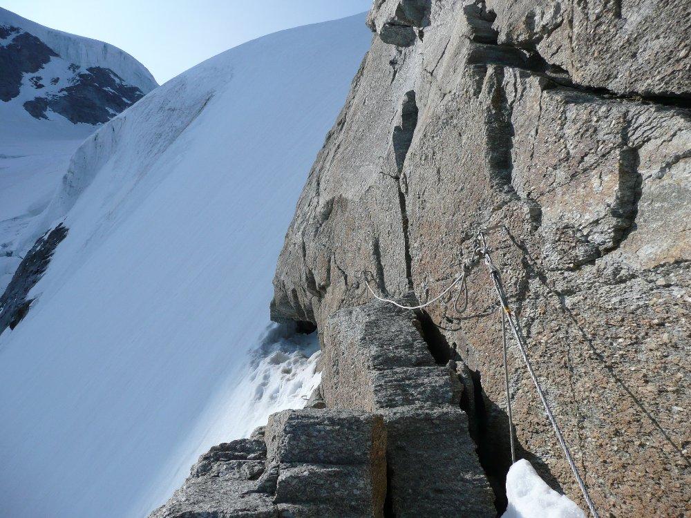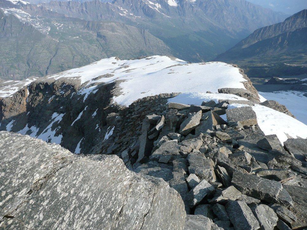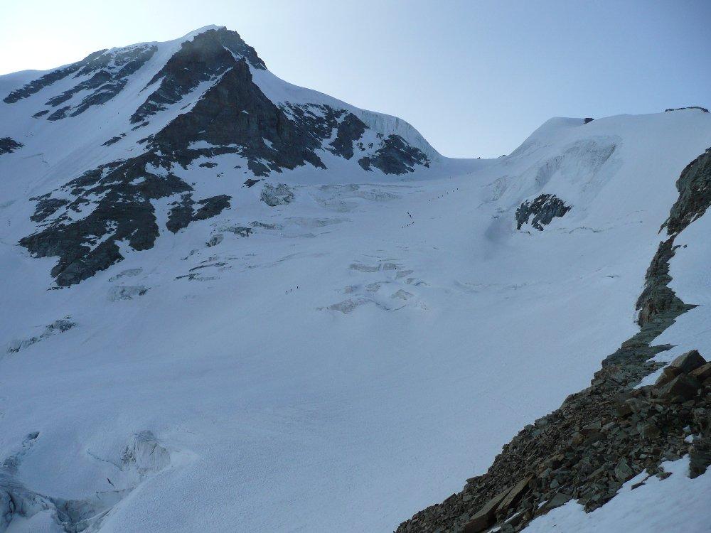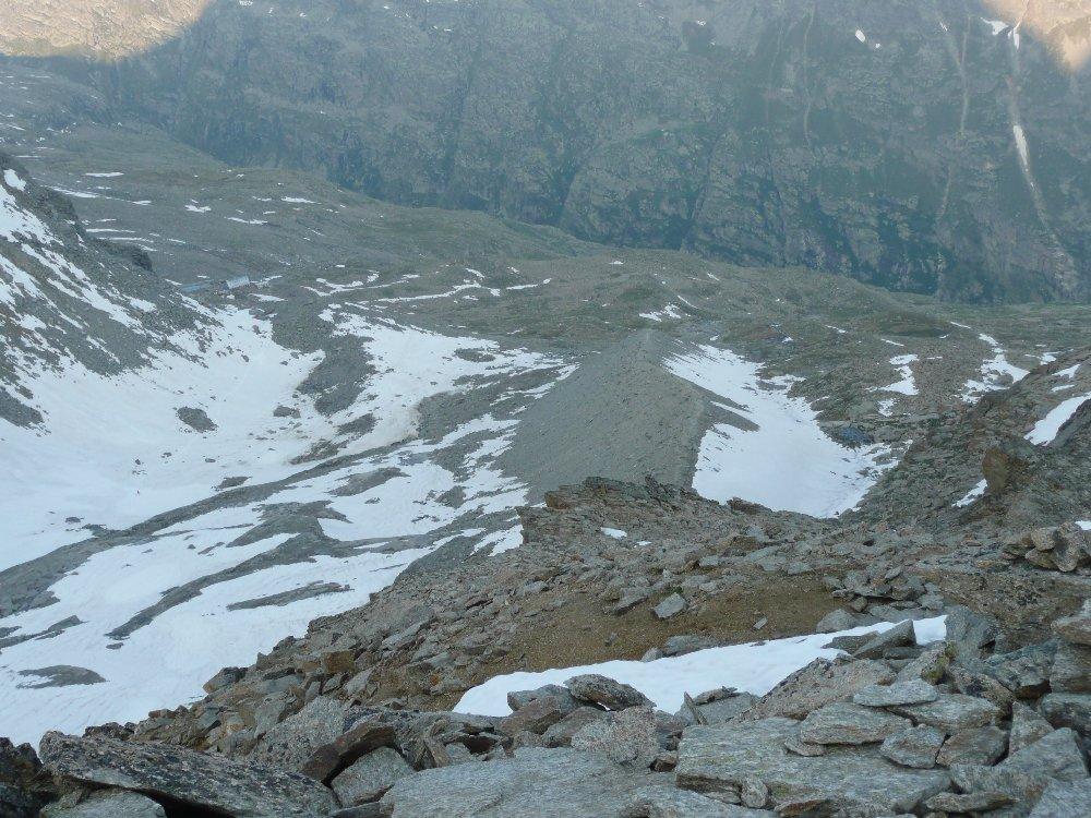 Alla destra di essa vi è un facile passaggio che permette di superare il breve salto per arrivare pochi metri più in alto dove si deve percorrere un lungo tratto di rocce rotte, ben segnalato da tracce e numerosi ometti fino a quota 3300 m. circa.