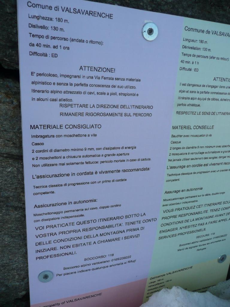 Dove la dorsale si restringe e la neve lascia il posto a stretti affioramenti rocciosi ha inizio la via ferrata, segnalata da apposito cartello indicatore multilingue.