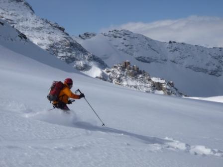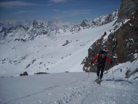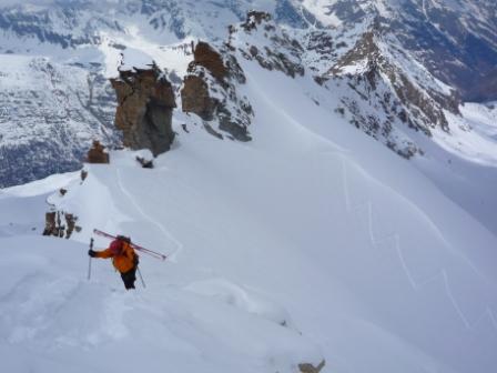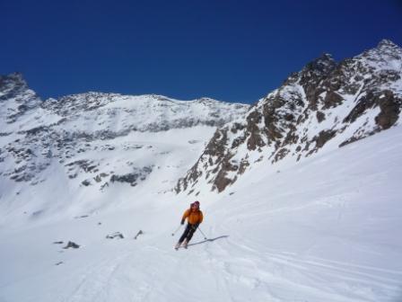ancora bel tempo, discesa in valeille con firn stupendo sotto i 2800 m, sopra non ancora del tutto trasformata; portati gli sci per 10 min fino a Lillaz
