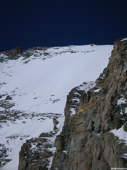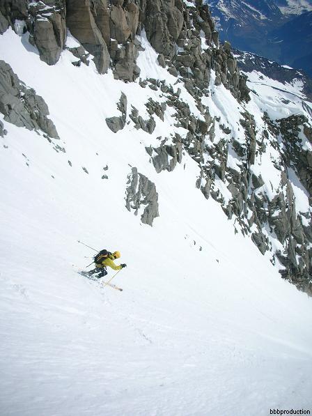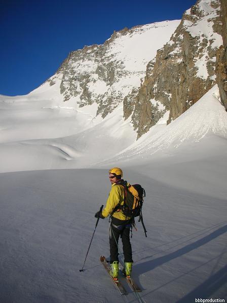 Il tempo maffo ed instabile non ci ha dato fiducia per salire al bivacco, così si è deciso di passare dal Colle di Montandaynè (molto bella poi la sciata del suo versante N, v.rel). Ambiente Tribolazione, parete solare molto estetica in top (quanto effimere) condizioni con 5-15cm di farinetta calda su neve trasformata grippante. La terminale è molto alta ed aperta, l’abbiamo passata centralmente sul culmine del cono di deiezione che raccoglie tutto quello che scende dalla parete. Scesi verso le 9.00, vento freddo in cresta, temperatura ottima in parete, quindi proseguito il viaggio a ritroso per il Colle di Montandaynè e scesa la sua estetica parete N. Un saluto a Enzo, Giorgio, Dario e Mauro incontrati allo Chabod. Grazie anche a Jean-Baptiste e Clement per le info.