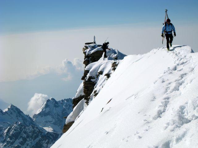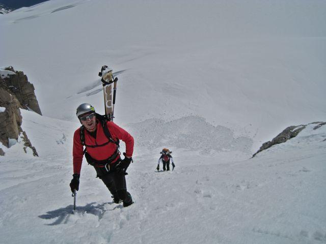 Breve passaggio molto esposto per la cima vera e propria del GRANPA e cresta quasi in piano con ottima traccia fino a dove è evidente che si calzano gli sci e… dopo un bel respiro si parte. Pend sui 45 con tratti a 50 e neve molle, facilissima. Si arriva giù, dopo 300 che si ha preso confidenza (vietato cadere) e… è ora di risalire. E qui inizia il patimento perché la neve molle è faticosissima. Adesso è tutta tracciata, se qualcuno vuole approfittarne…una picca è sufficiente ma con due si va anche bene.