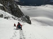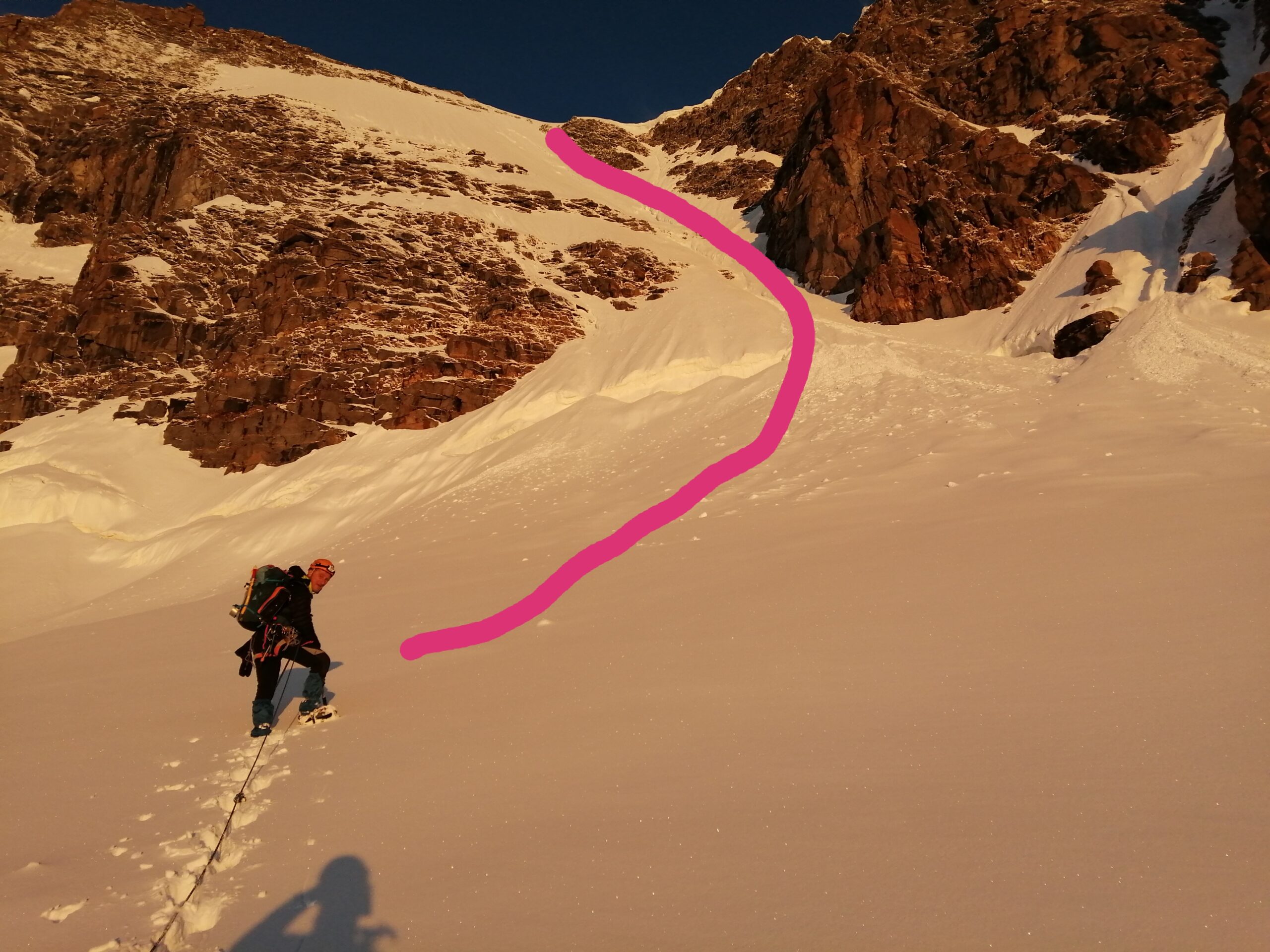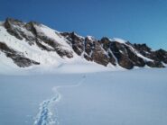 Si sale la parete dapprima sulla sinistra (tratti fino a 50°) e poi spostandosi verso sinistra per evitare le cornici che incombono dalla cresta. In uscita le pendenze si fanno più lievi, ma la neve peggiora per l’esposizione ad est.