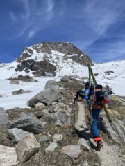 Dormito al Vittorio Emanuele II. Dopo la prima rampetta ci siamo tenuti sulla dorsale sx salendo rispetto alla normale, dal colletto si attraversa per andare a recuperare l’ attacco della parete (si perdono qualche decina di metri). Numeroso cordate davanti a noi, all’isolotto c’è qualche metro di ghiaccio (una vite) poi ottima traccia da ribattere un po’. In discesa abbiamo sfruttato una abalakov dei giorni precedenti per una breve doppia nel tratto ghiacciato, poi neve continua. Ad si scende sci ai piedi fino a quota 2400 ca.