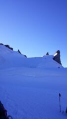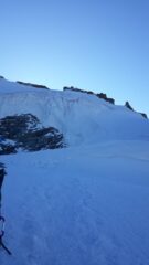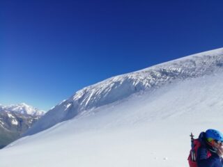 Salite ieri al rifugio.Traccia ottima, affiora del ghiaccio nello spallone finale.Schiena d’asino bella dritta.C’è ancora neve per salire in vetta.Stamani un bel vento freddo ci ha accompagnate e la neve sulla traccia ha tenuto benone.Terminale ancora chiusa.