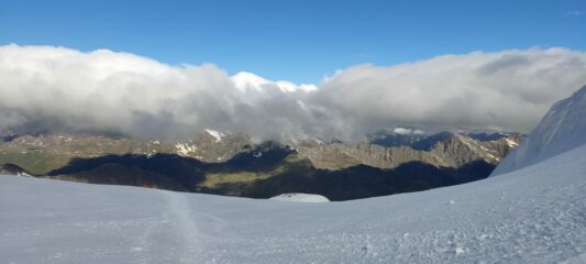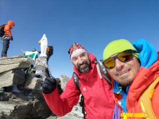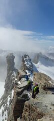 Condizioni buone della via, neve portante (a condizione di non scendere troppo tardi), la crepacciata terminale si passa senza problemi. Meteo tendenzialmente nebbioso, eccetto per uno squarcio in vetta che ci ha concesso il bello e notevole panorama.