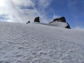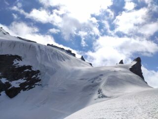 Partite direttamente da Pont Valsavaranche. La pioggia ci ha fatto fermate al rifugio e poi siamo ripartite. Nevai bassi striminziti, ma si passa benissimo a sx nelle bancate rocciose, seguire gli ometti. Traccia ottima e niente ghiaccio. Alla schiena d’asino fa un lungo traverso e al calottone è ottima. Terminale chiusa e buona traccia per andata e ritorno alla Madonnina.