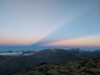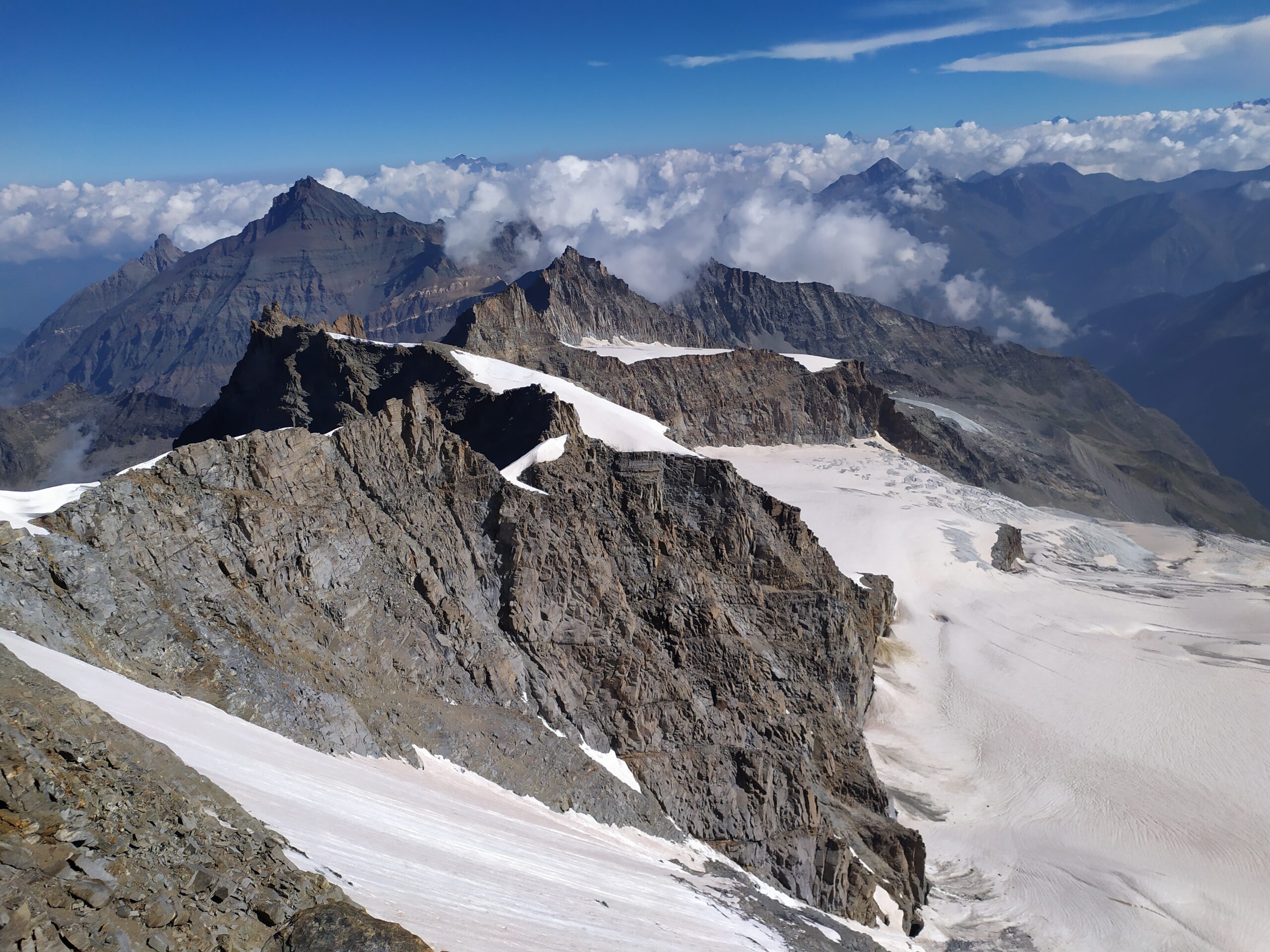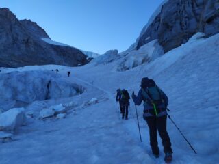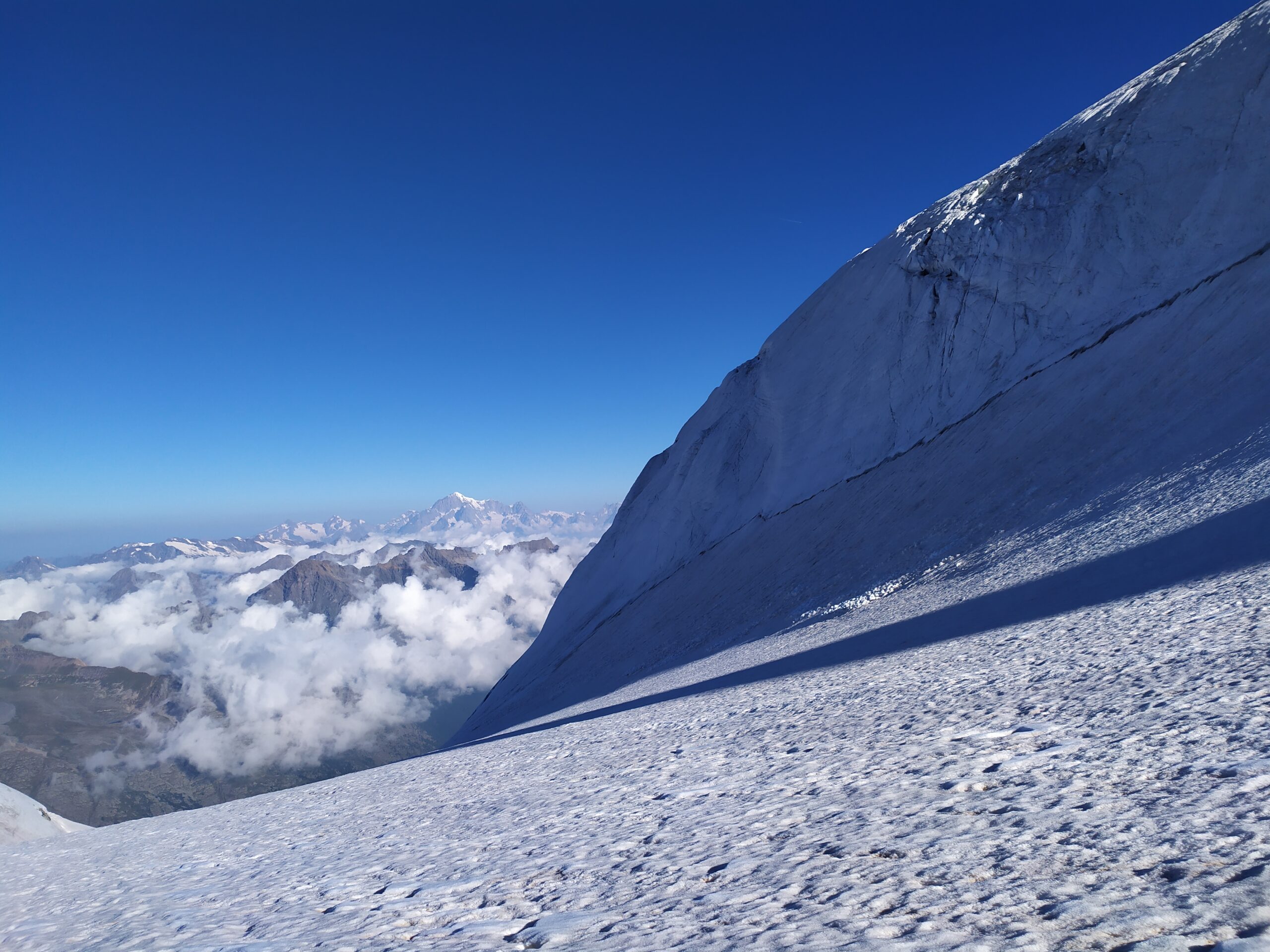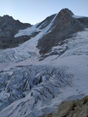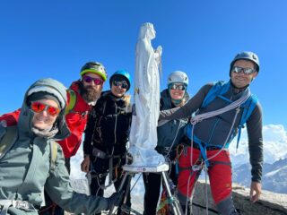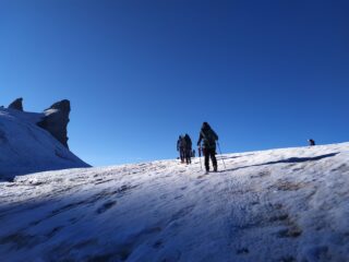 Per la descrizione completa fare riferimento alla scheda principale. Abbiamo seguito sia per l’andata che per il ritorno l’itinerario per il ghiacciaio di Laveciau, più battuto rispetto alla vecchia via normale, oltre a essere in condizioni migliori. Ad ogni modo sulla Schiena d’Asino all’altezza della Becca di Montcorvè, come descritto in relazione, i due itinerari (tre compresa la via ferrata) si uniscono. Crepacce chiuse su tutto il ghiacciaio, compresa la terminale. Nessuna difficoltà nel superamento. Ottime condizioni e perfetto rigelo. Si giunge così alla base dell’affioramento roccioso sommitale con la Madonnina di vetta da una parte e la punta principale, molto meno frequentata, dall’altra. Fin qui valuterei F la difficoltà (ovviamente può cambiare in base alle condizioni della terminale). Qui abbiamo tolto i ramponi per la totale assenza di neve. Consiglio inoltre di posare zaini e racchette e di avere le mani libere. Abbiamo seguito, come indicato in relazione, il percorso “obbligato” andata-ritorno per la Madonnina, per traccia su rocce senza riferimenti particolari o bolli, ma seguendo il flusso di cordate. Una paretina facile attrezzata con pioli metallici porta brevemente alla vetta (presente sosta su gradone appena dopo la paretina). Discesa per roccette con un primo balzo non attrezzato, poi su cengetta con nuovissimi ancoraggi dove si può far passare la corda. Ci sono almeno due passaggi non banali da affrontare con la dovuta concentrazione per l’esposizione importante. Richiesta un minimo di dimestichezza con la corda per farsi protezione. Superata la parte con ancoraggi si giunge nuovamente al colle “di sosta” e poi giù per l’interminabile discesa a Pont. Partiti dal Vittorio Emanuele alle 5, arrivati in punta alle 10:30.