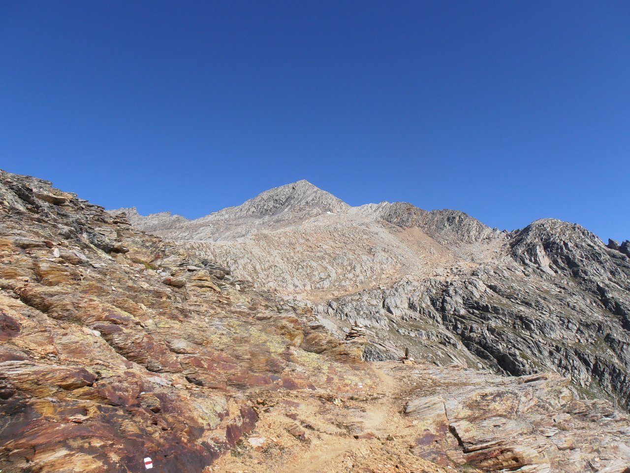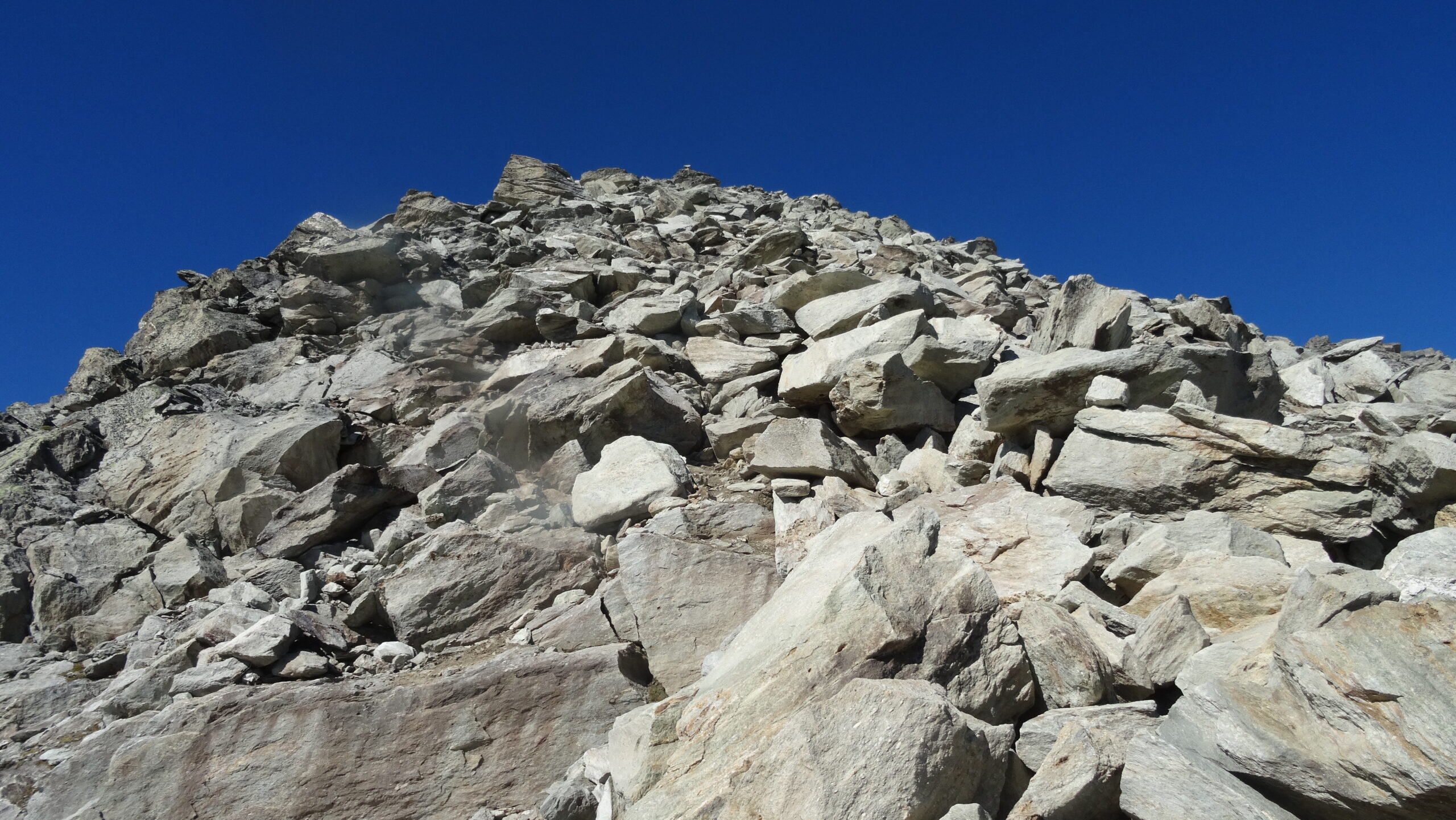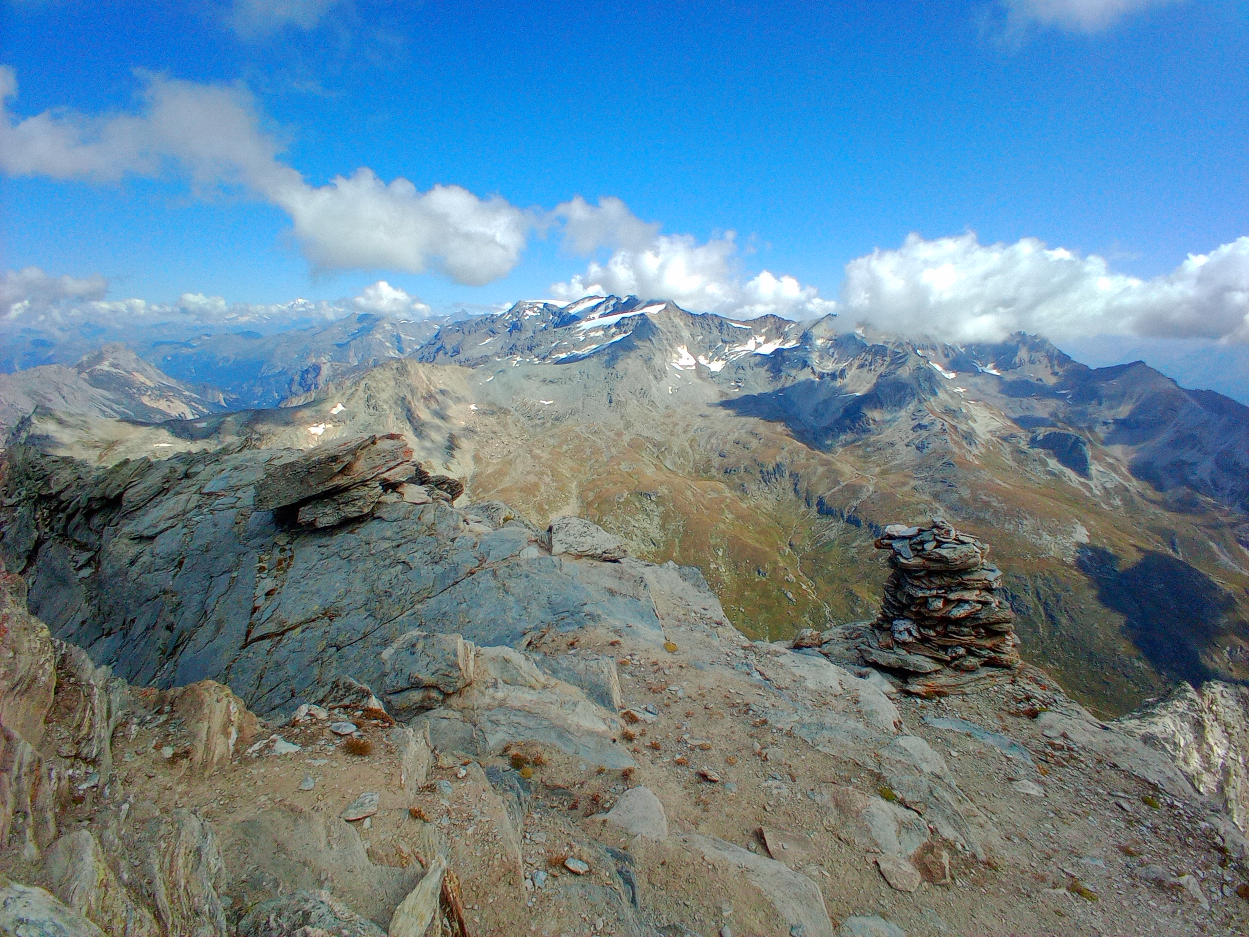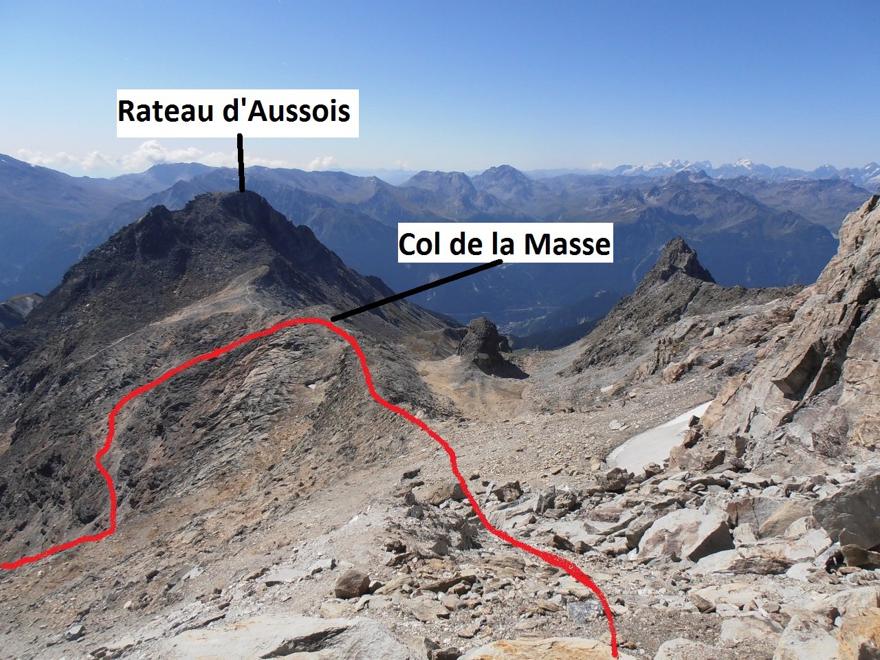 Dal parcheggio sotto la Diga di Plan d’Amont, si segue la stradina di servizio raggiungendo subito lo sbarramento, e poi si inizia a costeggiare la diga stessa sul versante sinistro; con andamento pianeggiante o quasi si raggiunge l’estremità opposta, verso l’immissario, dove un paio di tornanti nei pressi di una barriera rocciosa, portano ad un ripiano erboso dove si trova il Pont de la Sétéria 2208 m. Qui si tralascia il sentiero che attraversa il ponte (condurrebbe al Refuge du Fond d’Aussois e altre mete) per proseguire invece a sinistra per il Col de la Masse (paline indicatrici). Il bel sentiero sale in una valletta di erba e rododendri, per poi guadagnare un dosso erboso molto panoramico sulla diga sottostante. Si prosegue in direzione ovest, fino a raggiungere il torrente che va attraversato su delle pietre (con molta acqua il guado può risultare difficoltoso). Si prosegue nella valletta e poi per serpentine si sale il pendio erboso sovrastante, fino a giungere ad un piccolo pianoro sotto una bastionata rocciosa. Qui si volge a sinistra, salendo un pendio di detriti (nevai abbastanza ripidi a inizio stagione) solcato da una traccia di sentiero abbastanza marcata. Si guadagnano così gli spalti rocciosi di un antico ghiacciaio, e aggirando le rocce rossastre si perviene quindi al Col de la Masse 2922 m. dal colle si prosegue a destra lungo un sentierino non segnalato (ma ben indicato da numerosi ometti) che inizia a risalire una dorsale inizialmente detritica e poi rocciosa, che gradualmente si fa più ripida che porta ad un ben visibile colletto alla base della cresta SE del Grand Roc. Ci sono tratti di sentiero alternati a facili roccette, e nel tratto finale si supera un ripida rampa-canale detritica che porta al colle senza nome di quota 3200 m. Si volge ora sinistra e si risale l’ampio crestone SE del Grand Roc, ci sono due possibili linee di salita : 1) tenendosi a sinistra si possono salire i gradini rocciosi e i pietroni che con facile arrampicata portano direttamente al grande ometto di pietre posto sulla cima. 2) dal colletto si sale inizialmente piegando prima a destra (per evitare i primi gradoni rocciosi della cresta) e poi a sinistra, seguendo una traccia di sentiero che sfrutta cengette, canaletti e facili roccette, con varie diagonali fino a portarsi sotto il risalto roccioso terminale, che si supera agevolmente a sinistra, raggiungendo infine la cima. (ore 3.30 / 4.00 indicative dalla diga di Plan d’Amont alla cima). In discesa si segue a ritroso lo stesso percorso di salita.