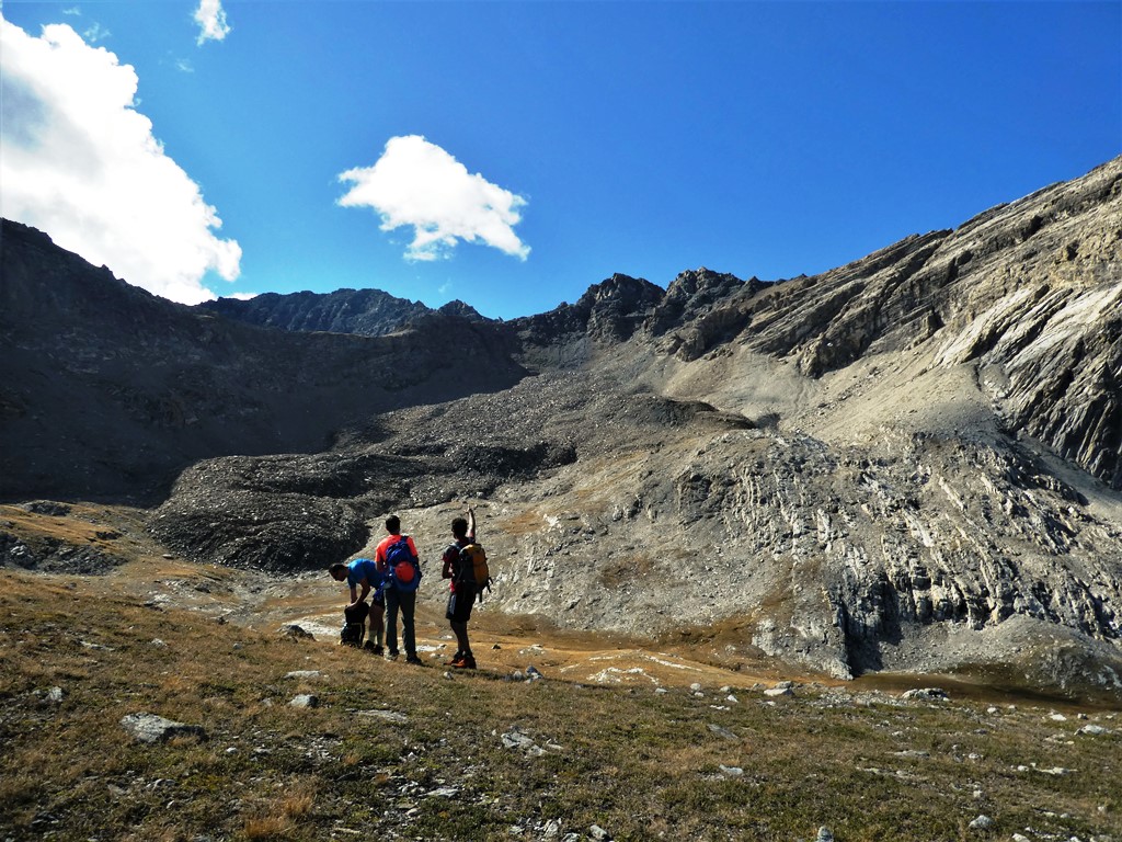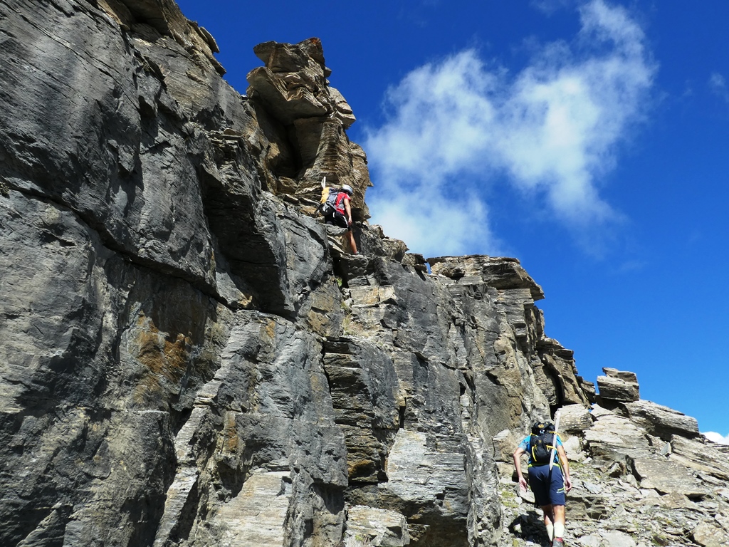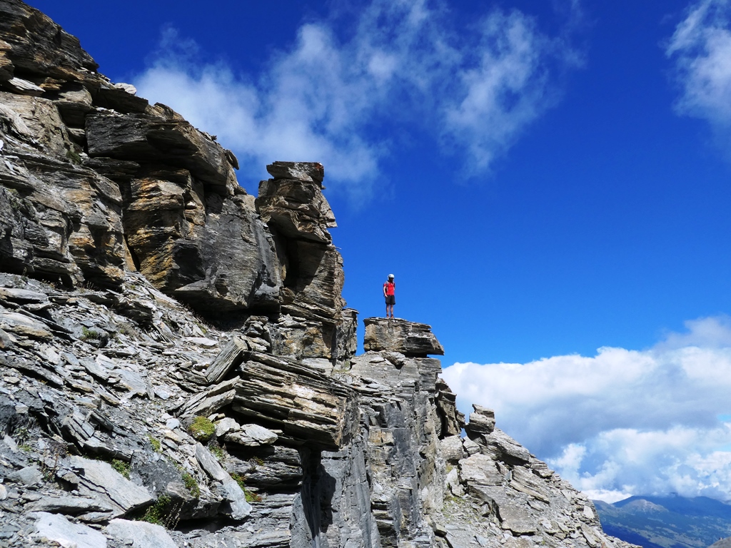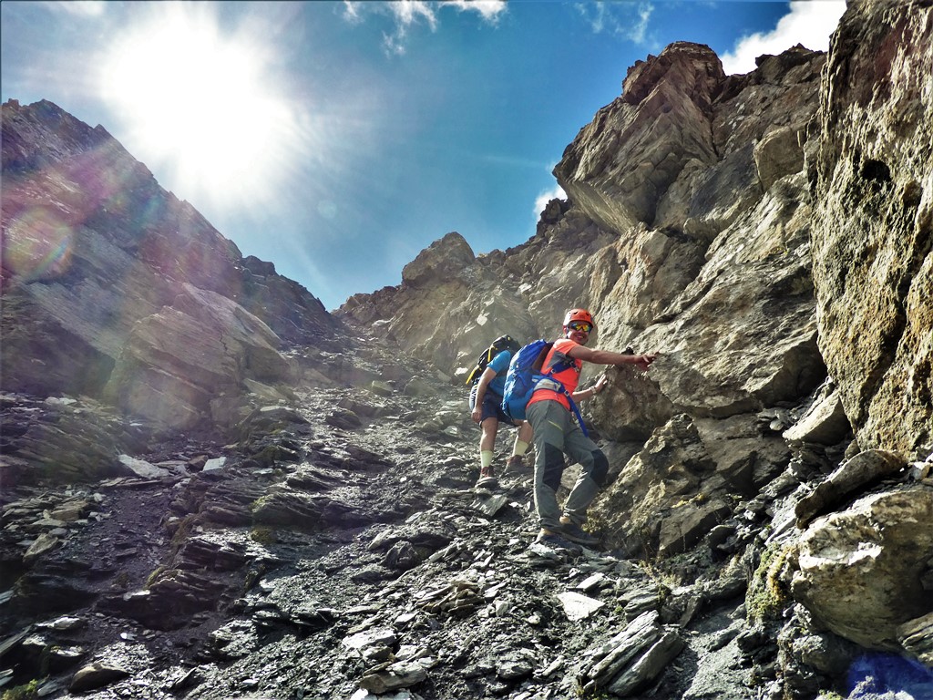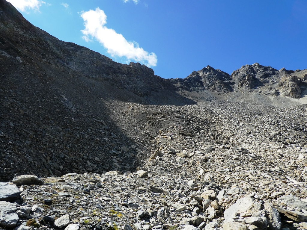 A questo punto, risalire faticosamente verso sx il ripido pendio di detriti e terriccio franoso, con alcuni cambi di direzione per seguire il percorso migliore. Si esce ad un comodo colletto a quota 3000 dove inizia la cresta finale, prima erbosa fino ad un grosso masso poi rocciosa con canalini ripidi e terrosi che risaliti con attenzione portano sulla punta Nord con paletto di legno ed in pochi minuti sulla Sud di poco più alta con ometto.