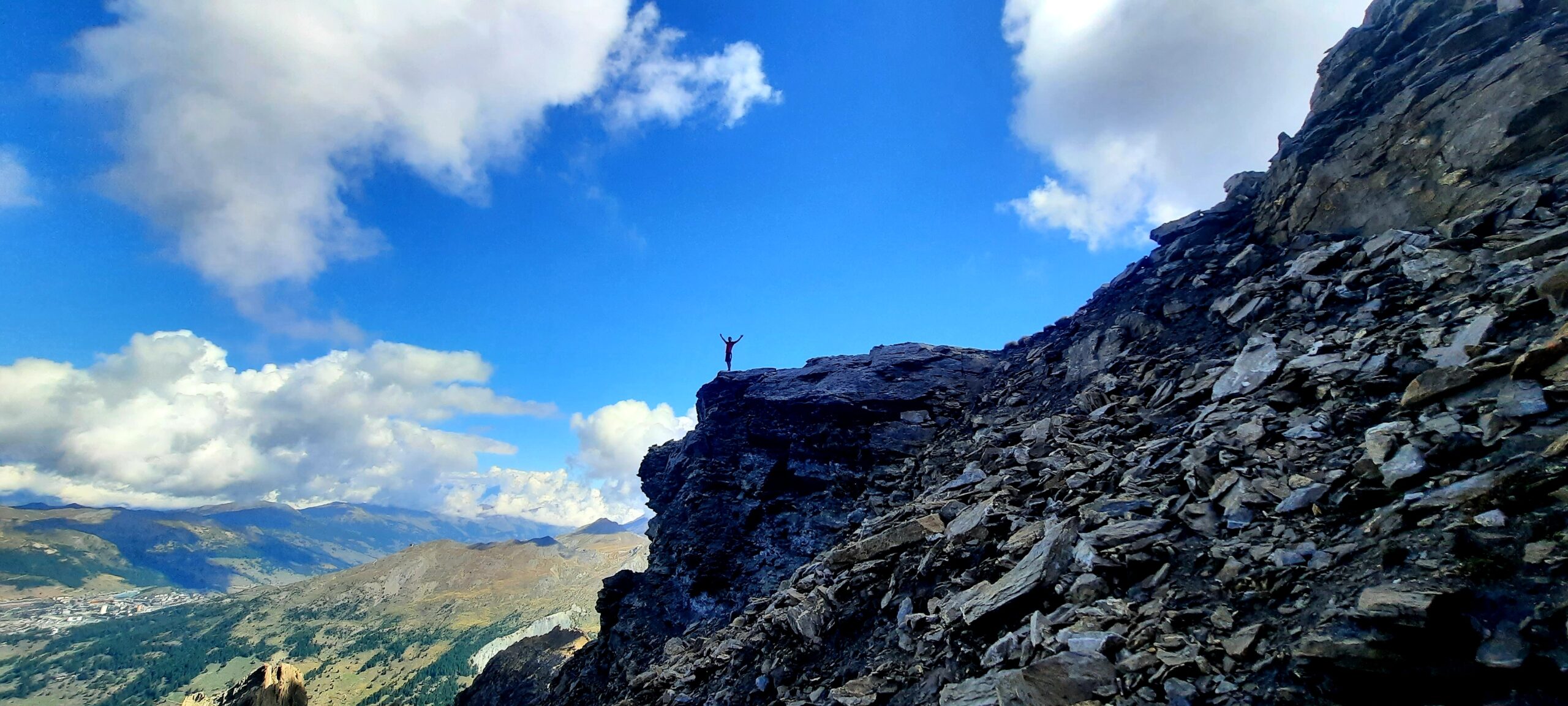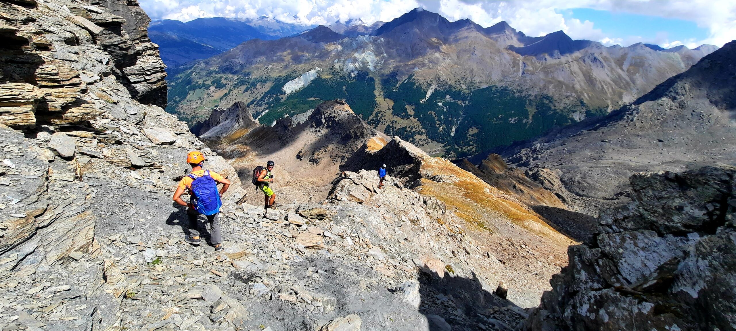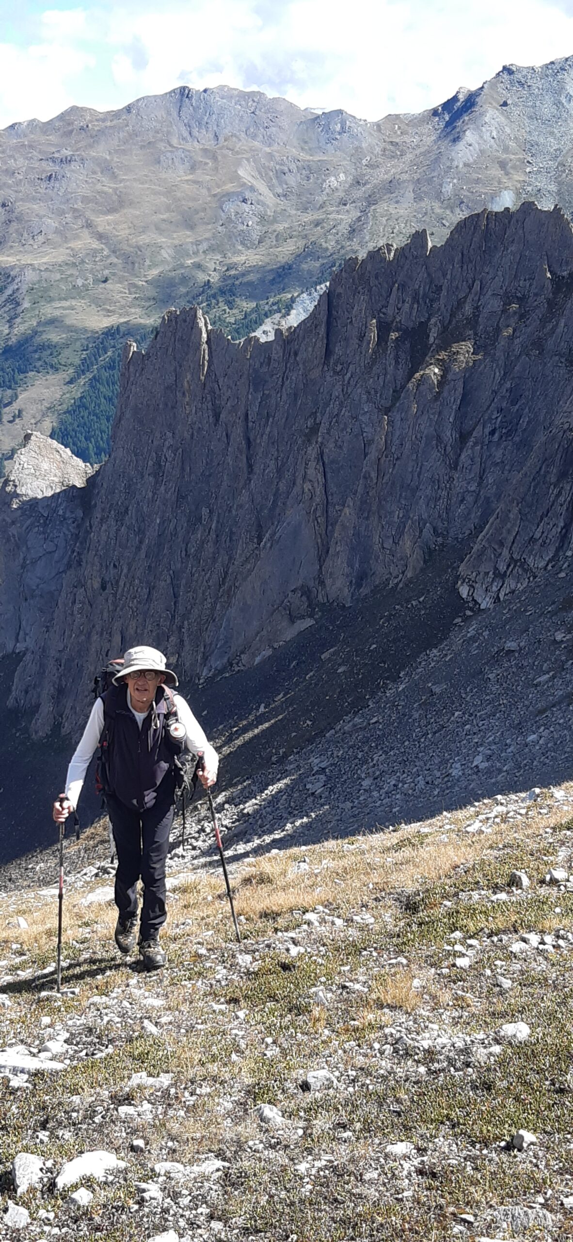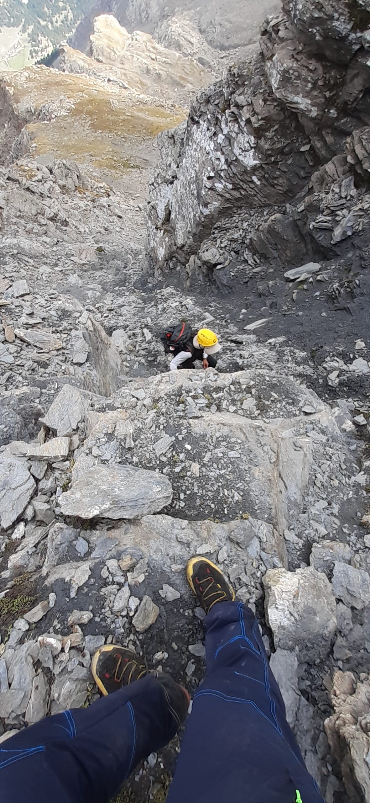 A questo punto, risalire faticosamente verso sx il ripido pendio di detriti e terriccio franoso, con alcuni cambi di direzione per seguire il percorso migliore. Si esce ad un comodo colletto a quota 3000 dove inizia la cresta finale, prima erbosa fino ad un grosso masso poi rocciosa con canalini ripidi e terrosi che risaliti con attenzione portano sulla punta Nord con paletto di legno ed in pochi minuti sulla Sud di poco più alta con ometto.