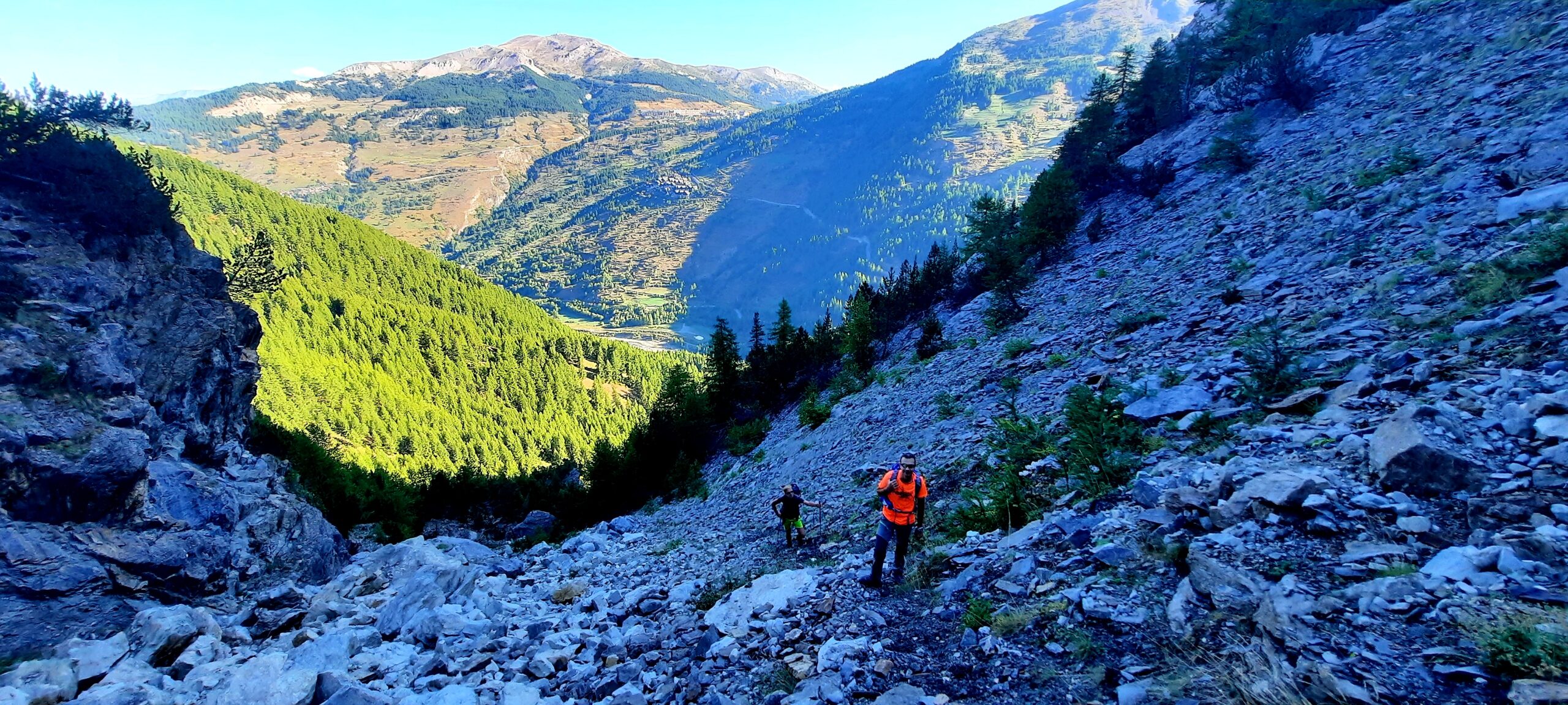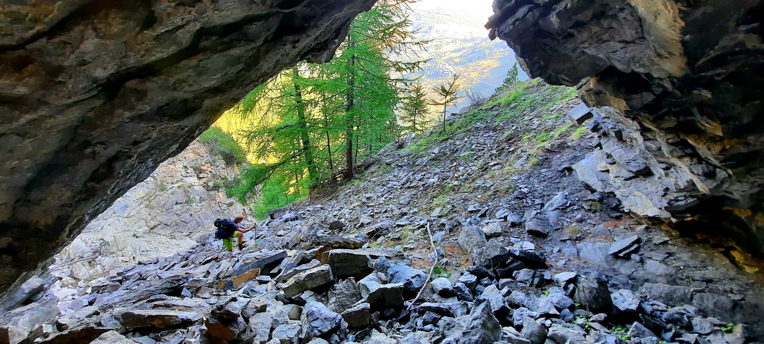 Si costeggia la parete sempre su sentierino che porta nel ripido canalone pietroso. Si raggiunge un’altra grotta, ed alla sua sx, un ripido ma breve pendio erboso da accesso ad una radura. Stando ora sempre alla dx orografica del torrente, in secca estiva, per entrare nel suo letto più avanti ed uscire finalmente nel bellissimo vallone superiore. Qualche ometto guida ma il percorso è evidente, prima un pò diritti poi verso dx su un ripido dosso erboso fino al suo colmo. Ora si scende pochissimi mt. per puntare alla vasta pietraia a dx di una evidente colata morenica che si risale fin quasi all’imbocco di un evidente ripido canale tra 2 punte rocciose del Gran Roc.