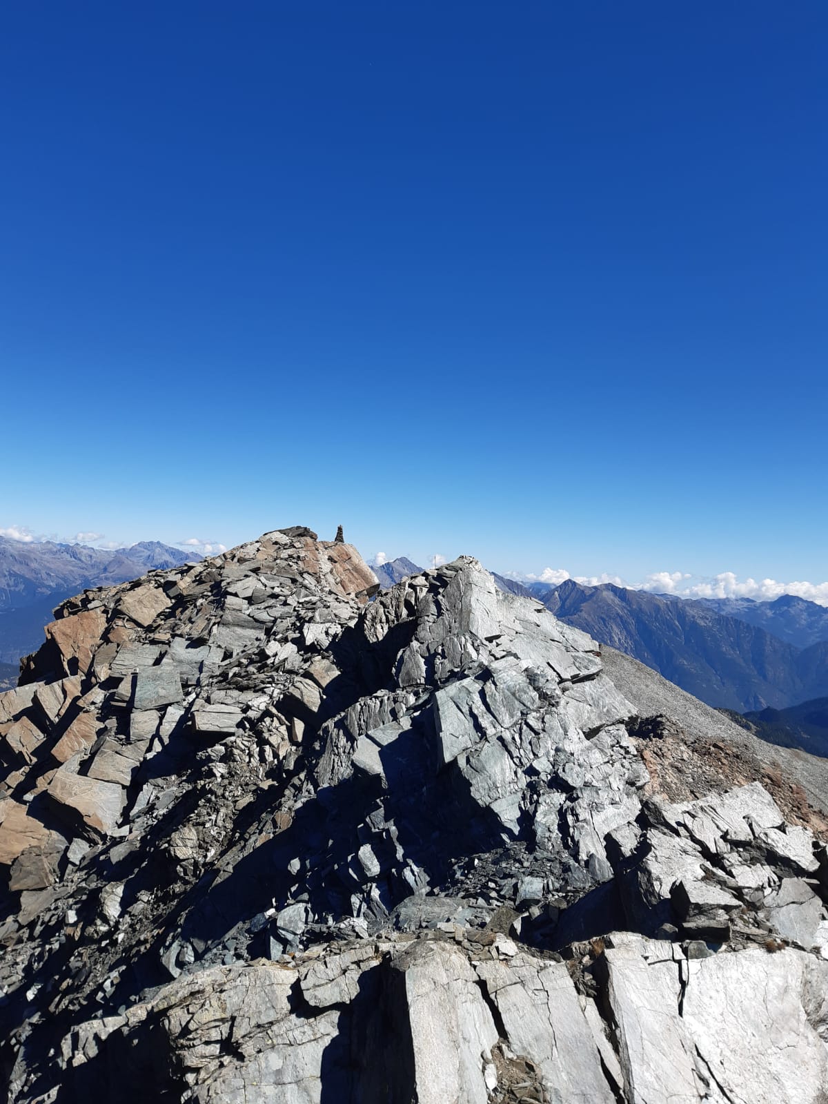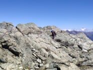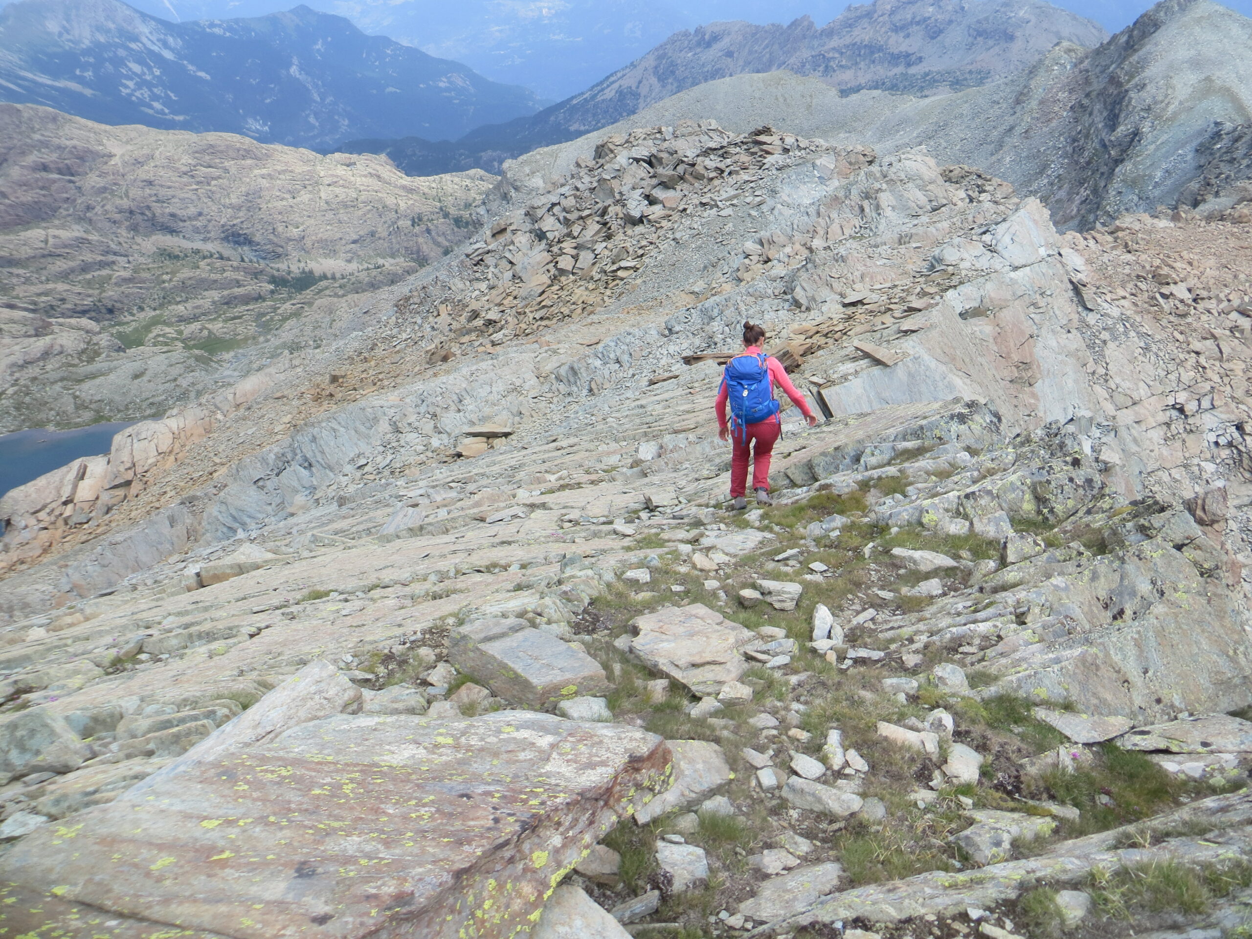 L’ultimo tratto più pianeggiante richiede alcune discese sul lato N e un paio di passaggi di I-II grado (cengette appena esposte ma ben appigliate) per evitare di perdere quota.