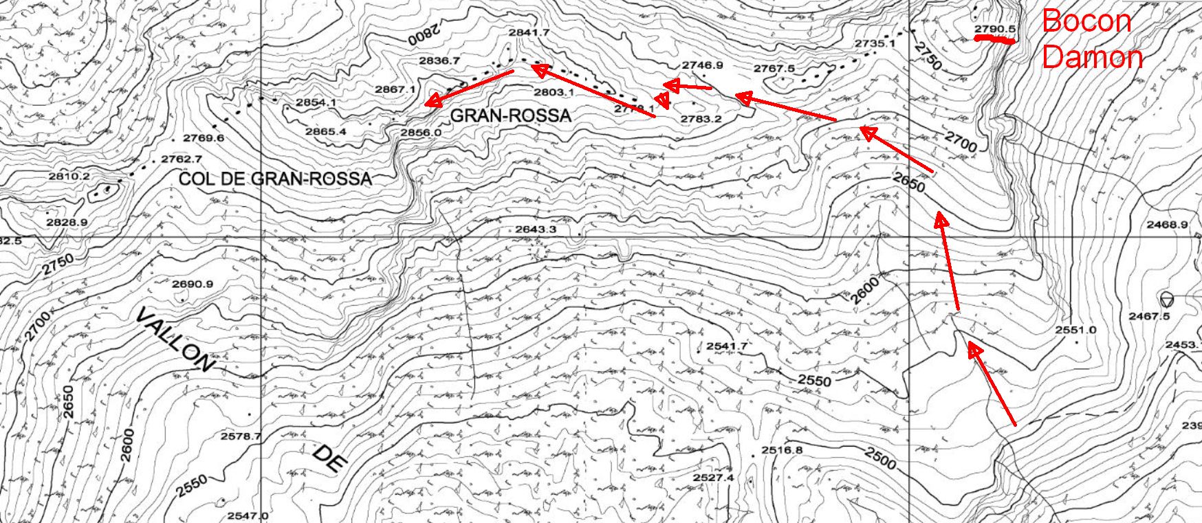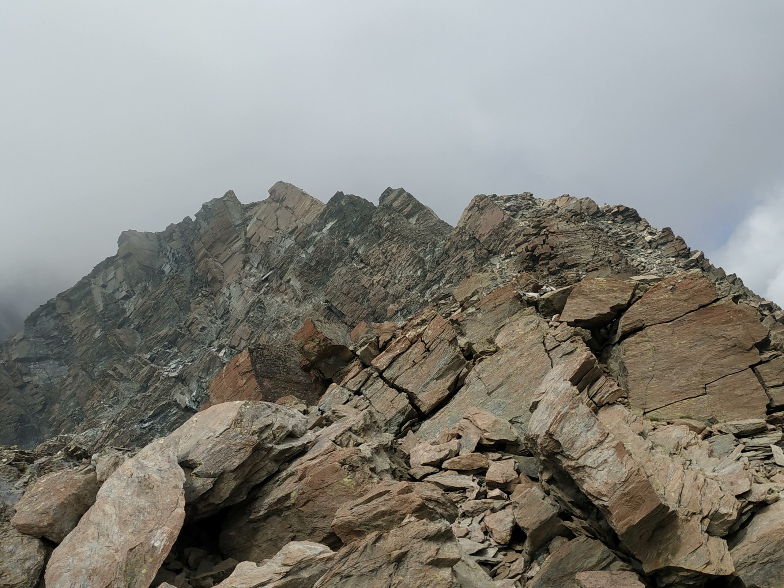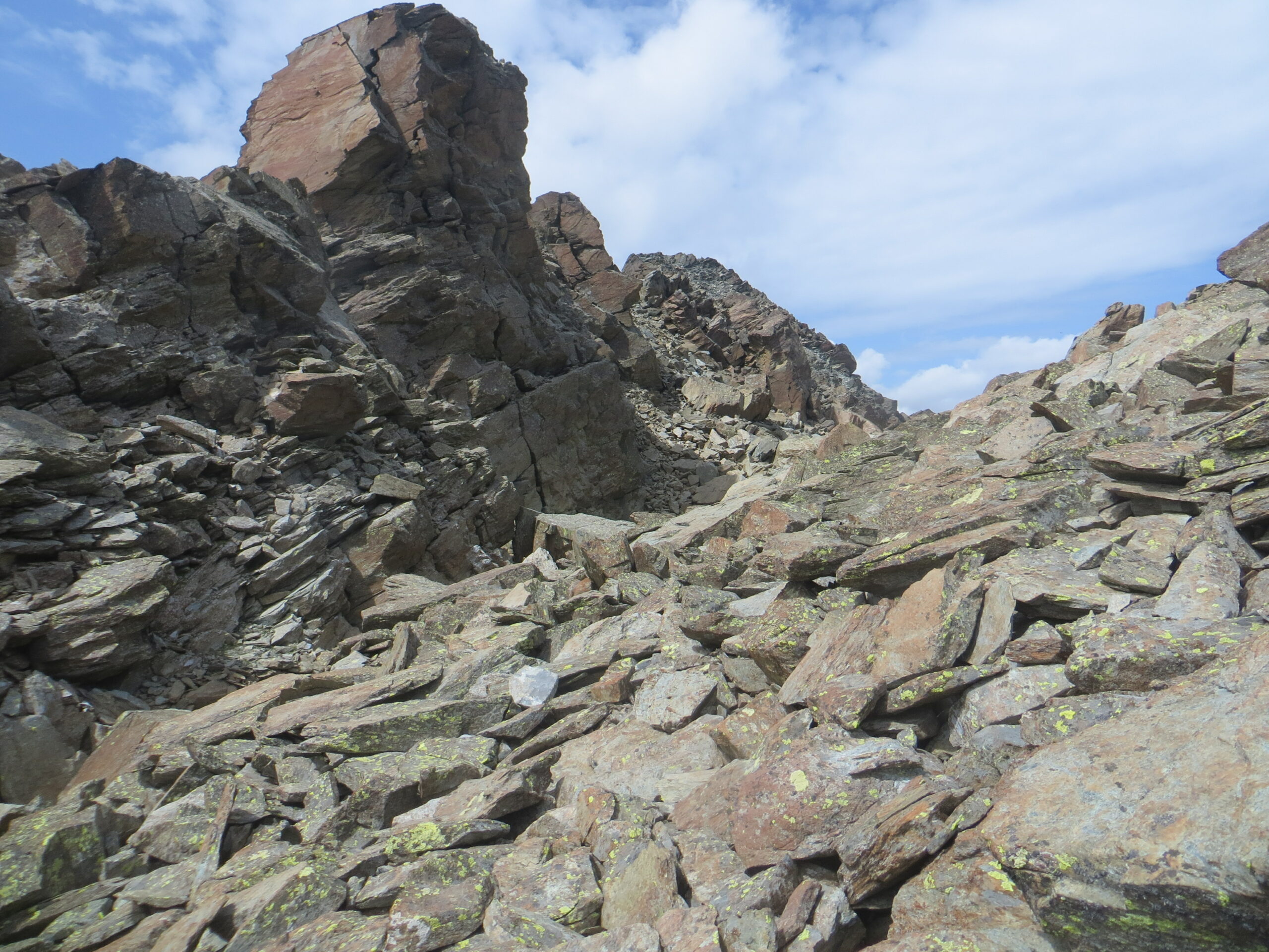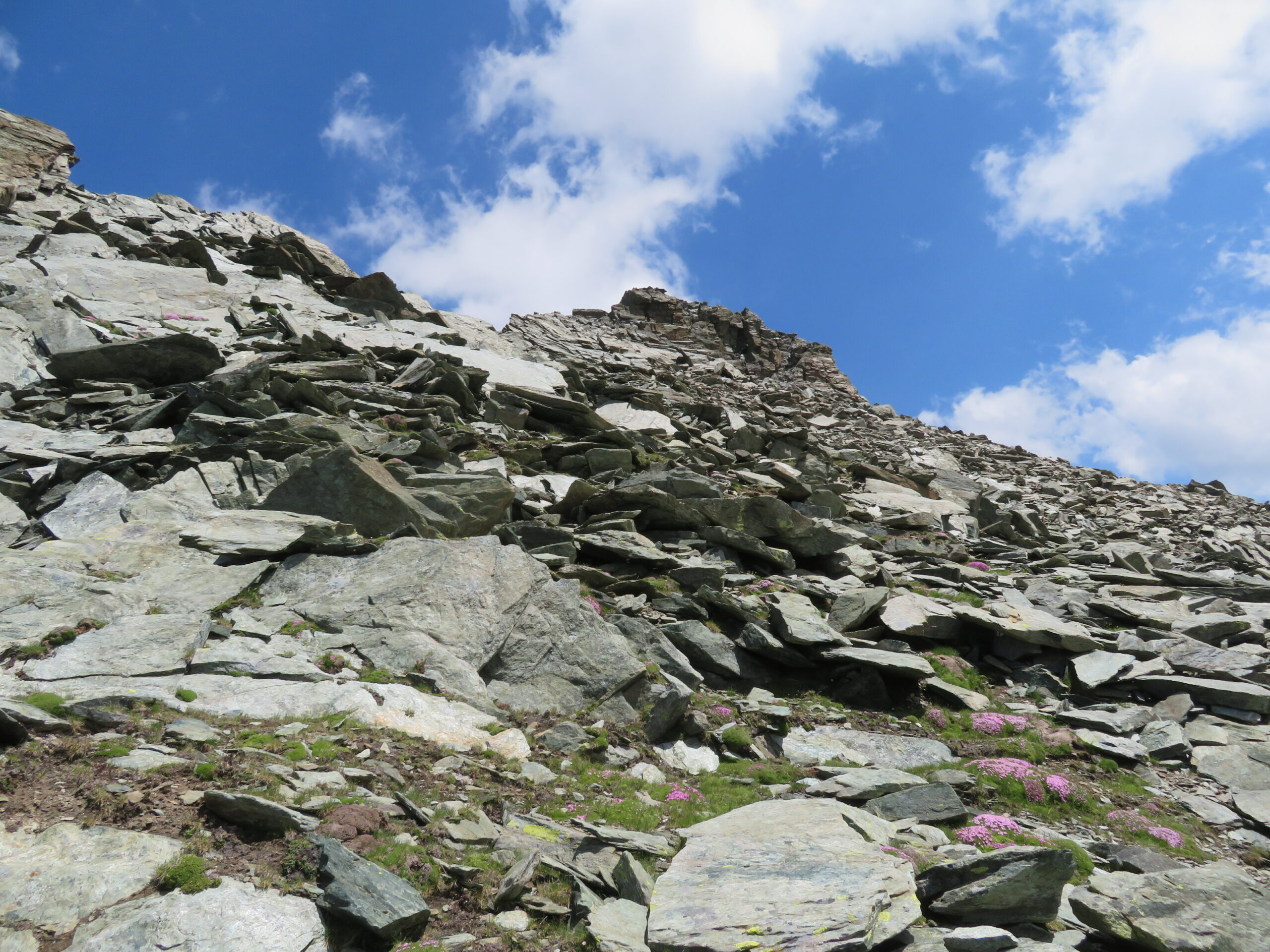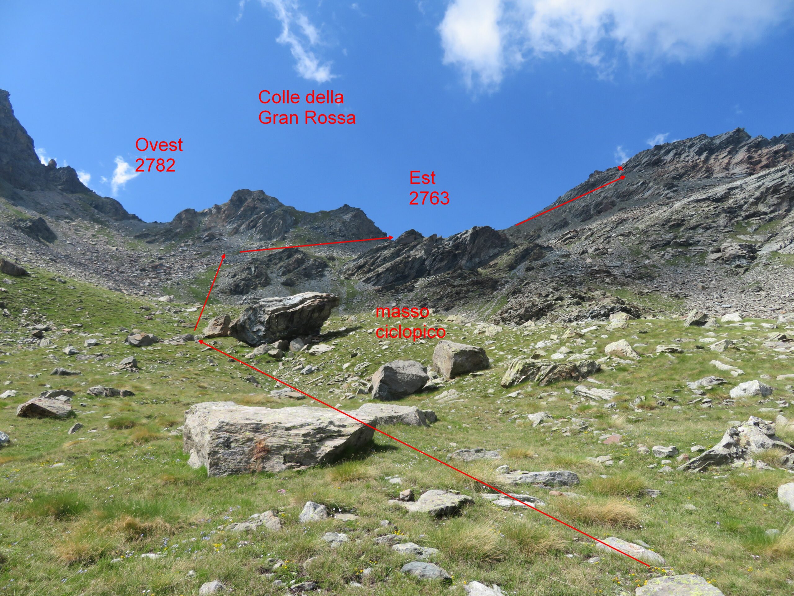 Sempre assistiti dalla segnaletica si punta verso il colle di sin. per superare una fascia di rocce nere, sopra le quali ci si sposta a dx in direzione del Colle della Rossa(m 2763).