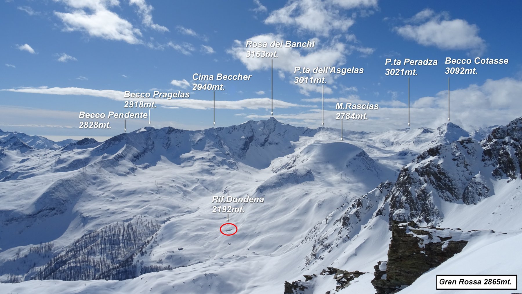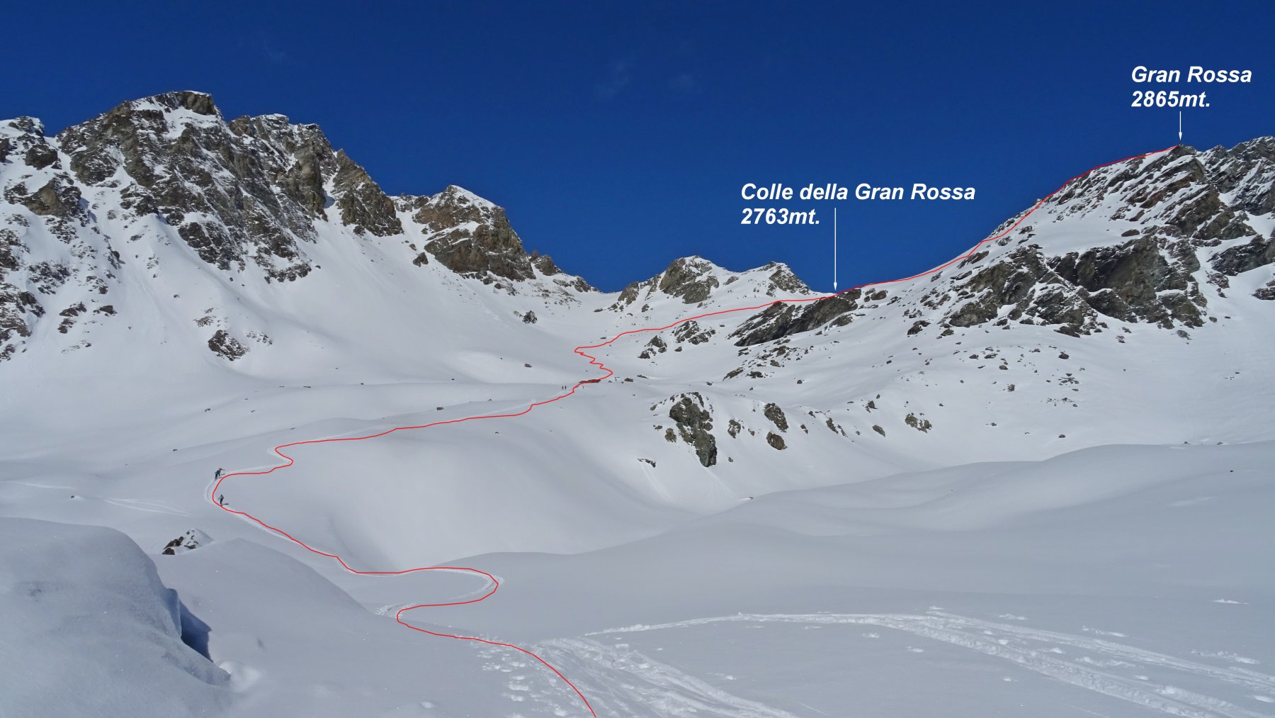 Seguire la strada per Dondena fino ai cartelli (park estivo). Girare a destra per ampi pendii, portarsi al fondo del vallone e puntare ad un evidente colle (Colle della Gran Rossa): di qui a dx si raggiunge la punta per cresta.