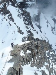 Discesa: con l’innevamento trovato si sono aggiunte delle difficoltà per via del mancato rigelo notturno e della neve marcia. Dalla croce con due doppie siamo scesi seguendo la cresta nord