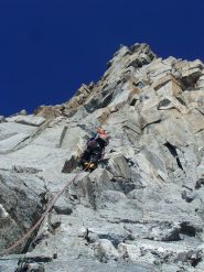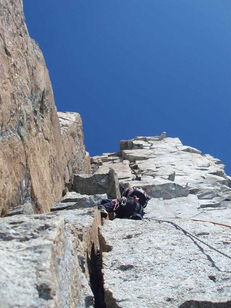 ( IV con passi di V). Sostare su un piccolo terrazzino e andare a prendere un altro diedro sulla destra che risale per 30 metri ( IV con passo di V) Attenzione a un blocco instabile. Uscita sul tetto superiore poco sotto la cima. Ultimo tiro in comune con la via della cresta Est-Sudest con un passo di V con un chiodo su posto. Le soste sono tutte da fare su friend o spuntoni, bisogna muoversi su tutto il percorso in maniera abbastanza delicata per pietre poco stabili. Se fatto a inizio stagione, le cenge sono innevate.