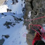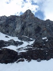 Risalire il canalone iniziando ad arrampicare 100 metri più in alto rispetto alla parte più bassa del primo torrione. Salita in conserva per 100 metri di II +, con uscita su cengia nevosa.