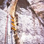 Continuare per due tiri da 40 metri su questo spettacolare diedro rosso pieno di fessure e spuntoni