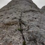 - L5 Seguire integralmente la fessura successiva, che più in alto piega verso destra (IV+, 3 ch. e 1 cordino in clessidra); in corrispondenza dell’ultimo ch. tornare a salire in verticale per qualche metro (V-), fino a un ripiano con comoda sosta su 2 ch. (35 m, V-).