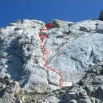 - L4 Superare con delicatezza lo strapiombo sopra la sosta (1 ch. all’inizio del passaggio, V) e continuare lungo la fessura successiva, ora fra placche compatte. Attenzione che prima che la fessura diventi più verticale e difficile, la si deve abbandonare uscendo verso destra, rinviando un vecchio ch. (V-) e proseguendo poi per qualche metro in leggero obliquo a destra fino a una sosta con 2 ch. da collegare (30 m, V).