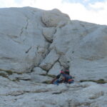 - L3: rimontare lo strapiombo uscendo su ripiano ghiaioso. Dopo 10m si lascia il canale e ci si dirige a dx verso un diedro/camino (alla cui base c’è un cordone incastrato visibile da sotto) che incide la placconata di dx. Si risale il diedrino di roccia mediocre (5m III) e si scala su di una placca di roccia eccellente (15m IV) per continuare poi con una rampa ascendente verso dx (8m III+) fino ad un piccolo strapiombo. Lo si supera sulla sx (V- friend) uscendo su una placconata (in tutto 50m, sosta su ch. e cordone).