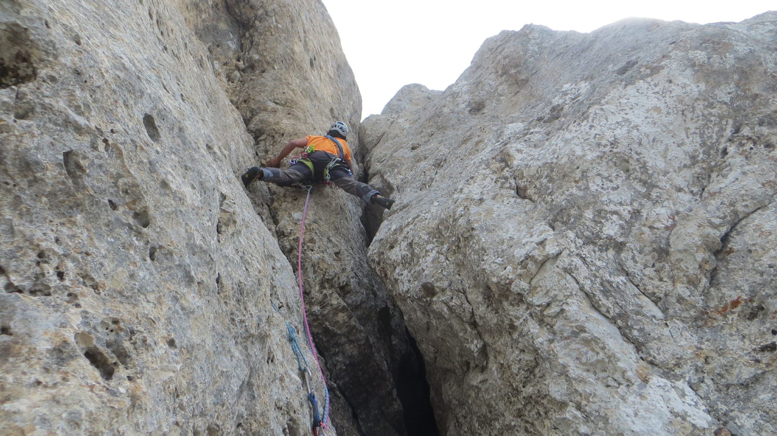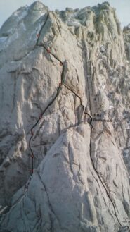 - L4: si rientra nel canale traversando 10m a sx; si risale un diedro/rampa ascendente a sx (5m IV- friend); si evita la difficile uscita del diedrino spostandosi a sx e rientrando sopra a dx. Sosta poco dopo su ch. con cordone.