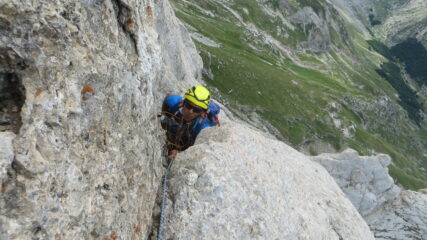 - L2: Ancora altri 30m (III+). Sosta sotto uno strapiombo, su 2 ch. con cordone