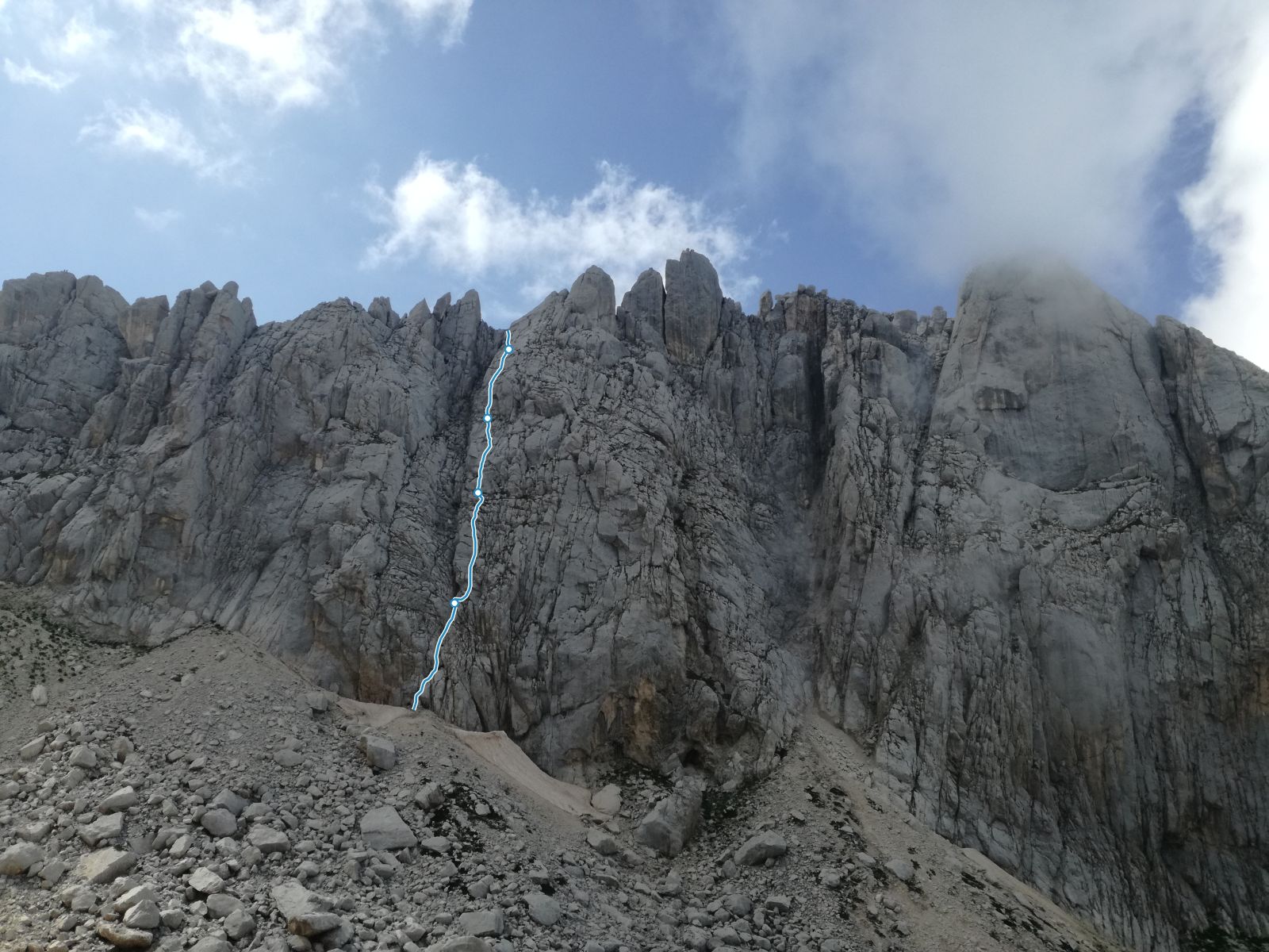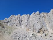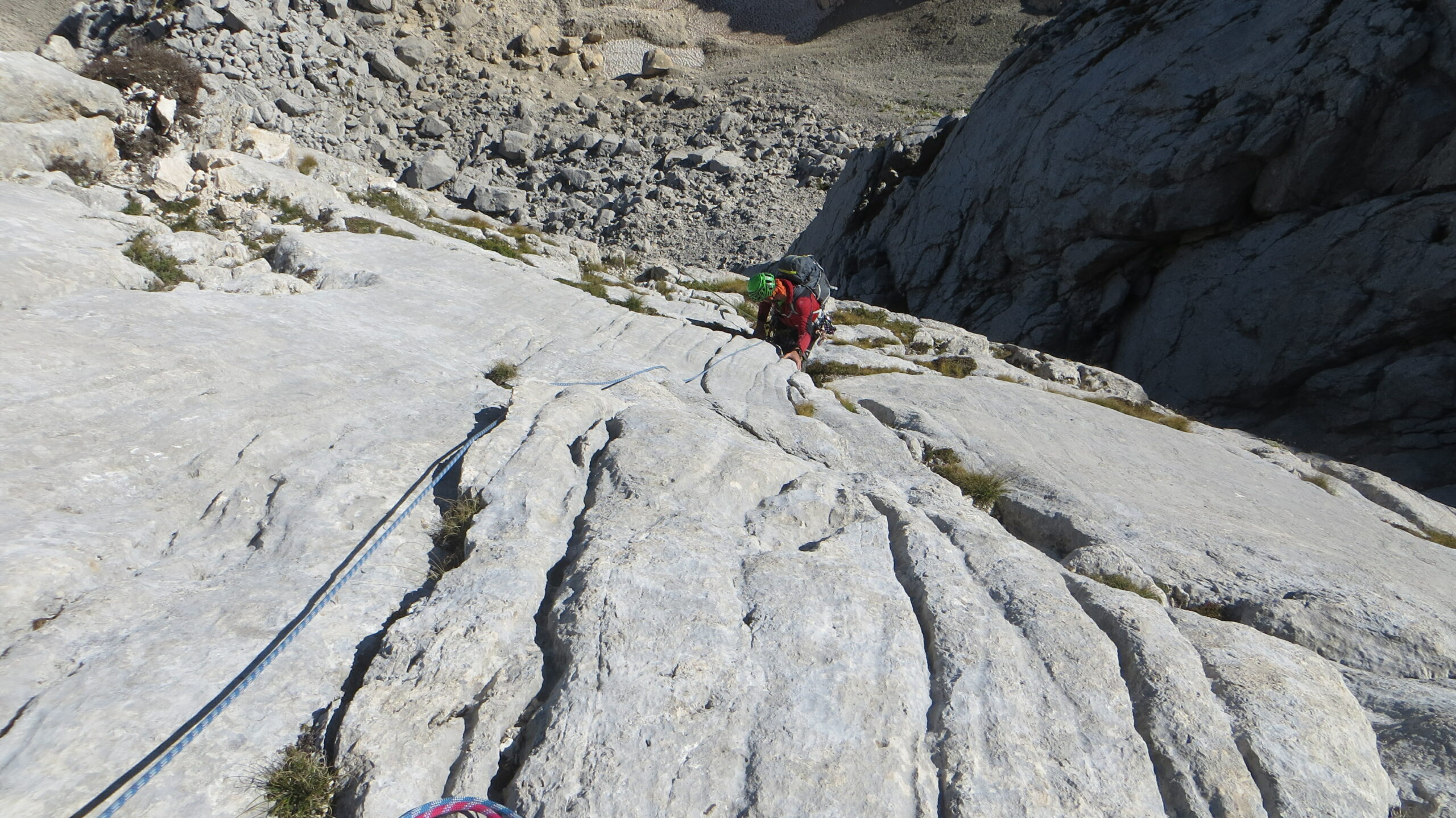 L2 : Si traversa un pò a destra andando a prendere una fessura (ch. con cordone) che si segue fino a raggiungere una zona di rocce appoggiate. Sosta su 2 ch. alla base di una bella placca di roccia compatta. (45m IV+ V-)