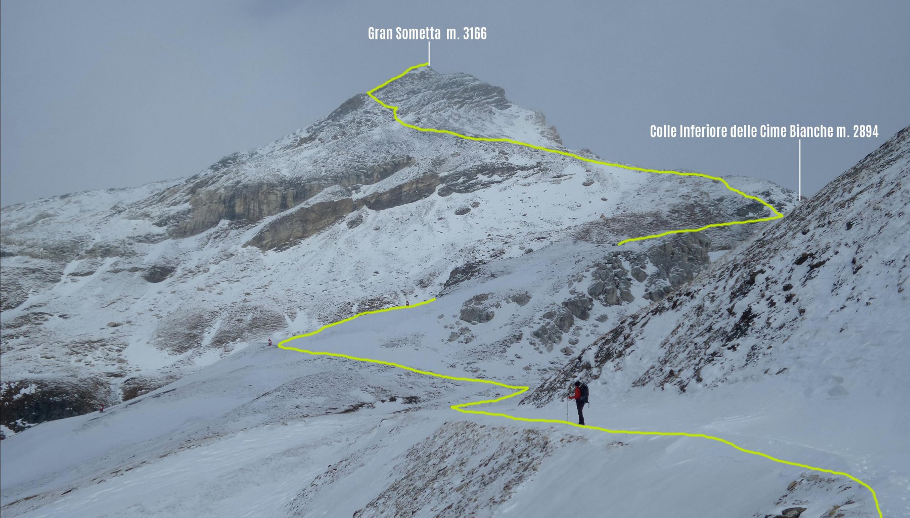 Dal parcheggio si segue inizialmente la stradina poderale (interdetta al traffico veicolare privato) segnavia n. 3 e n. 20, indicazione per Salette e Colli delle Cime Bianche. Intercettato un sentiero, si abbandona la stradina e si sale con vari tornanti, prendendo quota abbastanza rapidamente, ed arrivando ai margini di un grande pianoro, dove si trova la chiesetta della Salette. Dalla chiesetta, volgendo verso sinistra si raggiunge la stazione di arrivo della cabinovia della Salette m. 2260. Seguendo il vallone a destra con percorso libero, lasciando la cresta del Grand Collet sulla sinistra, per volgere gradualmente a destra, si salgono dossi e avvallamenti, poi un valloncello porta ad una ampia insellatura, dove si incrocia una pista da sci che sale dal valloncello di Cleyva Grossa (che può essere seguito anche come percorso alternativo, salendo dall’arrivo della cabinovia della Salette e tenendo subito la sinistra, tenendosi successivamente a destra nelle vicinanze della cresta rocciosa del Gran Collet). Seguendo il percorso della stradina-pista si raggiunge la stazione di arrivo di un altro impianto di salita nei pressi del Colle Inferiore delle Cime Bianche 2896 m.