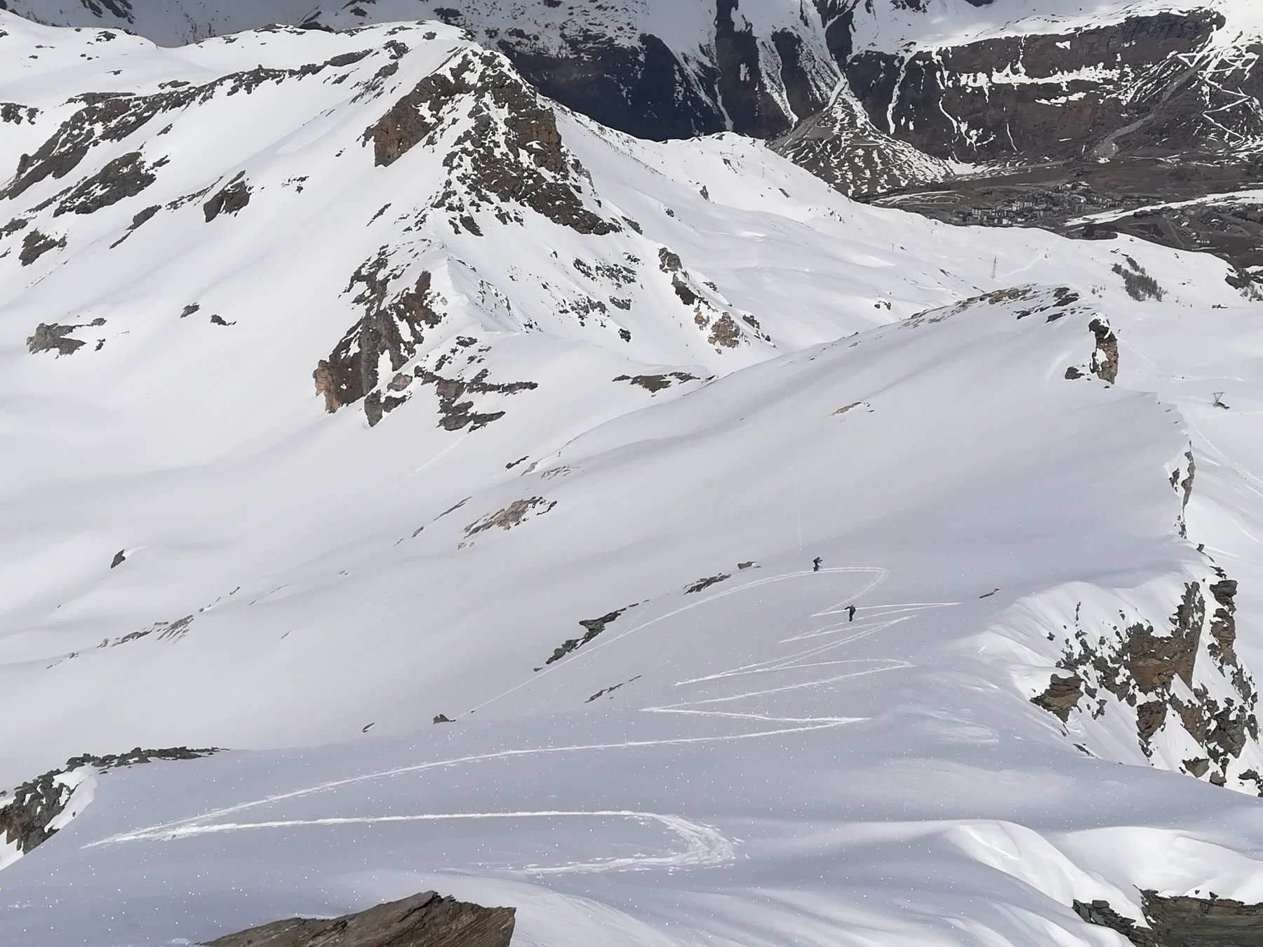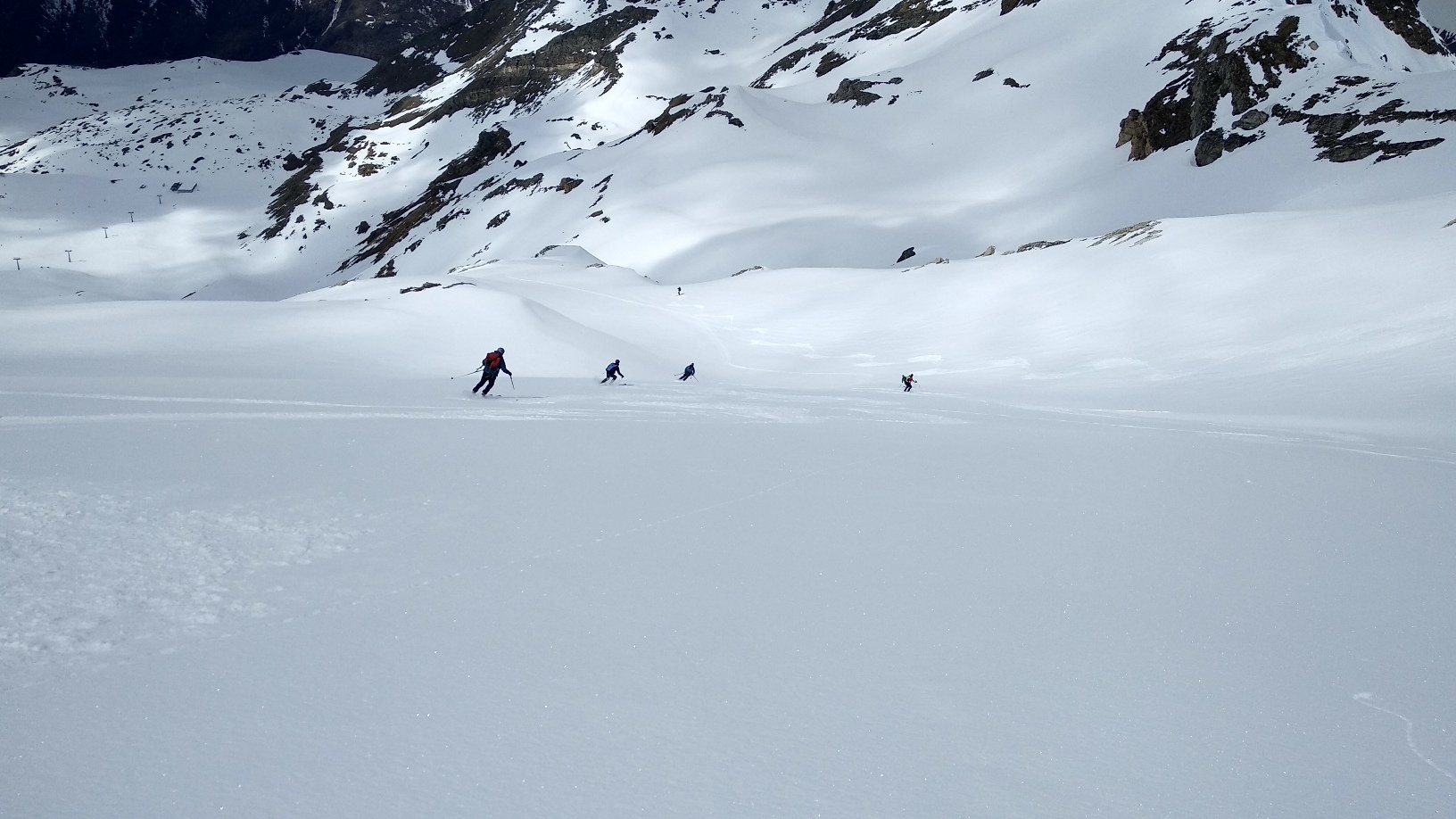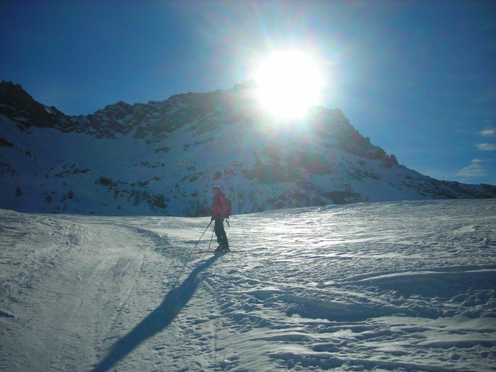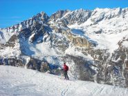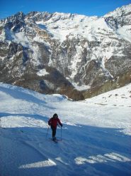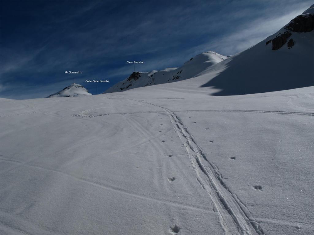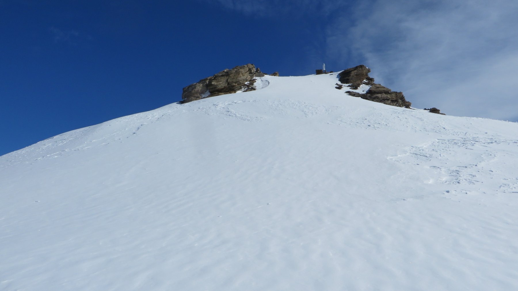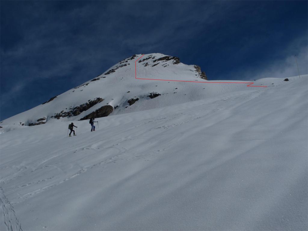 Partenza dal tornante dove la strada per Cheneil incontra il pistone di Valtournenche. Si seguono le piste fino al colle inferiore delle Cime Bianche. Dal colle si percorrono gli ultimi 250m di dislivello su pendii molto più ripidi, arrivando fino in vetta con gli sci. E’ possibile salire anche per gli ampi pendii che hanno origine dalla stazione di partenza della seggiovia Bec Carré.