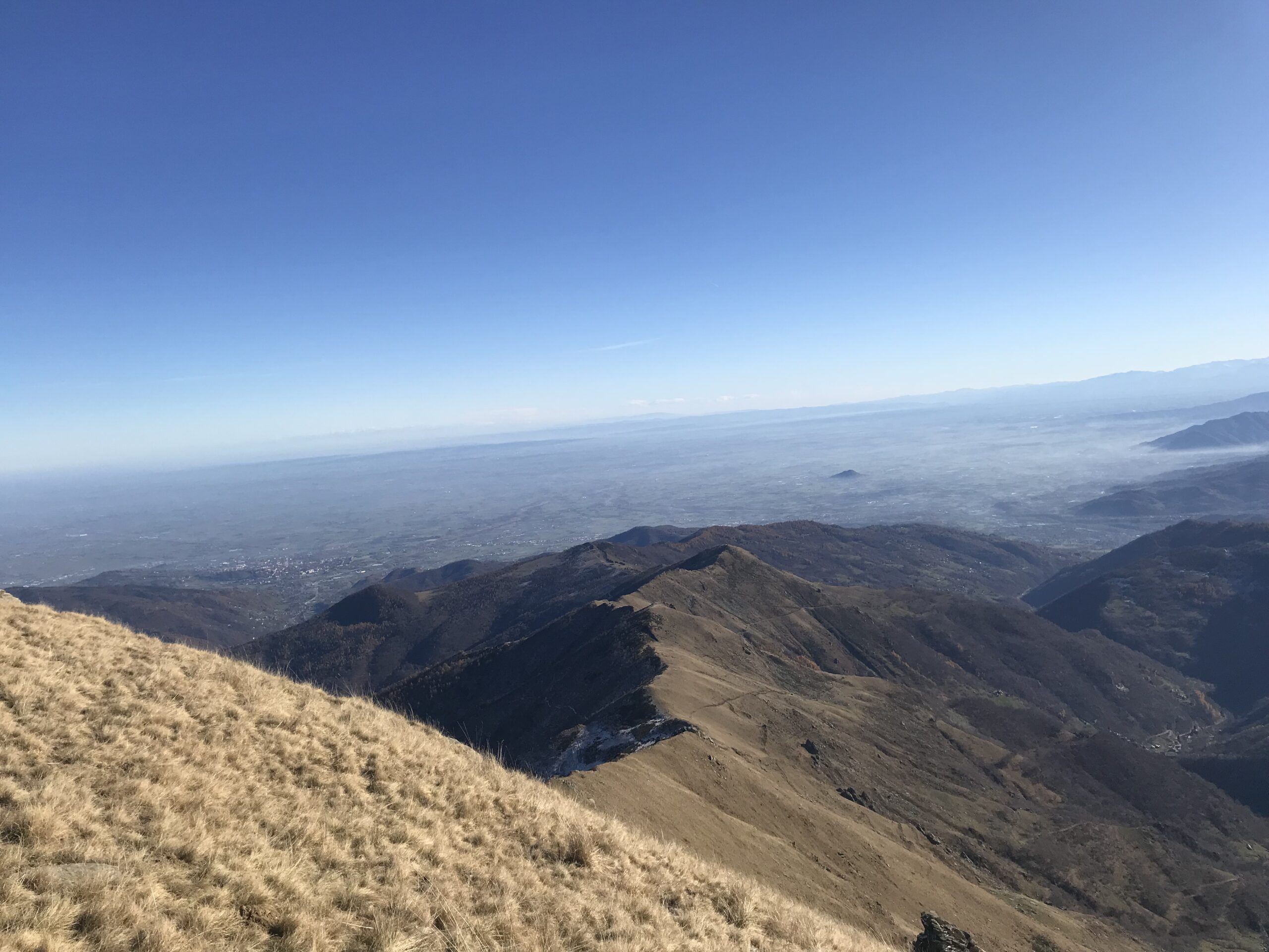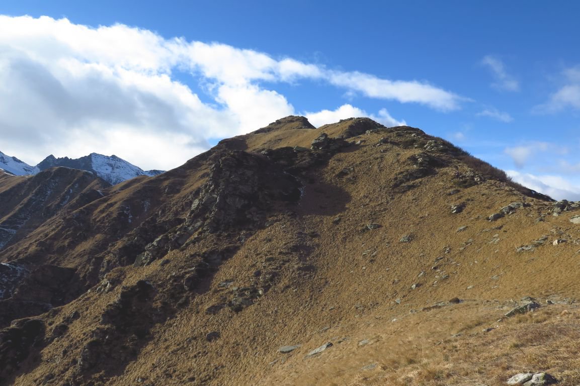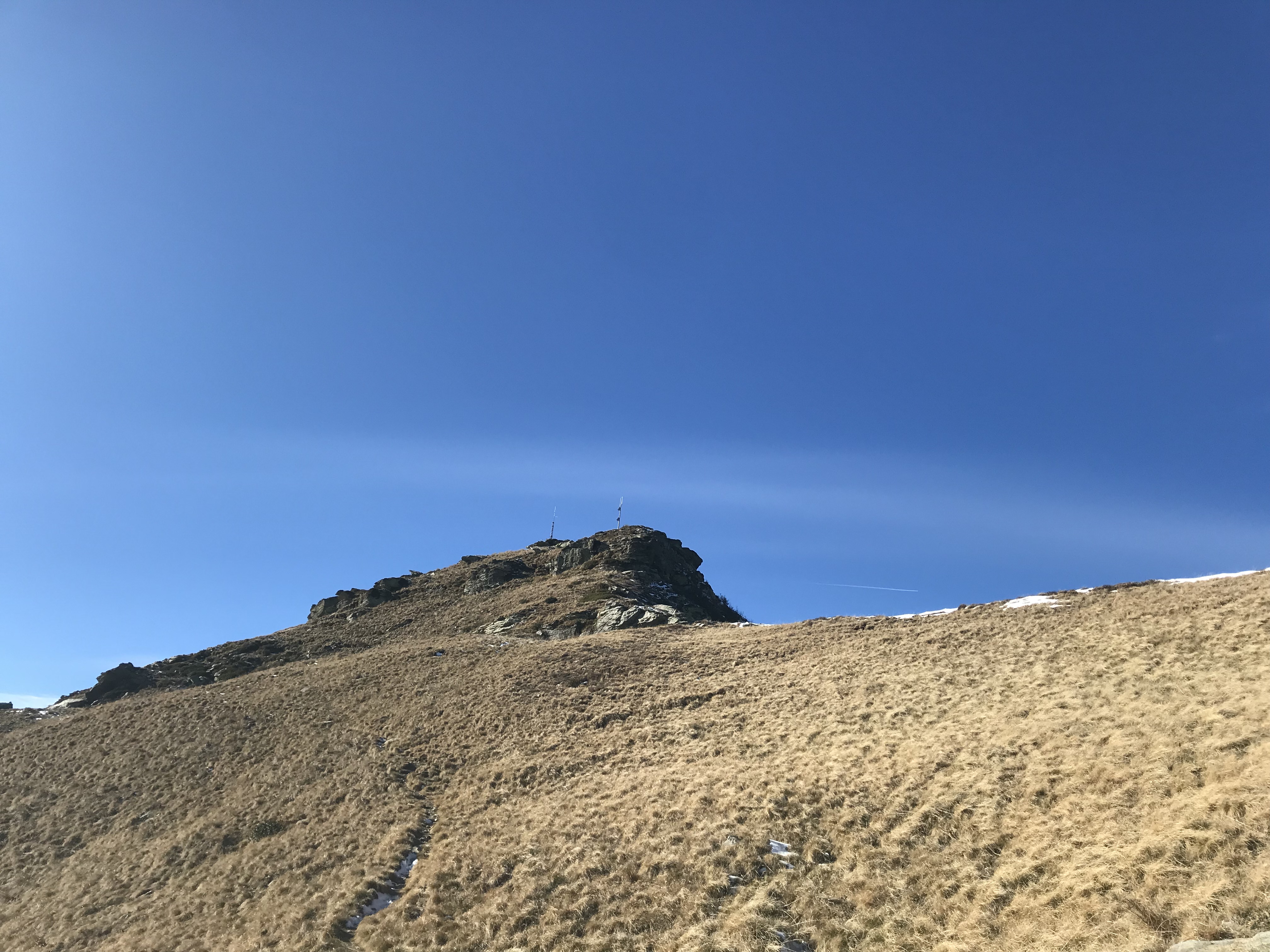 Dalla vetta seguire fedelmente la cresta in direzione NE (bolli bianchi e rossi e indicazioni per il Lazzarà) e raggiungere in breve ad un colletto. Qui si tralascia la traccia principale e ci si mantiene sul filo di cresta puntando ad un evidente ometto. La traccia è in alcuni tratti abbastanza esile ma il percorso è molto intuitivo e gli ometti sono sempre posizionati nei punti chiave e permettono di superare agevolmente alcuni brevi risalti. Raggiunta l’ampia sella del Col Sourain 1836 m) si prosegue seguendo la traccia che si mantiene sul crinale (bolli gialli) tralasciando la traccia principale che taglia in diagonale sulla destra e che rappresenta una discesa alternativa più rapida. Con dei continui saliscendi si raggiungono dapprima il Monte Cialmetta 1843 m e quindi il Monte Servin 1756 m. Dalla vetta del Servin si ritorna al colletto sotto la cima e quindi si continua a scendere fino a raggiungere la sterrata che taglia il versante Sud. Si svolta a sinistra e si segue la strada per qualche centinaio di metri in direzione del Colle Vaccera. Arrivati ad un bivio si gira a destra seguendo la stradina che scende nei prati fino a delle baite ben visibili. Continuare a scendere sulla stradina che ben presto si trasforma in mulattiera (bolli gialli e indicazioni GTA) e riporta velocemente a Pra del Torno.