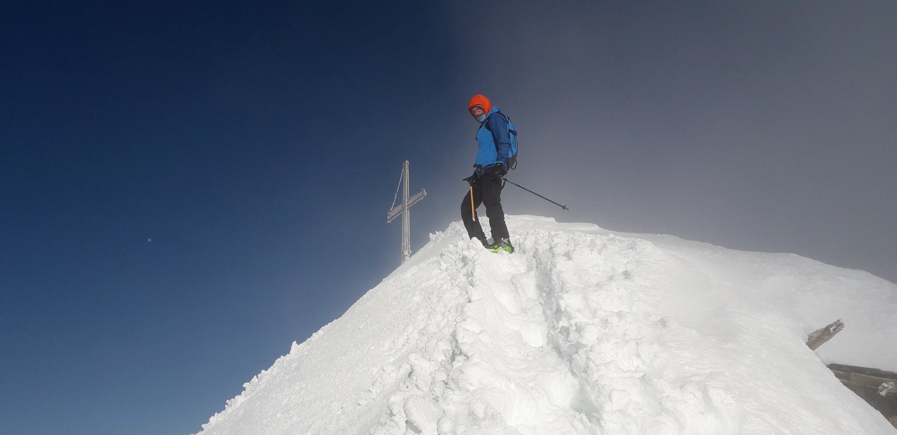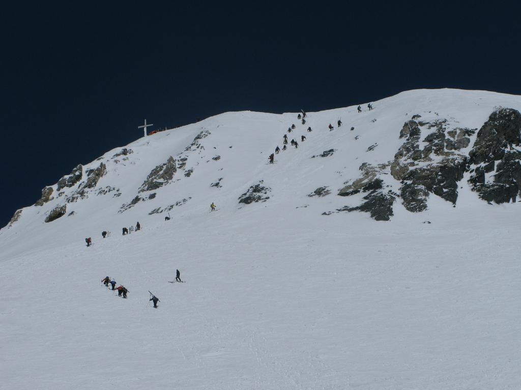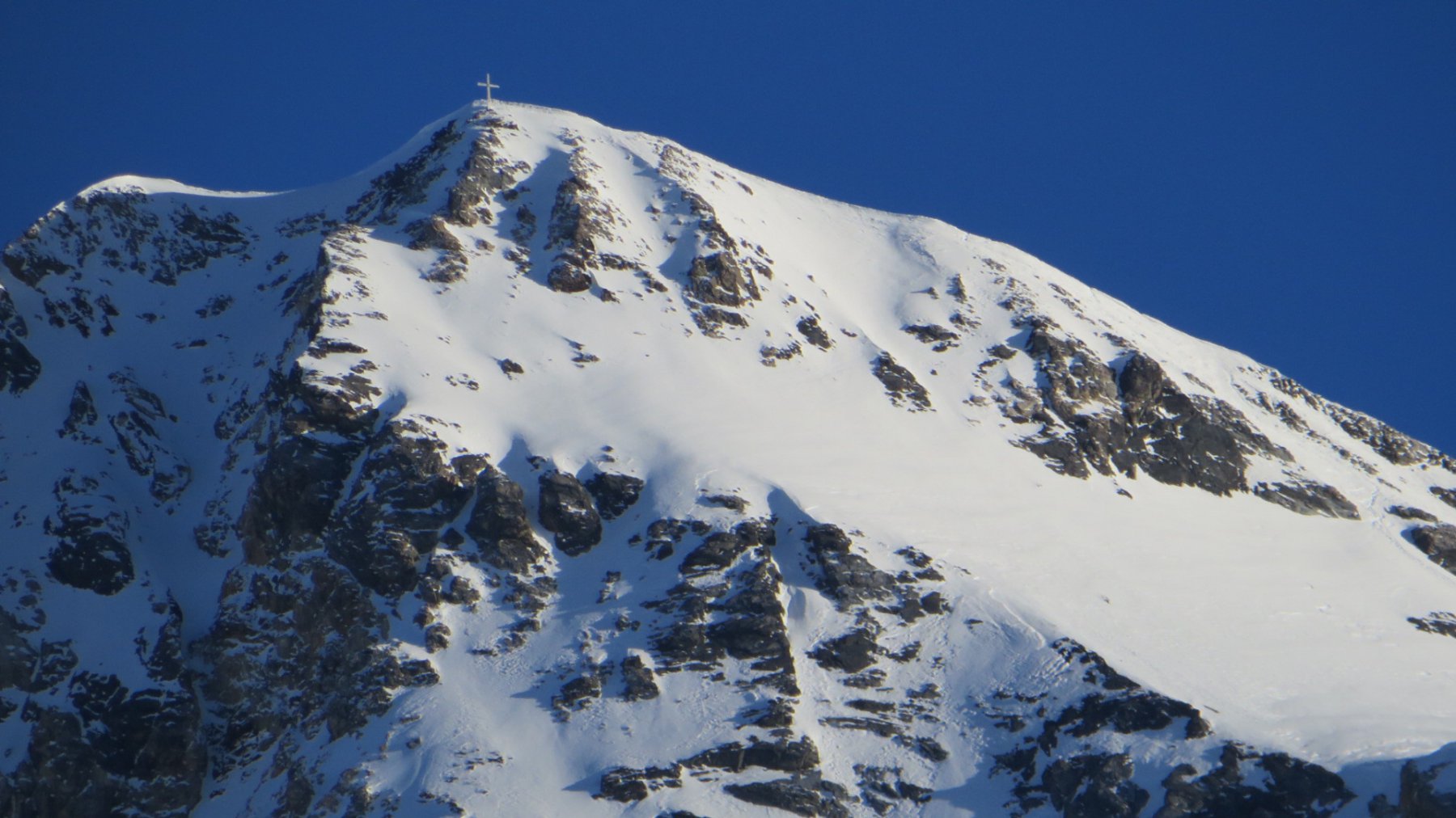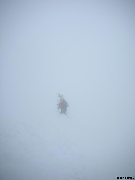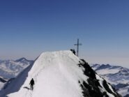 Da qui si sale il ripido pendio soprastante, fino ad aggirare a destra (E) il salto finale, pervenendo sull’affilata cresta a breve distanza dalla vetta.