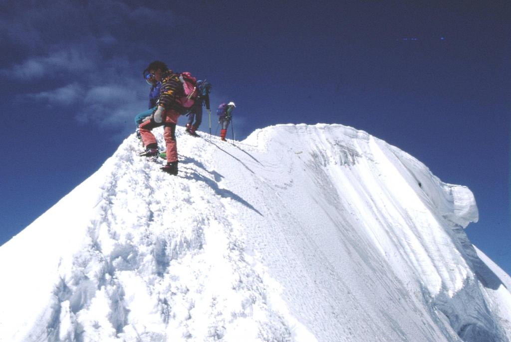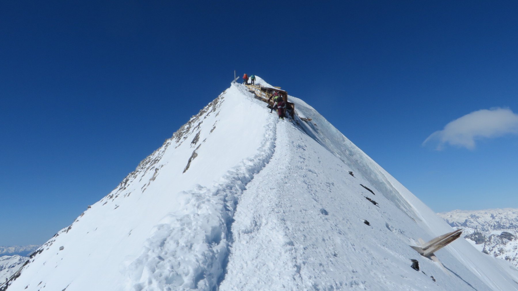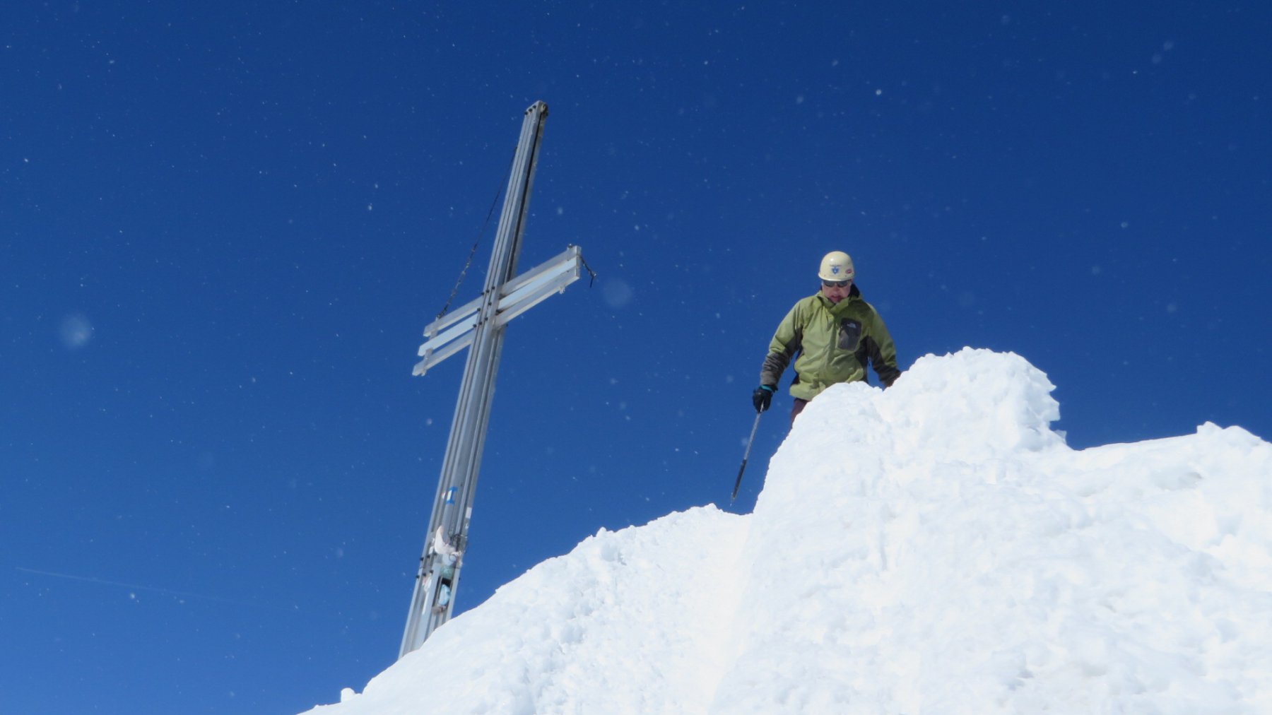 Da qui si sale il ripido pendio soprastante, fino ad aggirare a destra (E) il salto finale, pervenendo sull’affilata cresta a breve distanza dalla vetta.