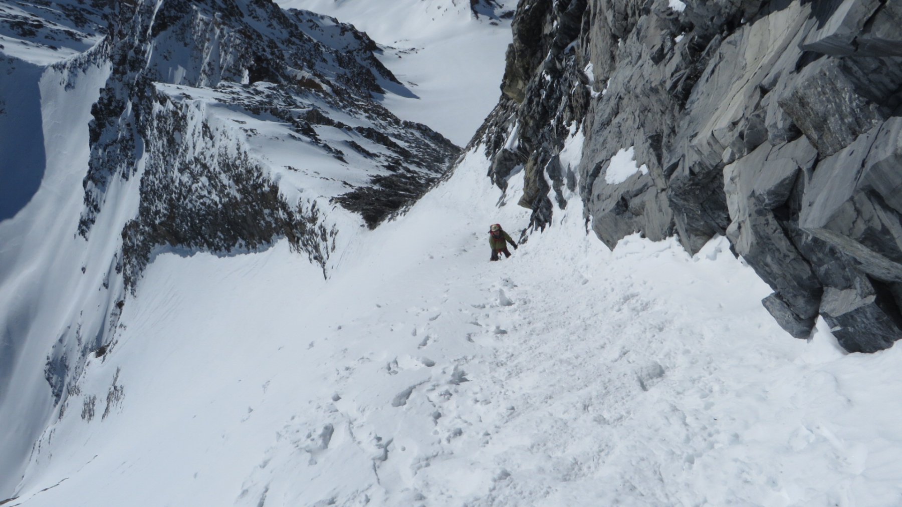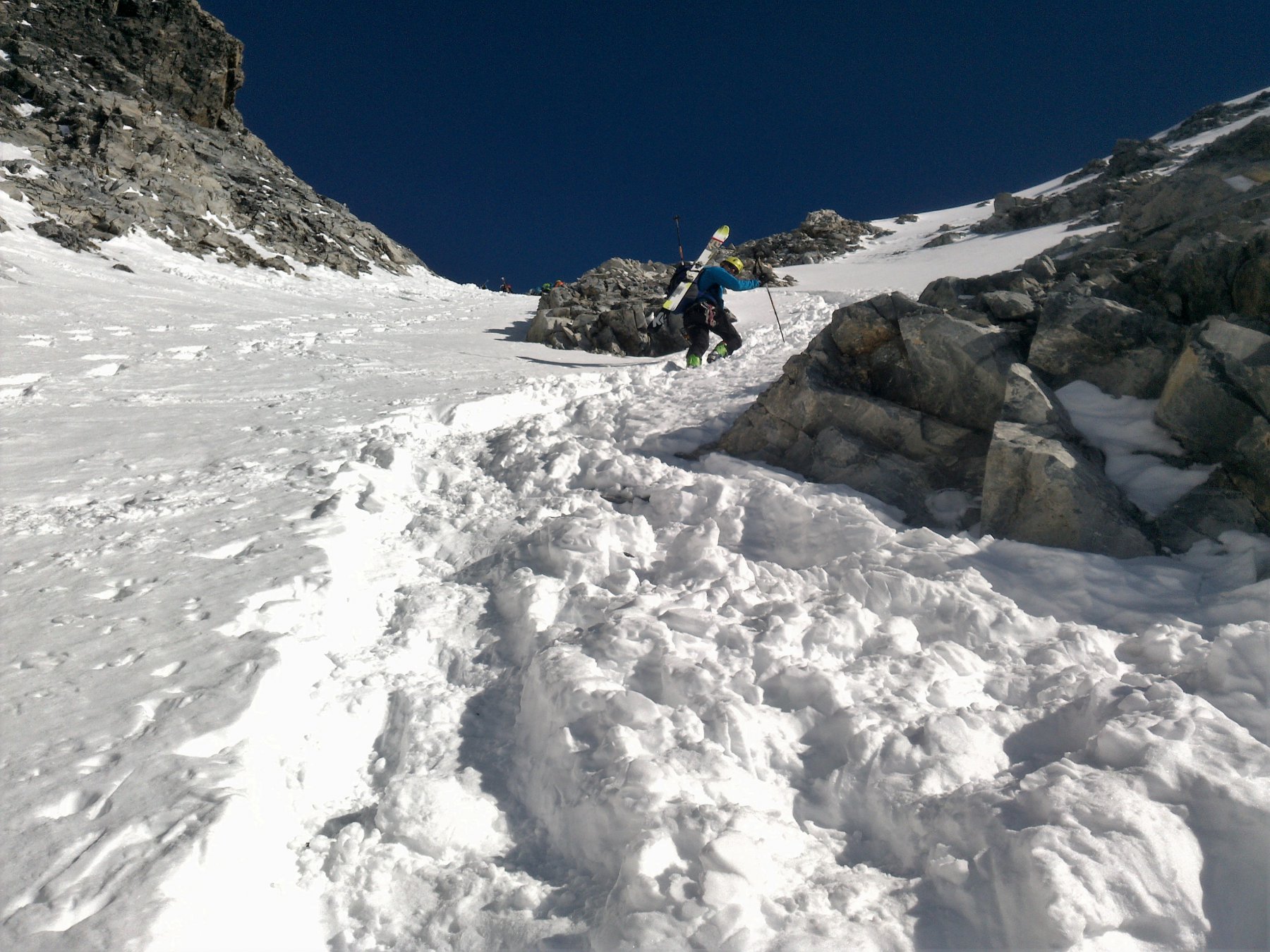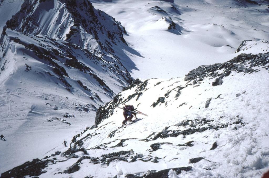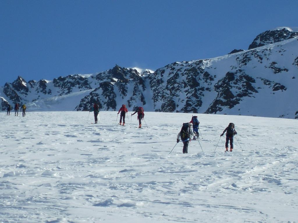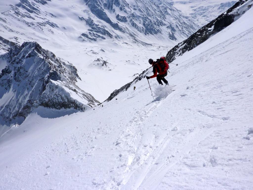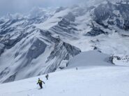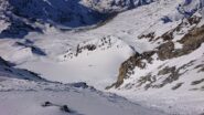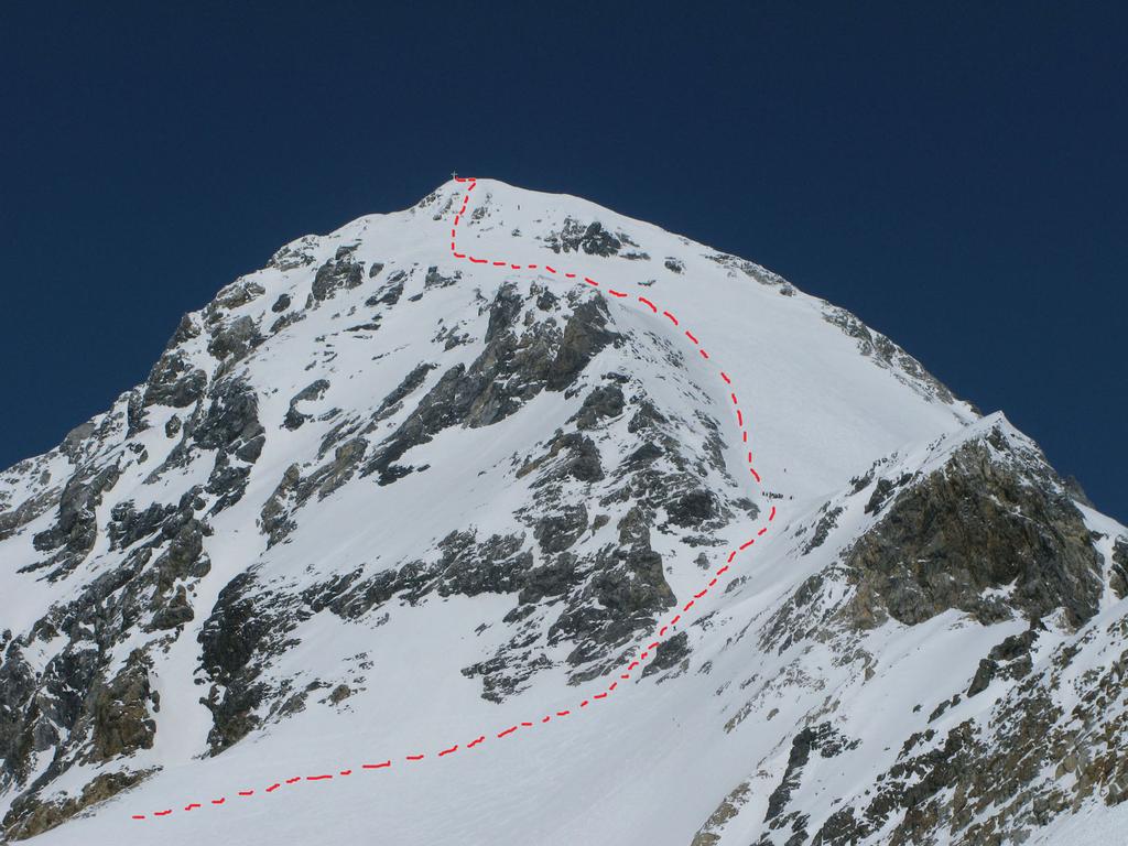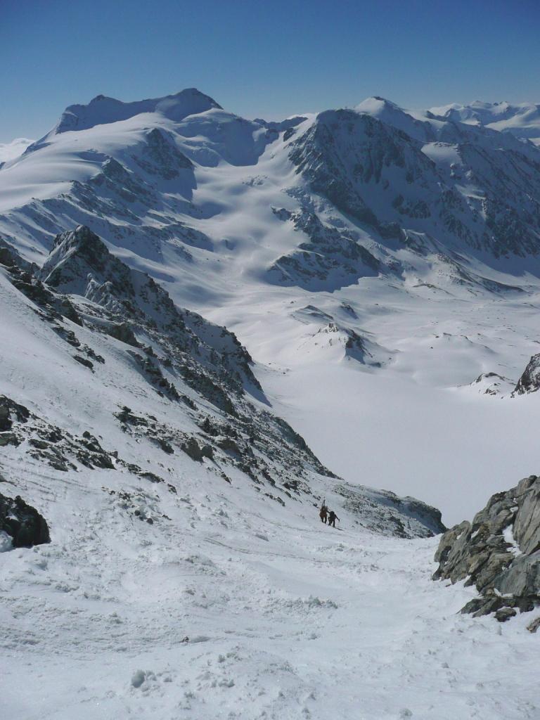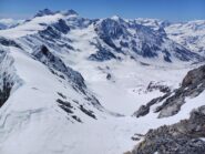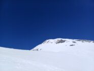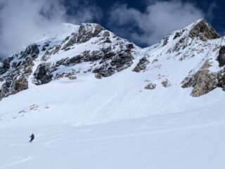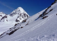 Da qui risalire gli ampi e dolci pendii in direzione N aggirando a ovest o a est a seconda delle condizioni l’isolotto roccioso che precede il canalino ripido che porta alla spalla quotata 3450 metri.