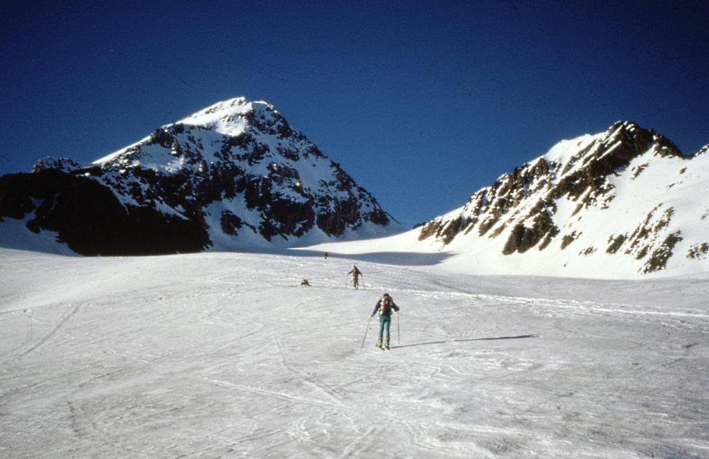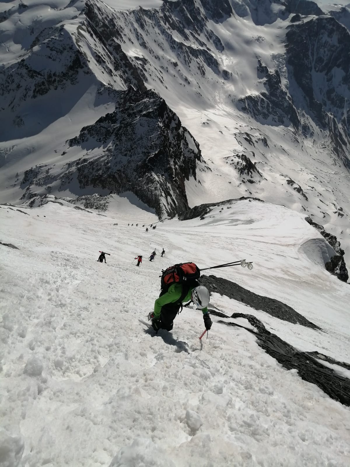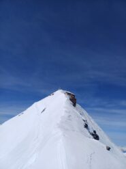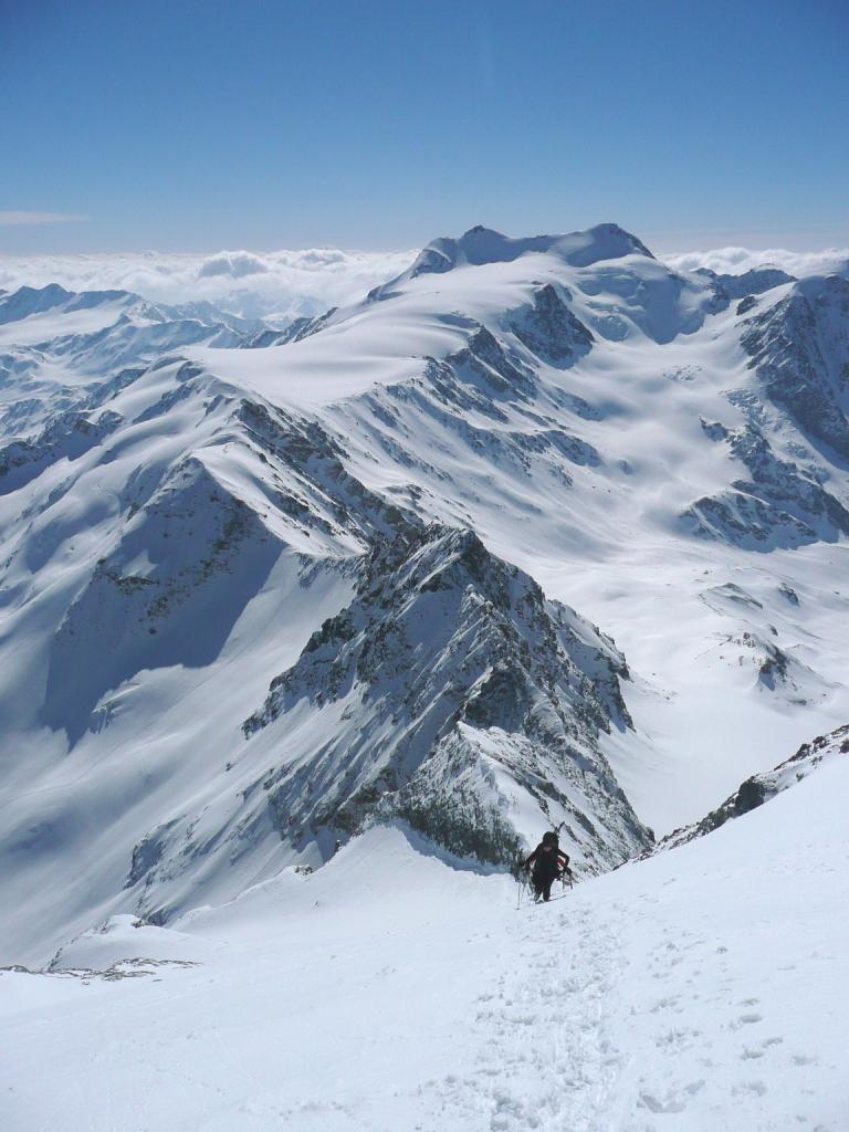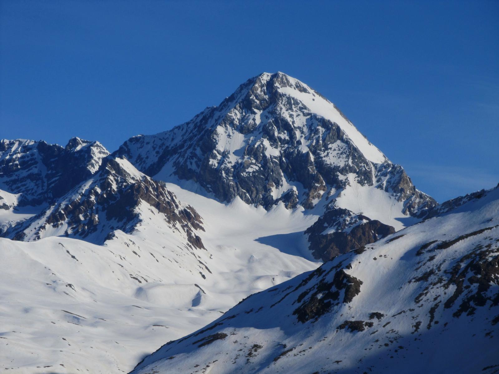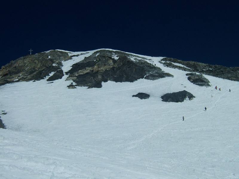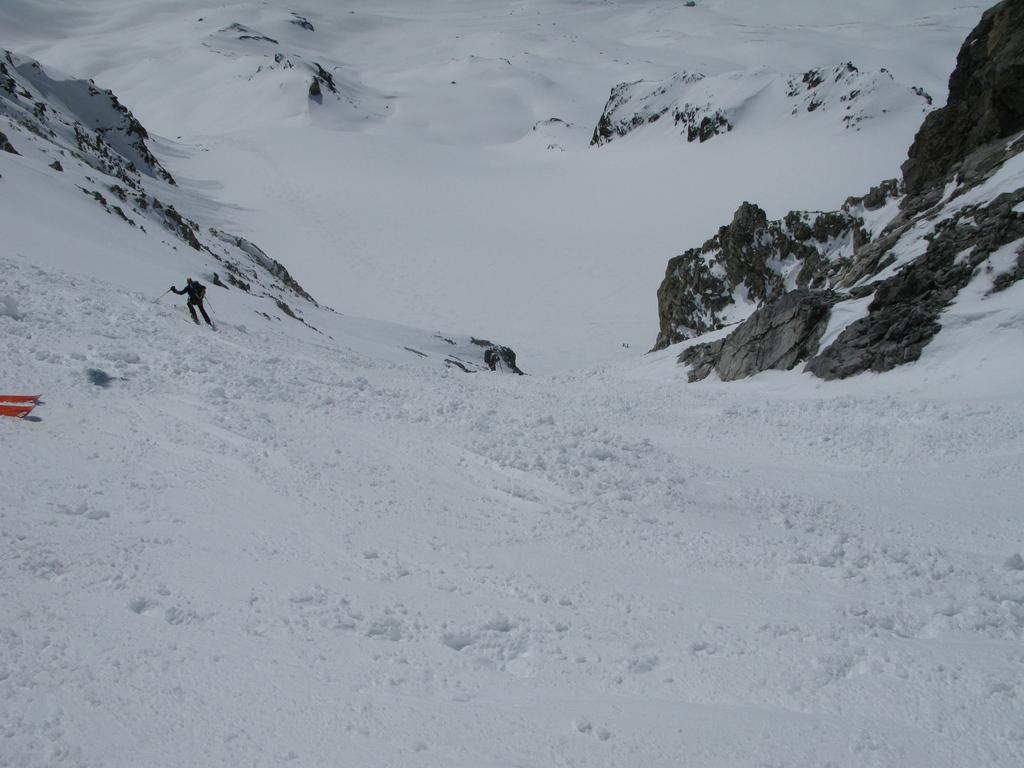 Da qui risalire gli ampi e dolci pendii in direzione N aggirando a ovest o a est a seconda delle condizioni l’isolotto roccioso che precede il canalino ripido che porta alla spalla quotata 3450 metri.