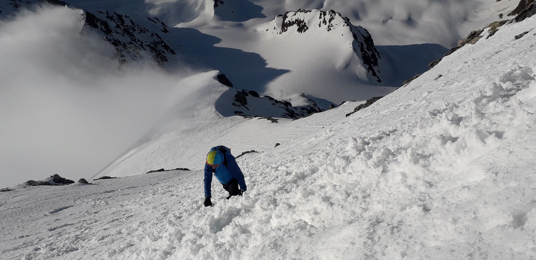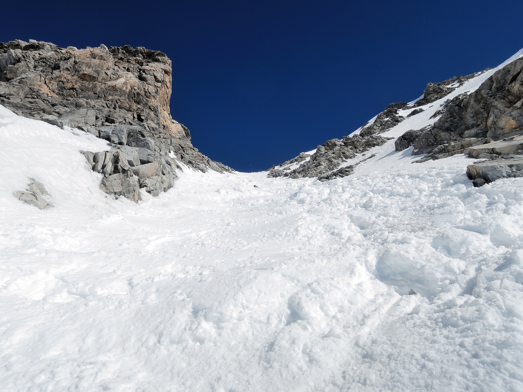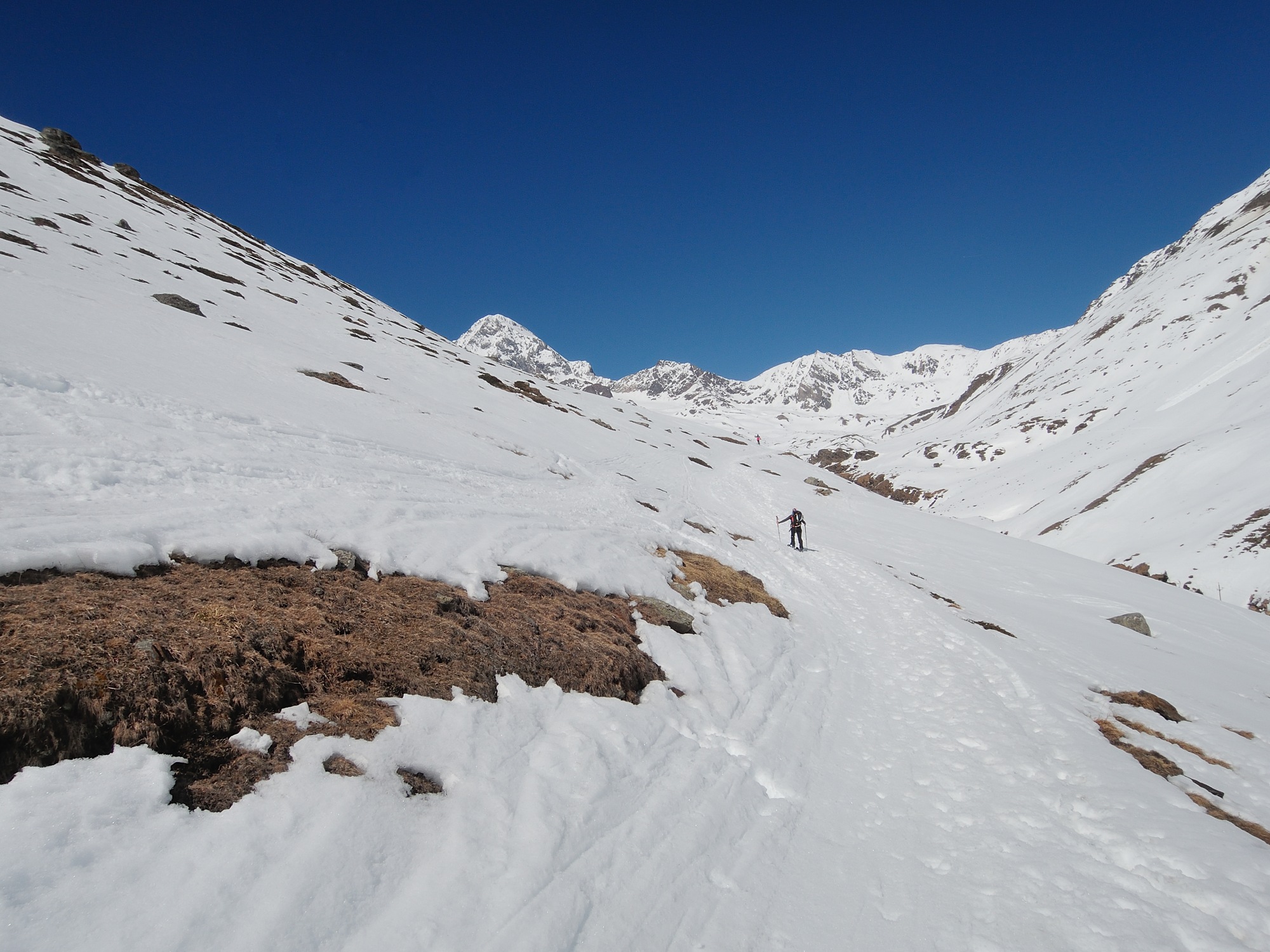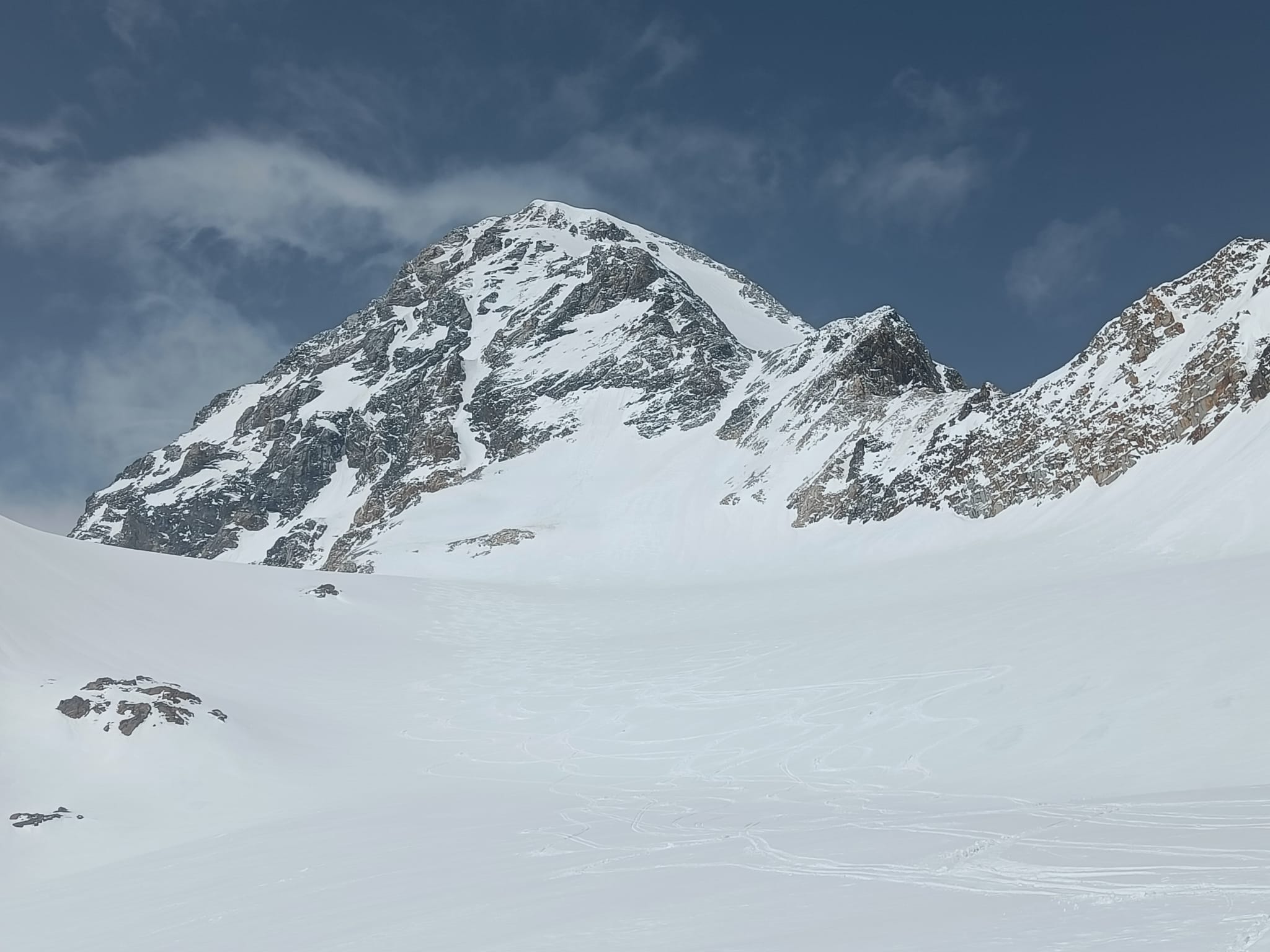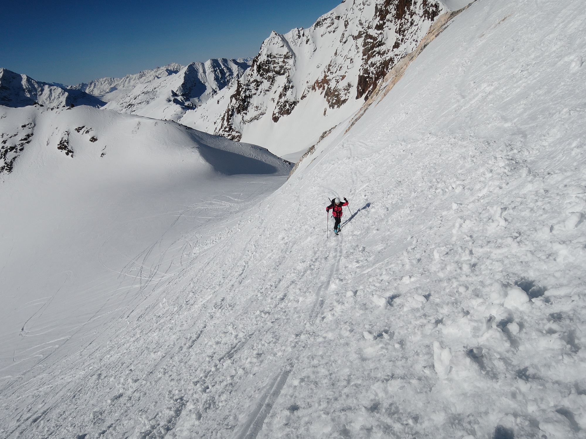 Da qui risalire gli ampi e dolci pendii in direzione N aggirando a ovest o a est a seconda delle condizioni l’isolotto roccioso che precede il canalino ripido che porta alla spalla quotata 3450 metri.