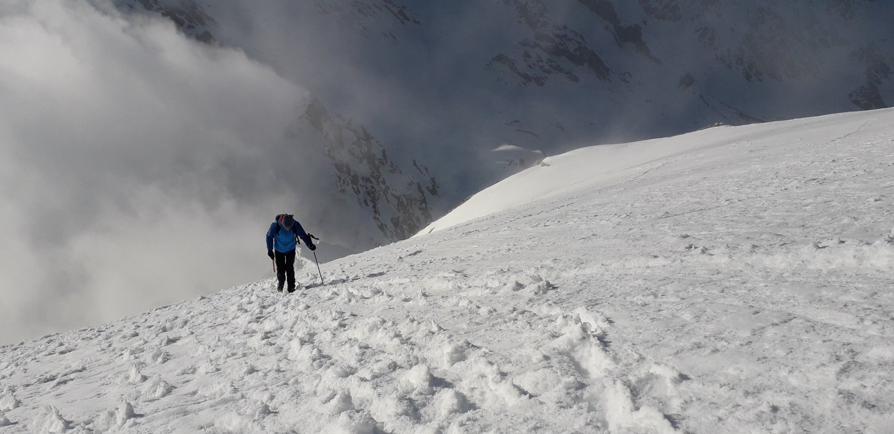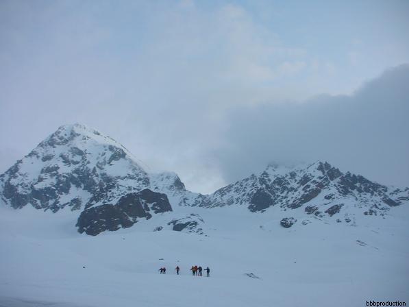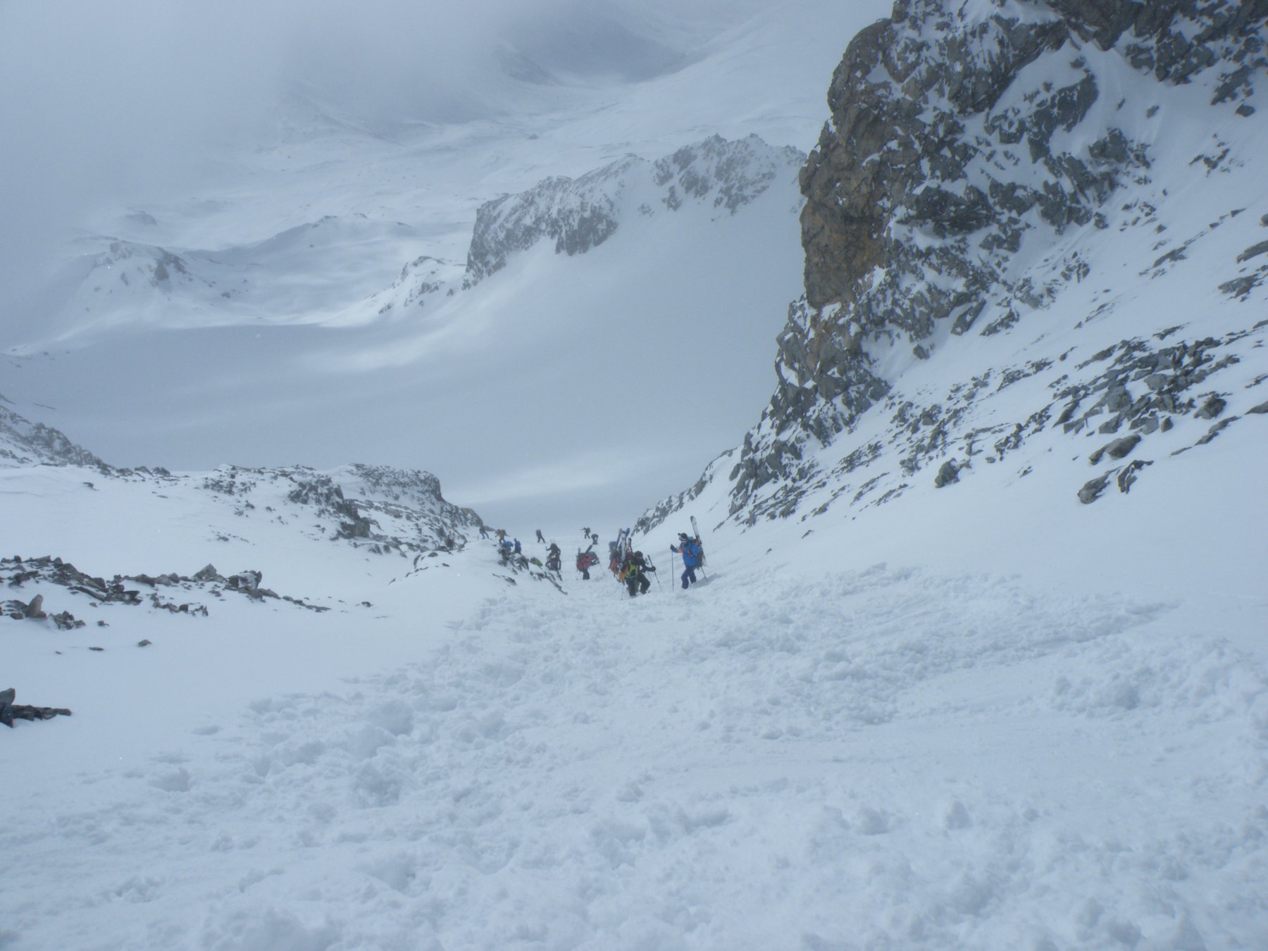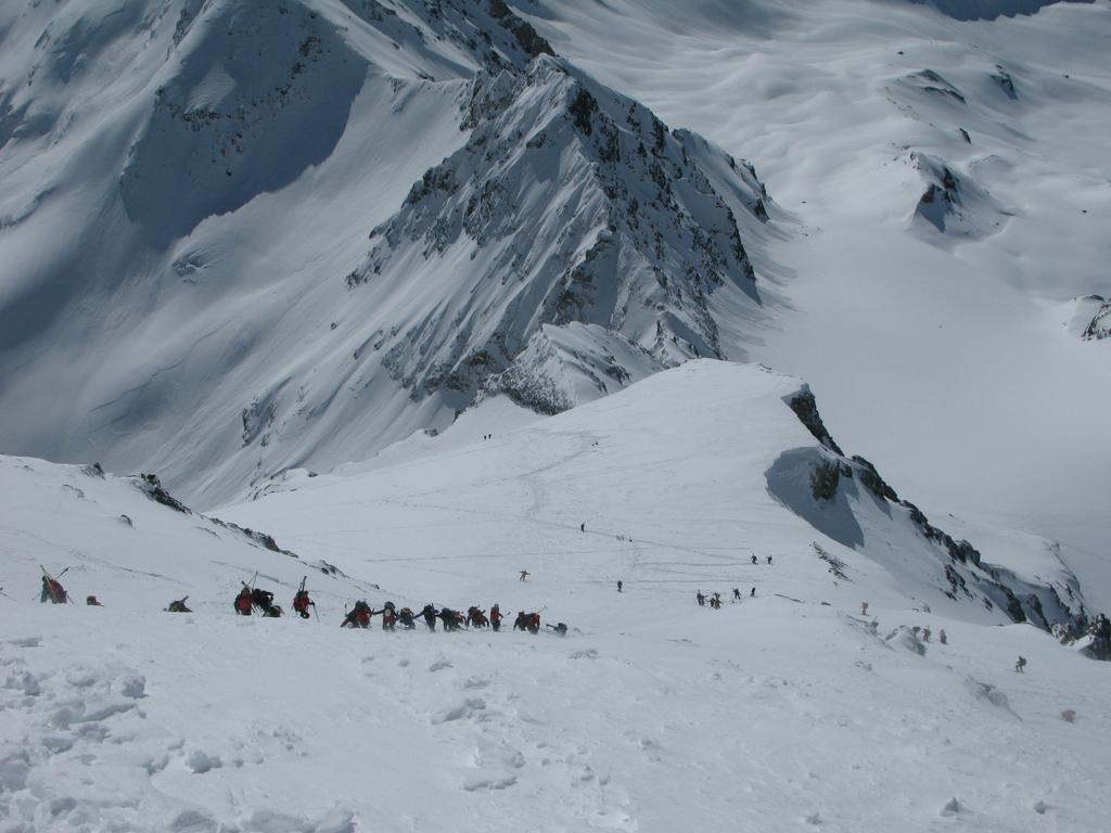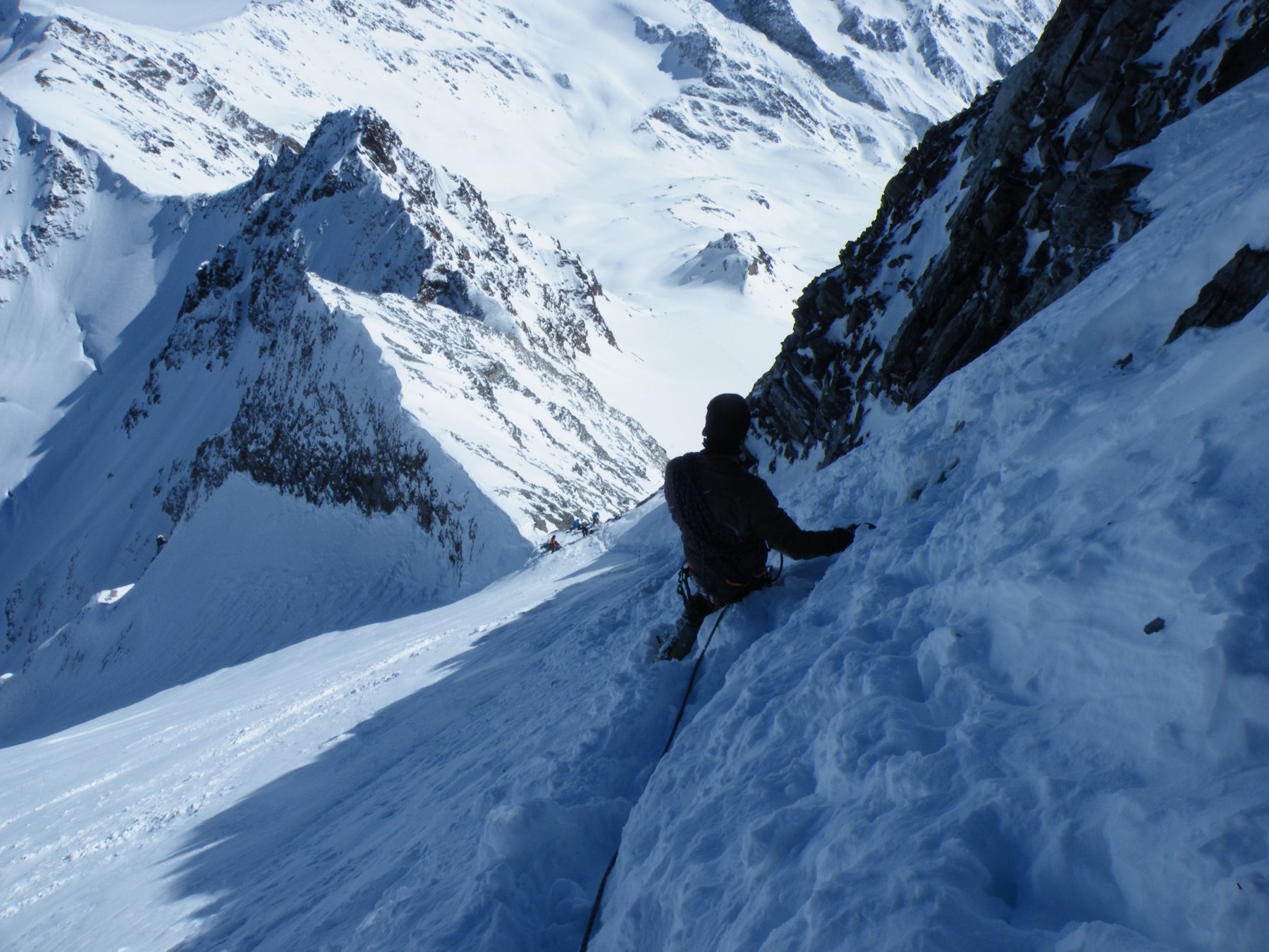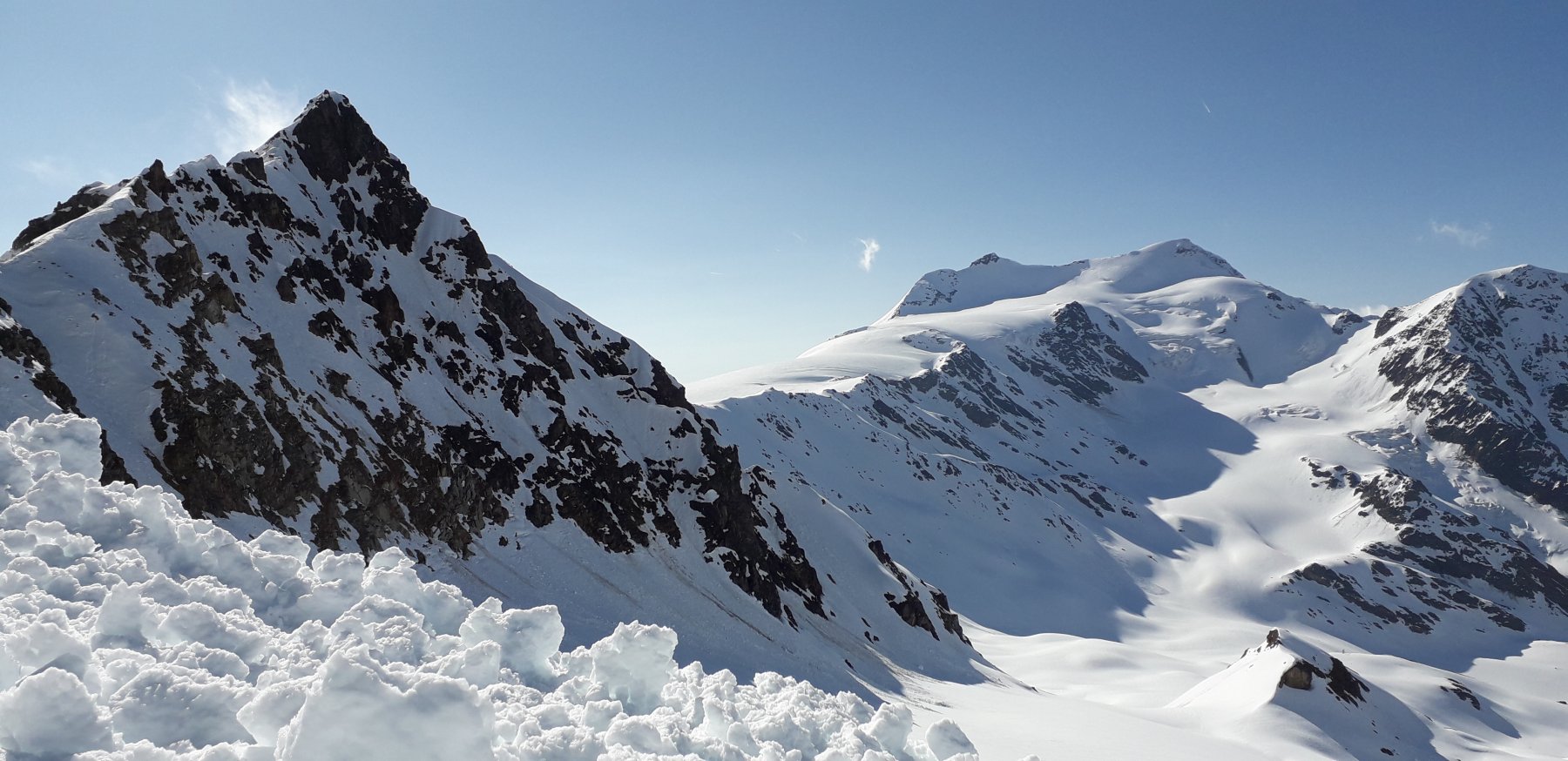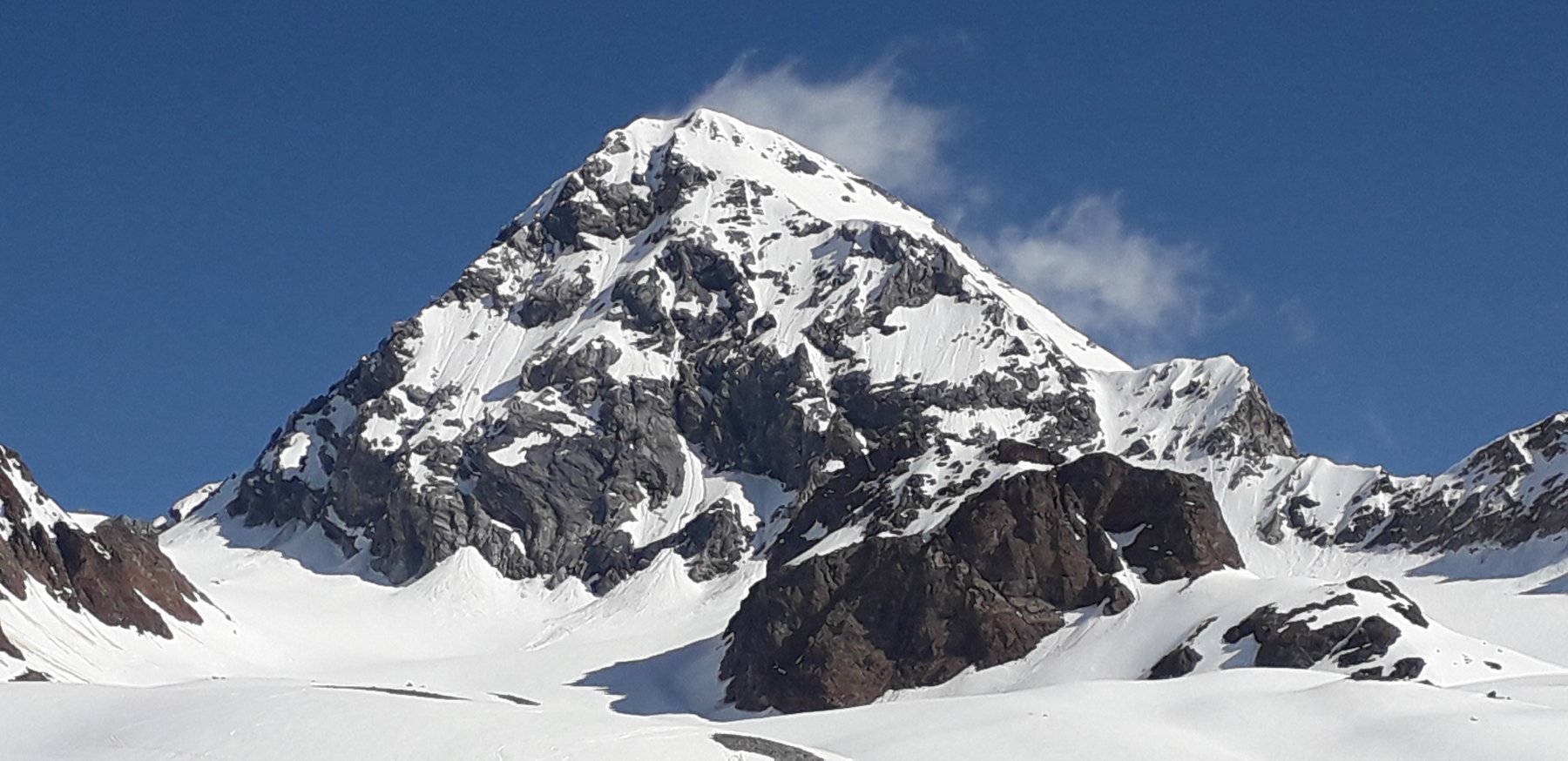Da qui risalire gli ampi e dolci pendii in direzione N aggirando a ovest o a est a seconda delle condizioni l’isolotto roccioso che precede il canalino ripido che porta alla spalla quotata 3450 metri.