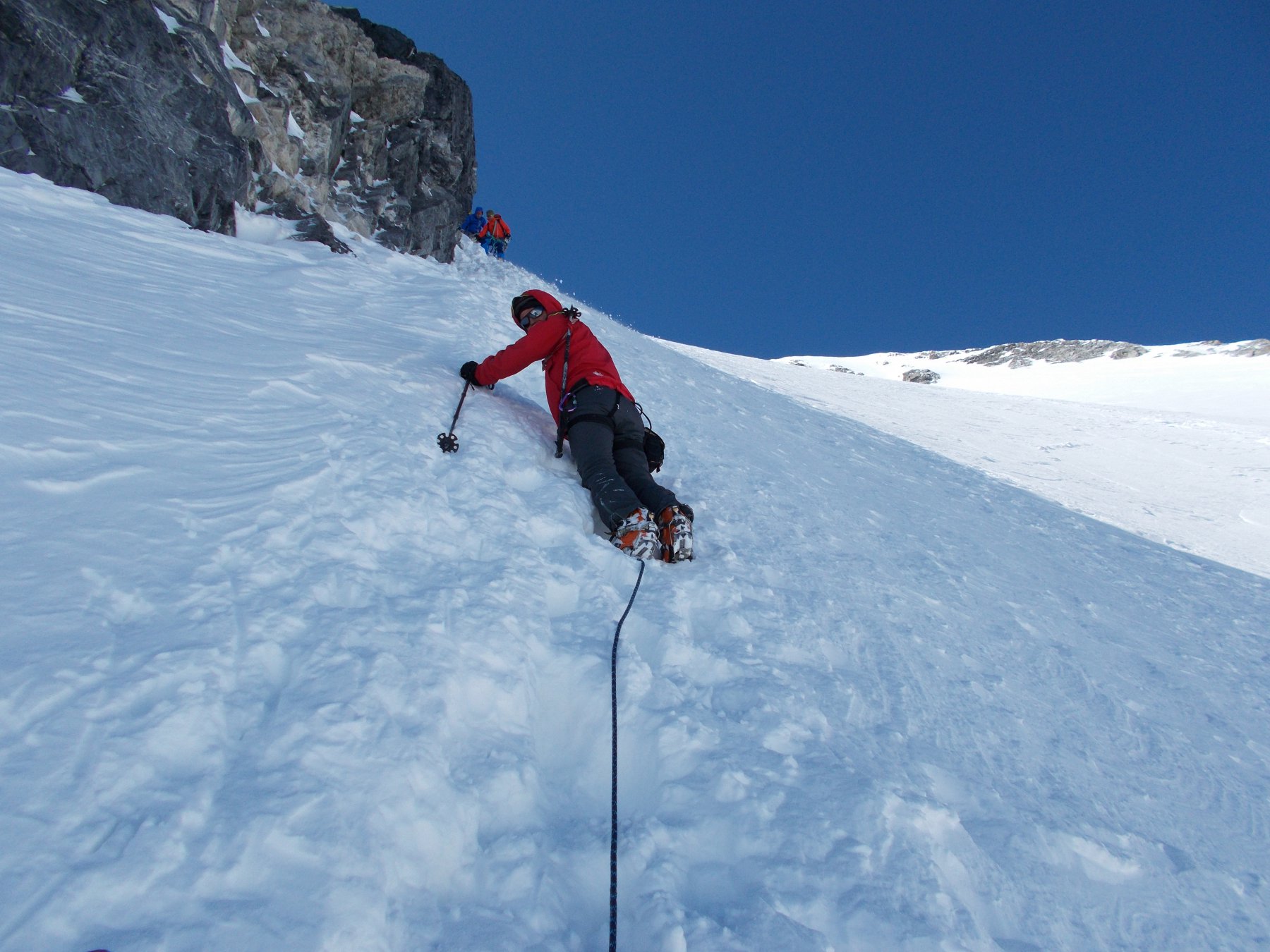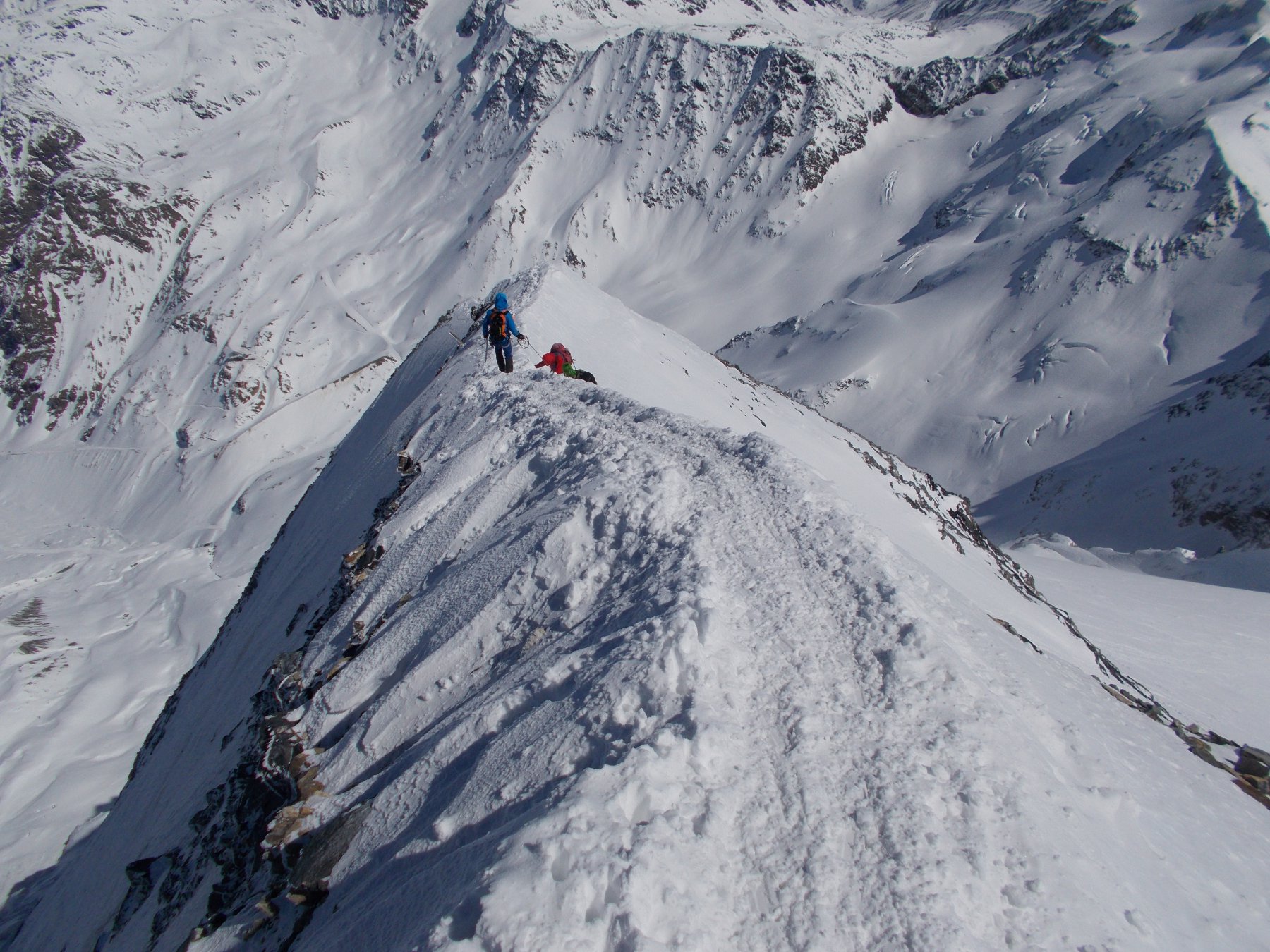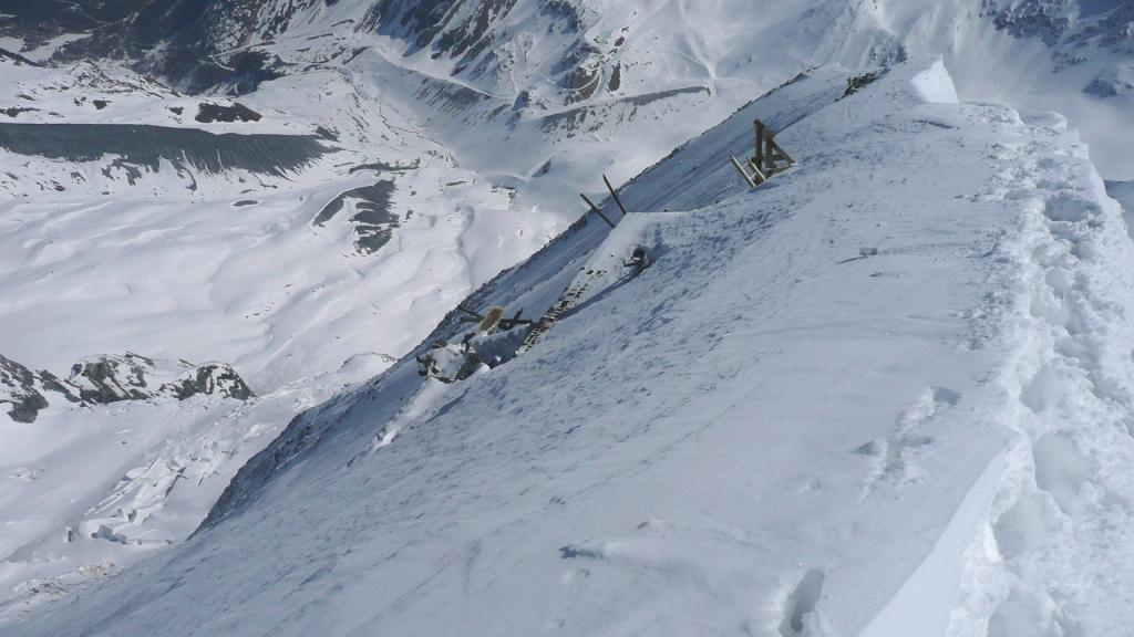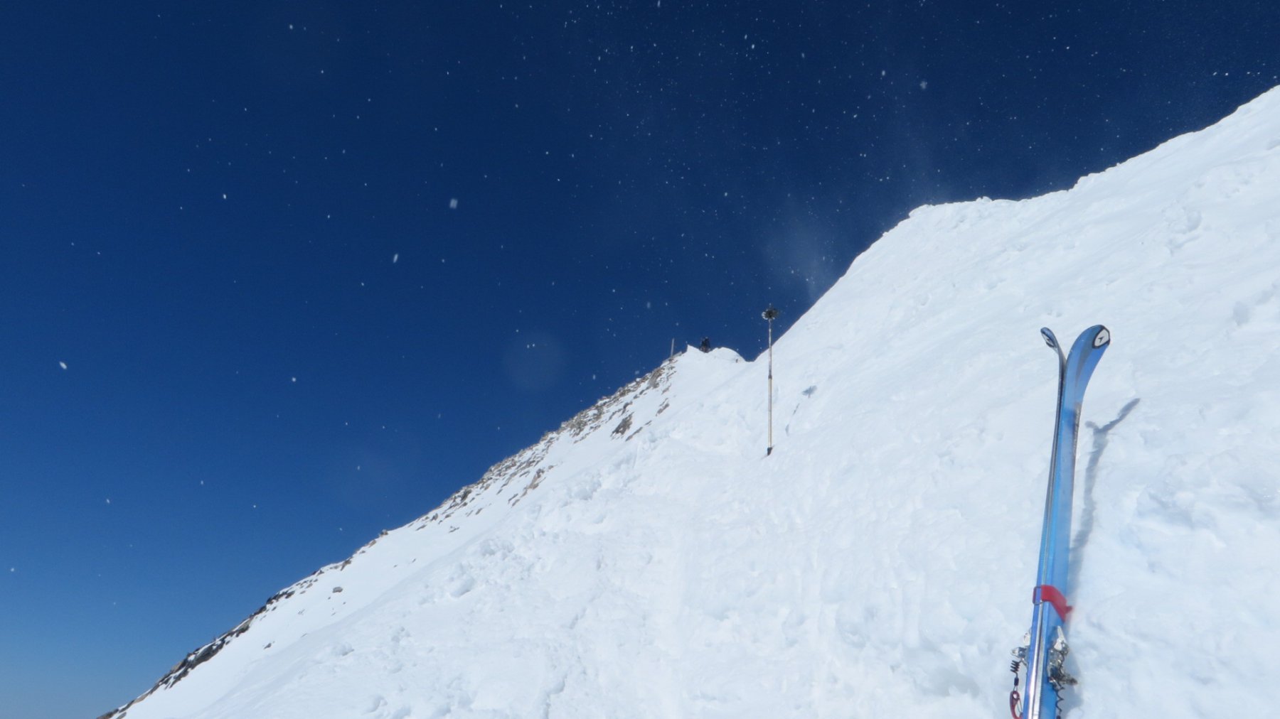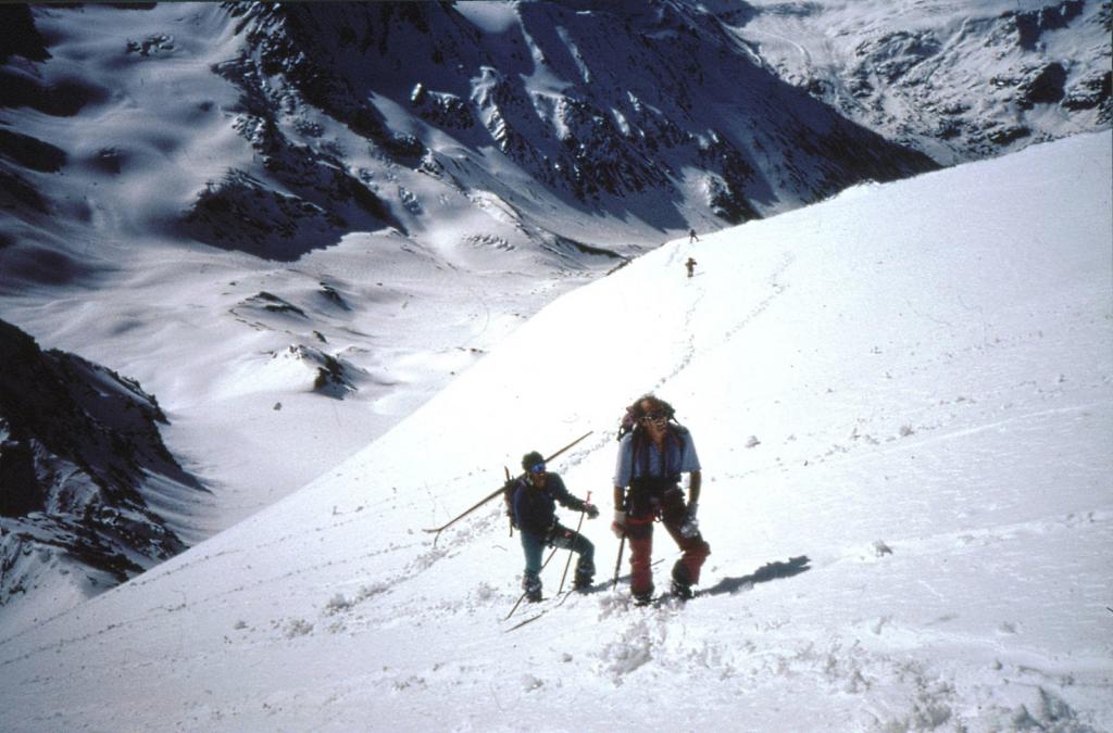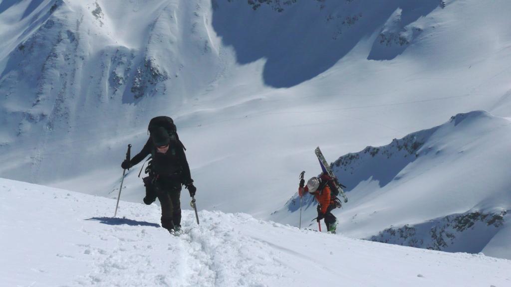 Da qui risalire gli ampi e dolci pendii in direzione N aggirando a ovest o a est a seconda delle condizioni l’isolotto roccioso che precede il canalino ripido che porta alla spalla quotata 3450 metri.