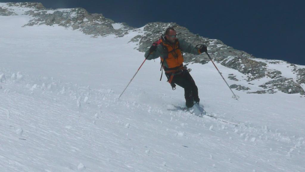 Nonostante la tenacia di Swiffer nel voler partire in ski dalla vetta, lo persuado a lasciar perdere: la spolveratina di fresca mal distribuita dal vento su fondo marmoreo irregolare nasconde insidiose placche di ghiaccio. Iniziamo così la discesa proprio sotto i canali sommitali su neve non troppo goduriosa per il fondo duro irregolare.
