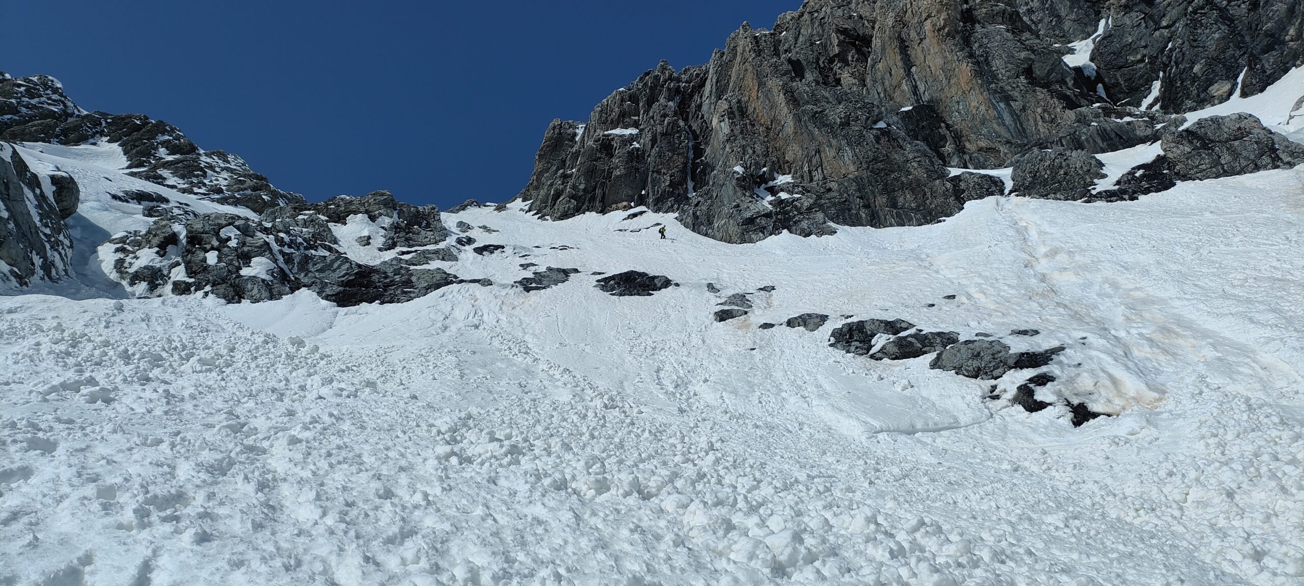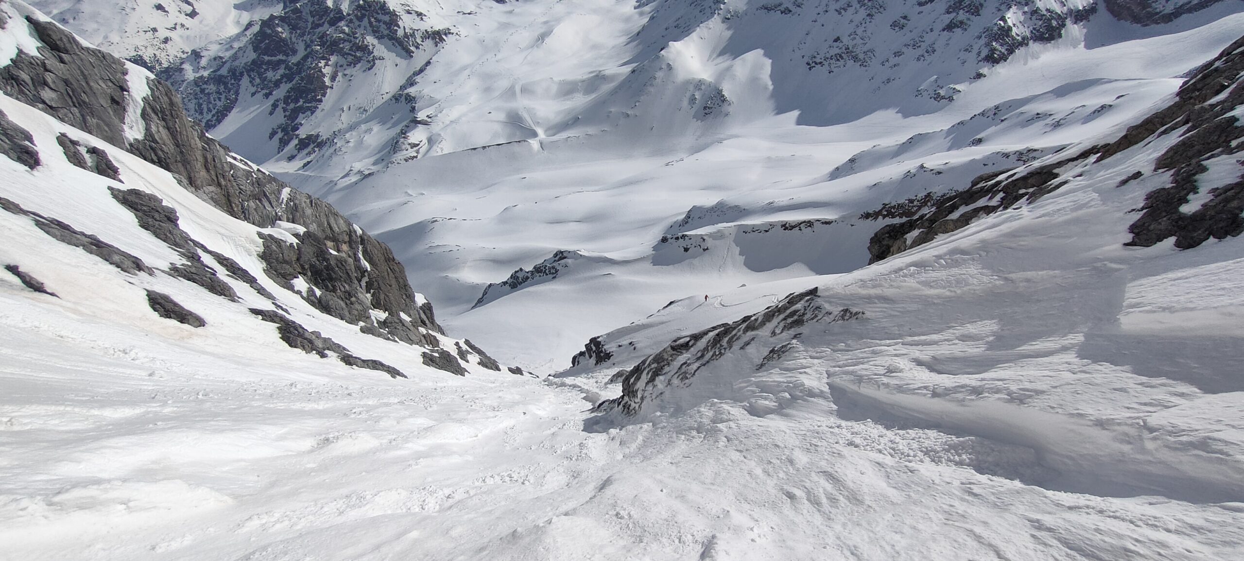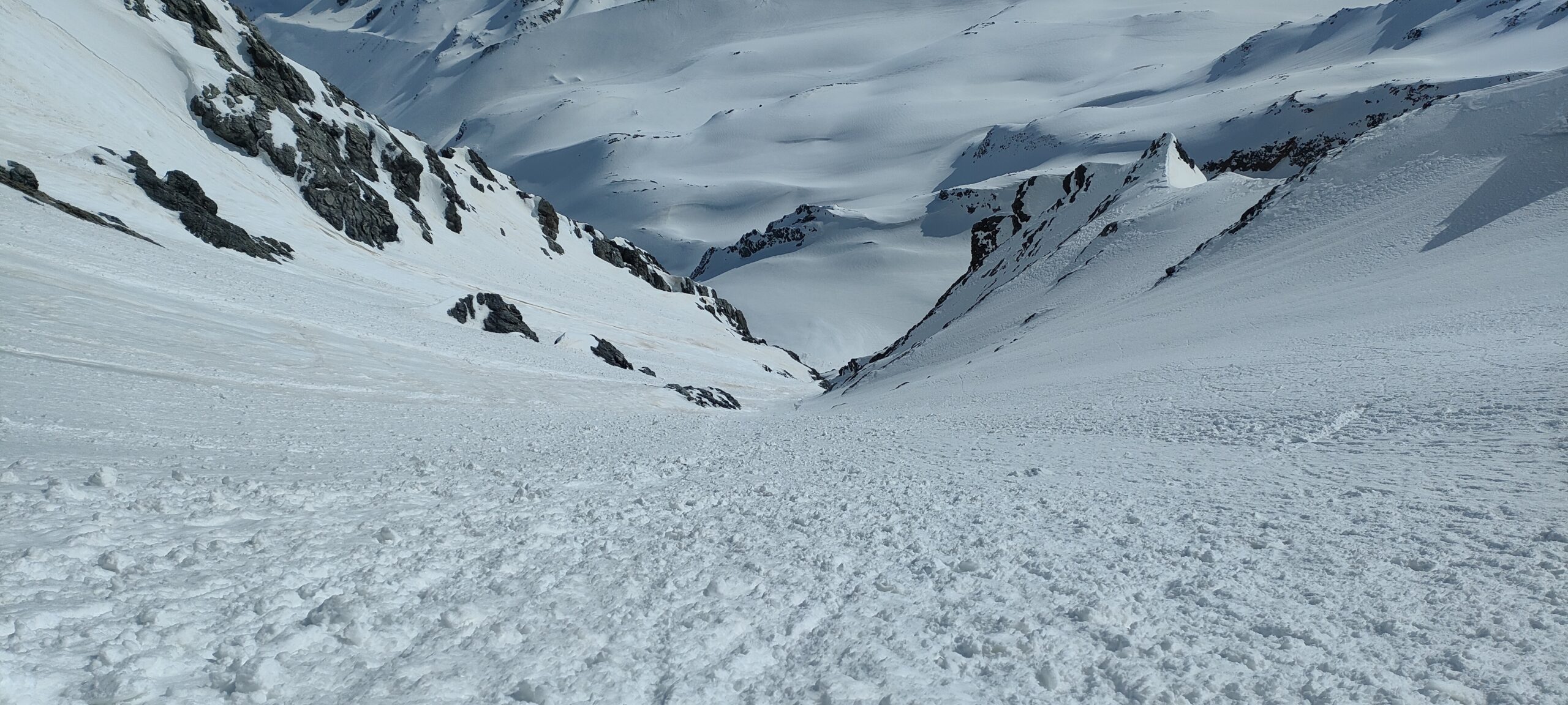 Dopo la parte più ripida la pala che con i suoi 40-45° consente di rilassarsi. Arrivati al collo di bottiglia si piega a sx e si scende dalla via di salita. Considerare che arrivati al collo di bottiglia siete a 1/3 della discesa. Il canale continua sui 45° e presenta nella parte finale tratti a 50/55°.
