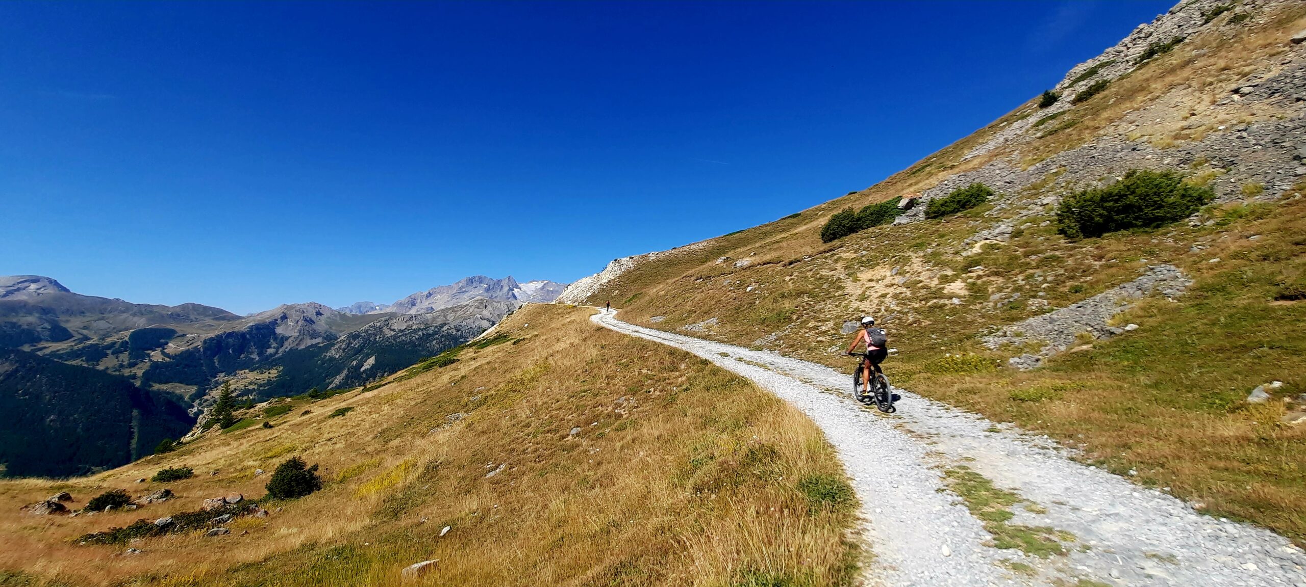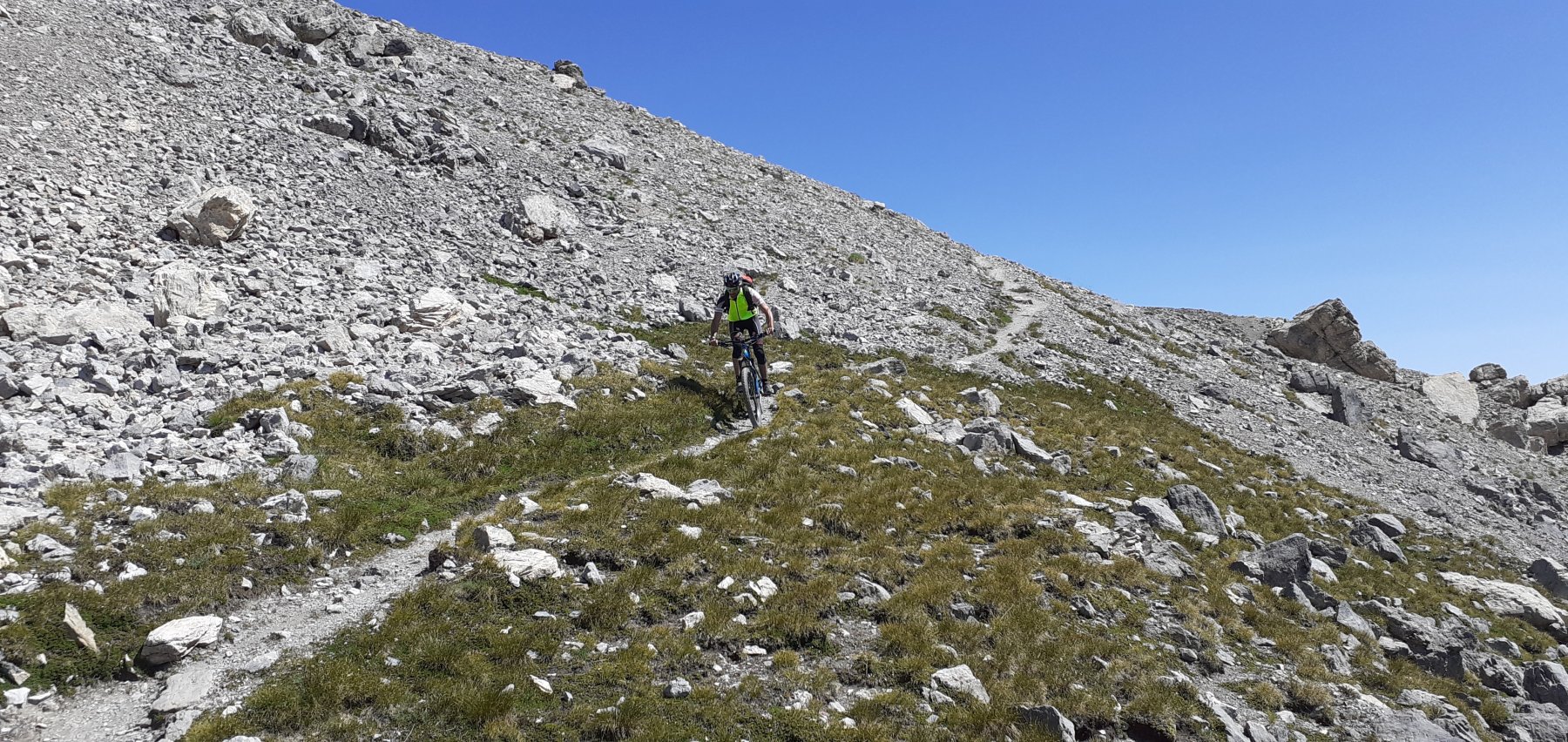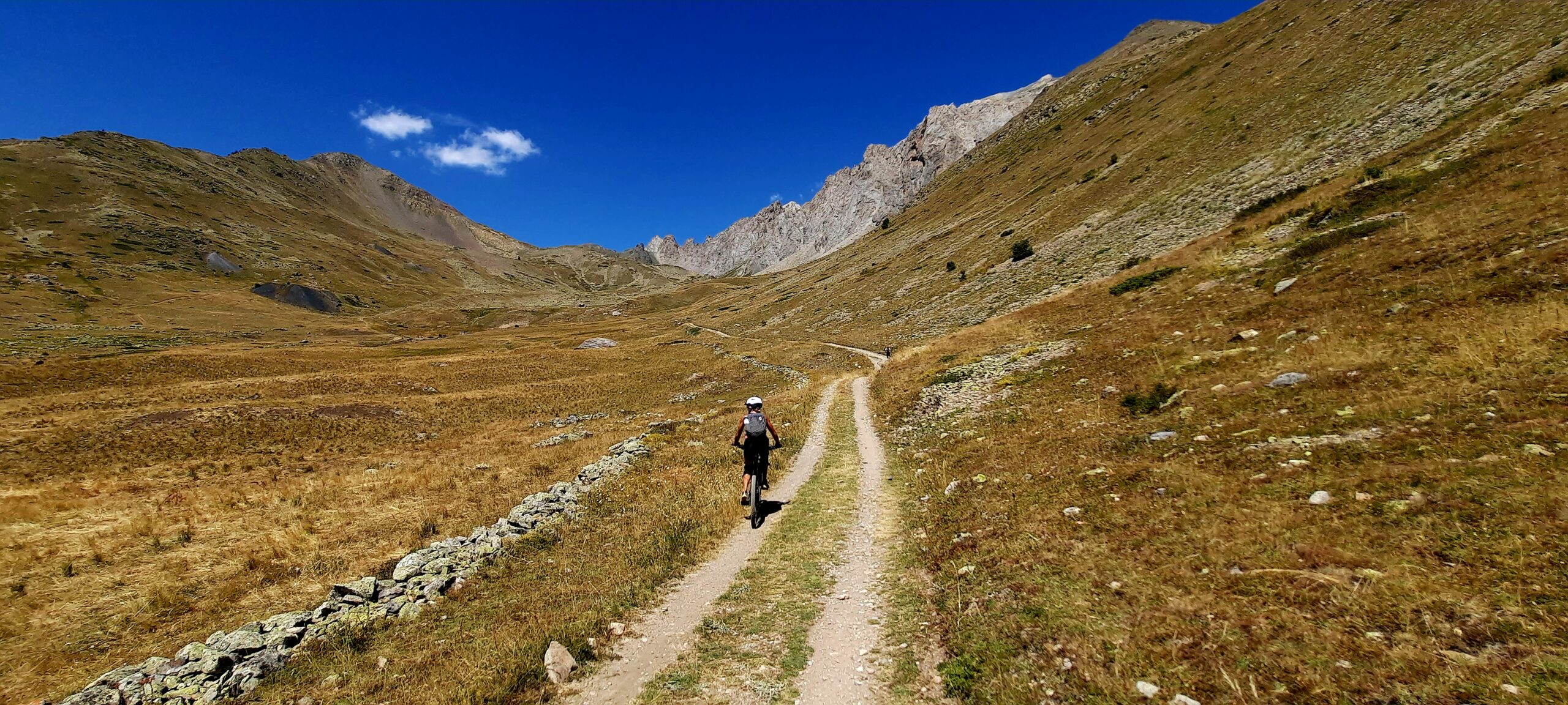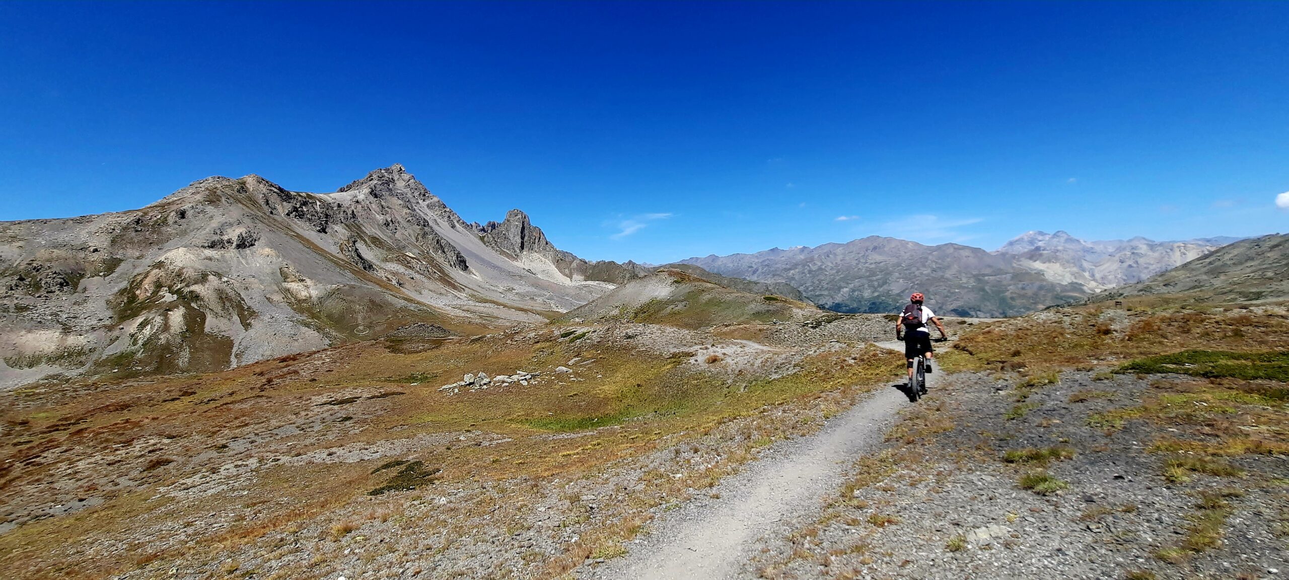 Alla prima curva quando la strada comincia a scendere,prendere lo sterrato di dx (balise Porte de Cristol) e seguirla fino a quota 2487 (balise Pointe Cot) dove si comincia a scendere sulla sx prima su sterrato molto sconnesso e poi su sentiero divertente fino a raggiungere il bivio a quota 2180 (balise Sous le Petit Arèa,circa 30 km fino a qui).