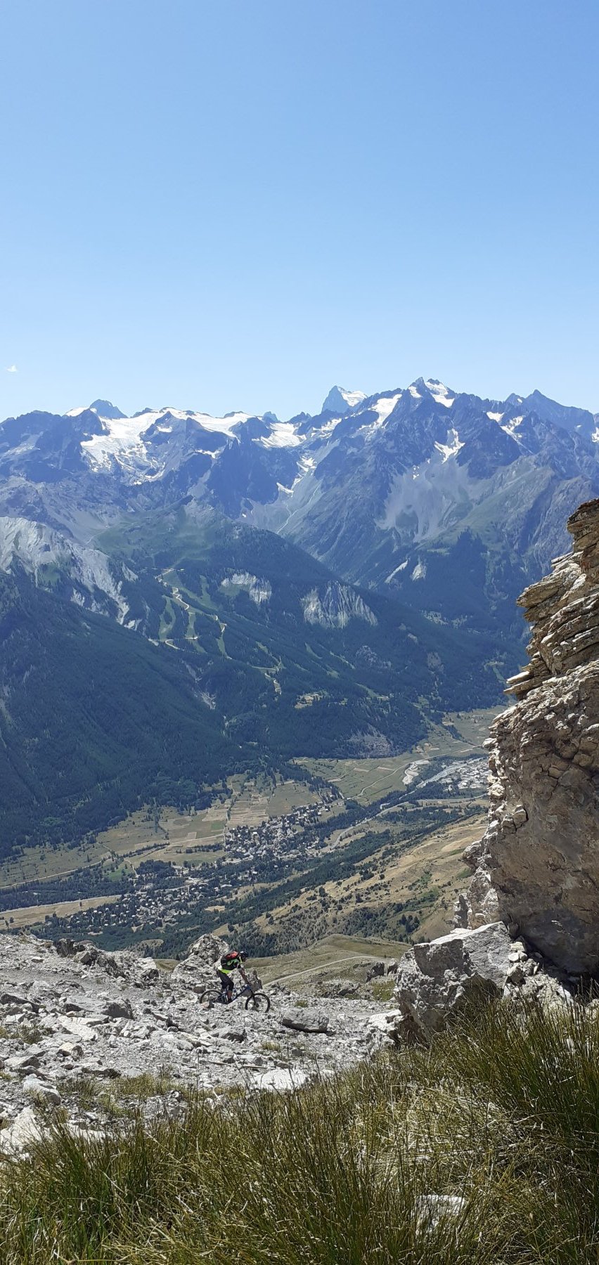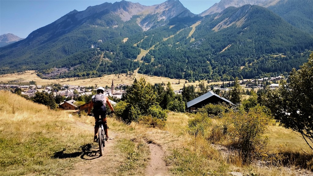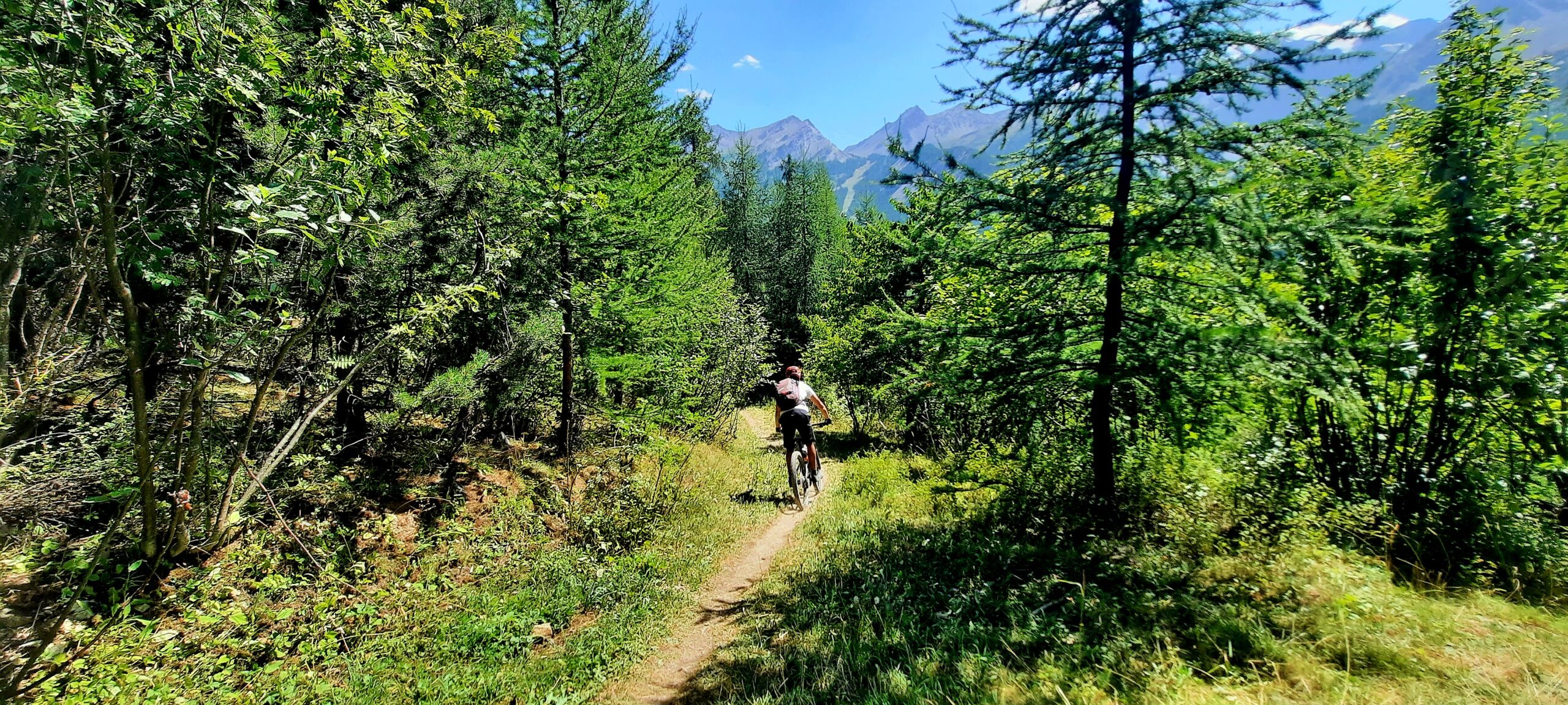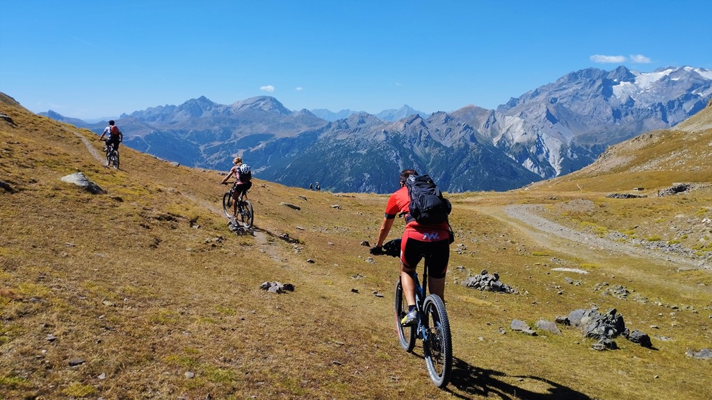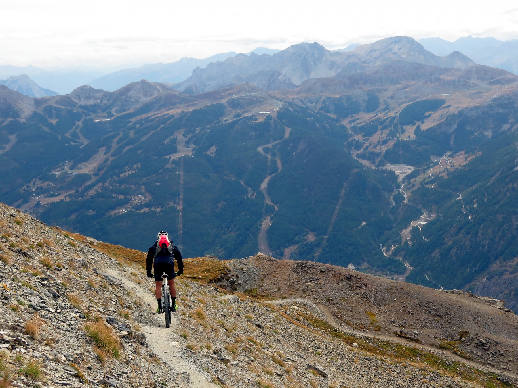 Alla prima curva quando la strada comincia a scendere,prendere lo sterrato di dx (balise Porte de Cristol) e seguirla fino a quota 2487 (balise Pointe Cot) dove si comincia a scendere sulla sx prima su sterrato molto sconnesso e poi su sentiero divertente fino a raggiungere il bivio a quota 2180 (balise Sous le Petit Arèa,circa 30 km fino a qui).