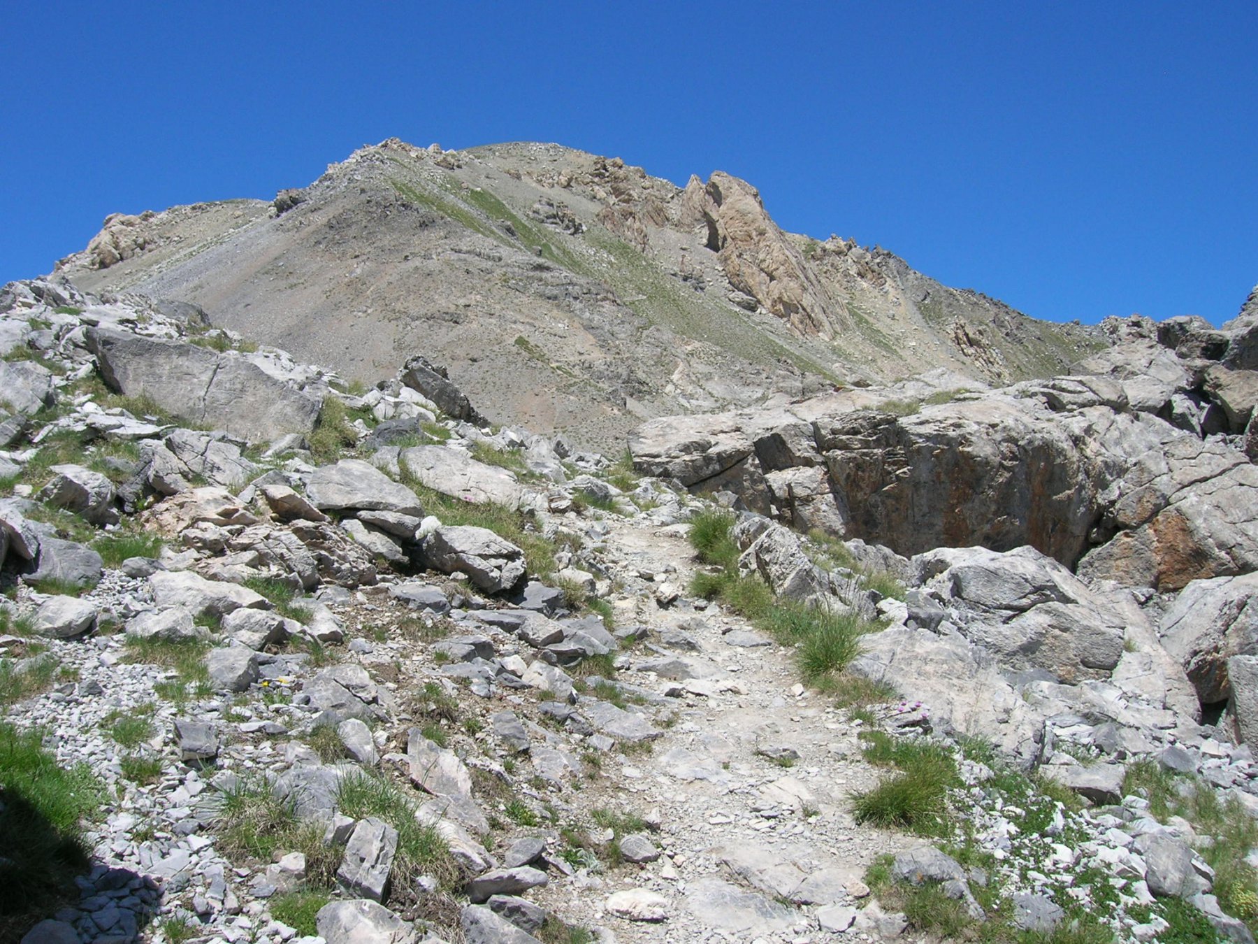 Giunti ad un bivio a quota 2307 m (balise Route Militaire) svoltare a sx e con un lunghissimo traverso raggiungere il Col du Granon 2413 m.