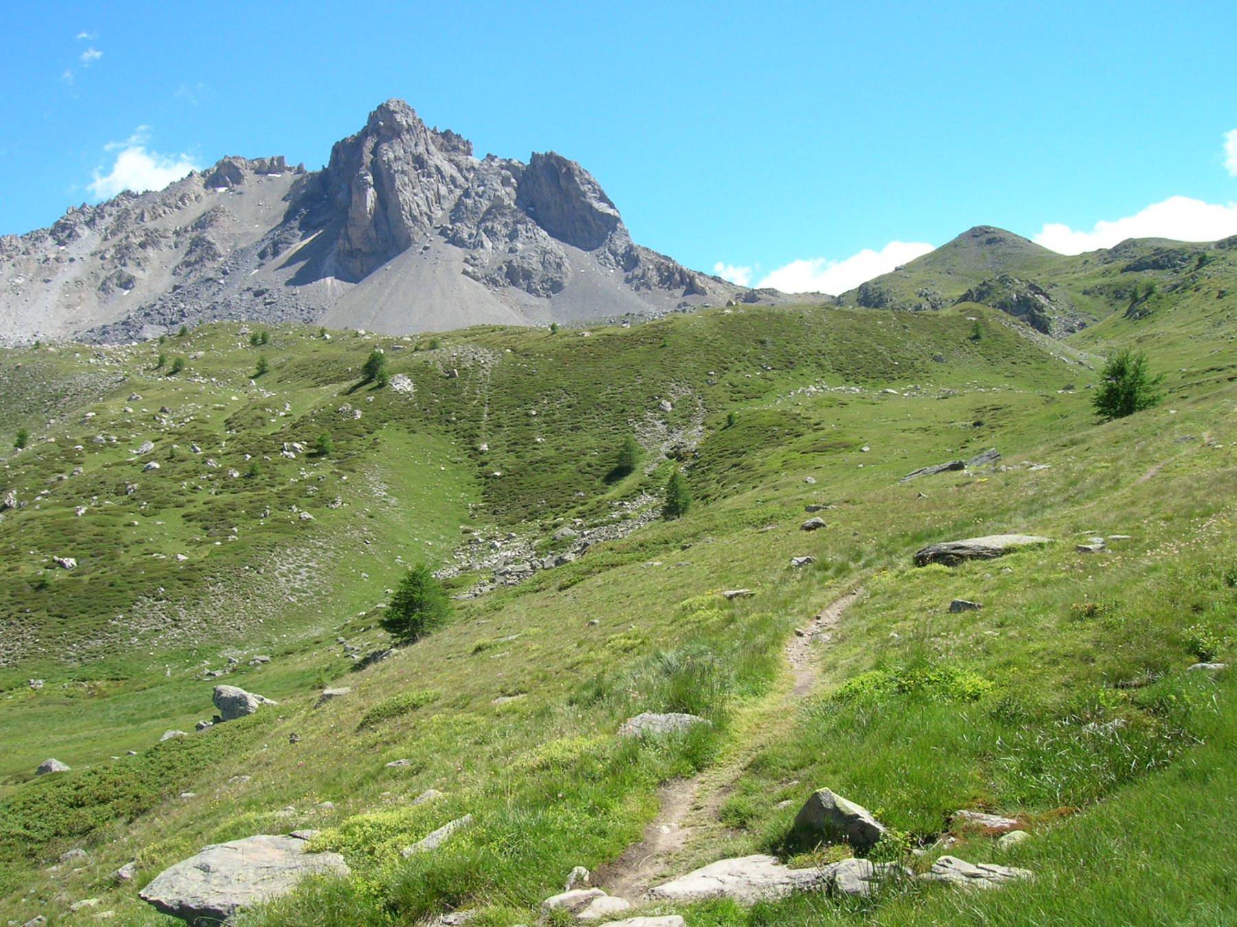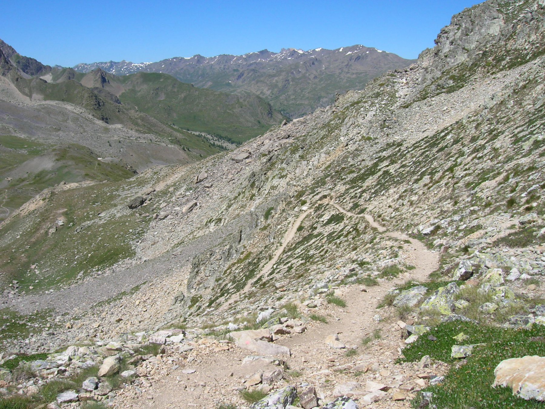 Giunti al bivio a quota 1820 circa svoltare a dx (balise x Nevache) e seguire il sentiero a tratti tecnico (S2max) che con alcuni saliscendi riporta al park di Nevache
